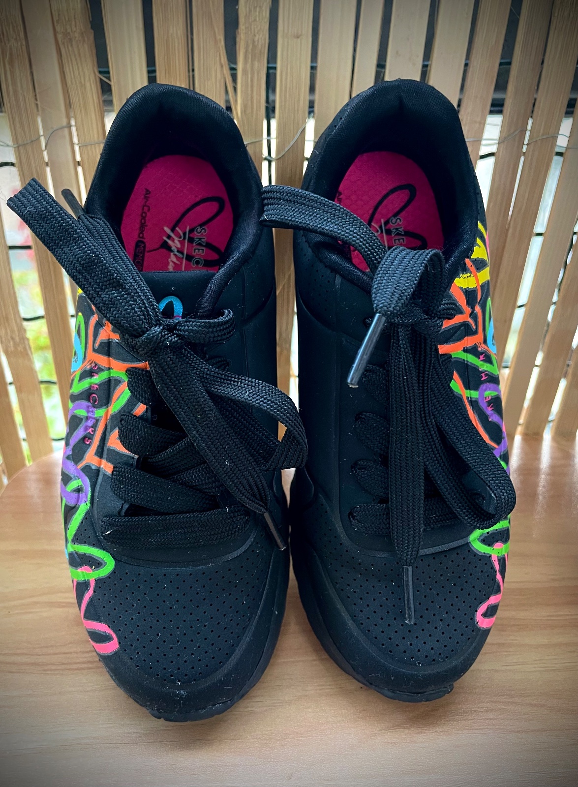 Originálne čierne sneakersy značky Skechers s ikonickými farebnými srdiečkami. Tenisky sú vo veľmi dobrom stave, párkrát vzaté. Zakúpené v kamennej predajni športovej obuvi, opraté a očistené.