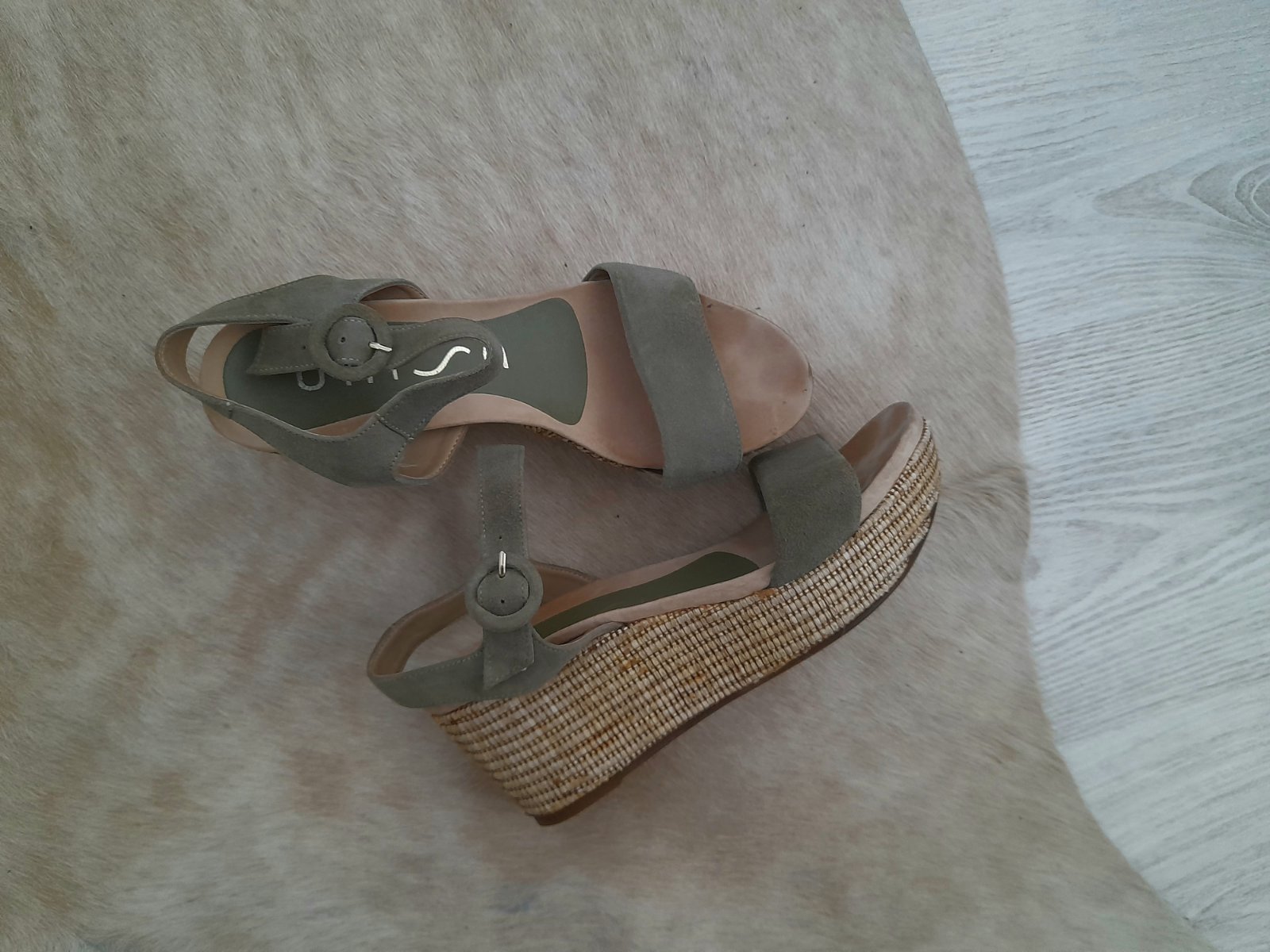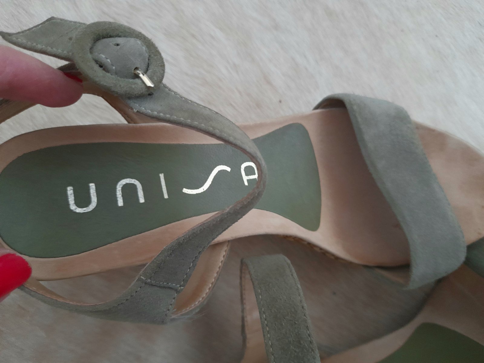 Krásne tmavoolivové látkové sandálky zn. ASOS so zipsom vpredu, výrazným tmavohnedým hrubým opätkom/v:10cm/. Dl:24,5 cm, š dole max 8cm, v látky vpredu:9cm. Na päte už nalepené silikónové podložky.