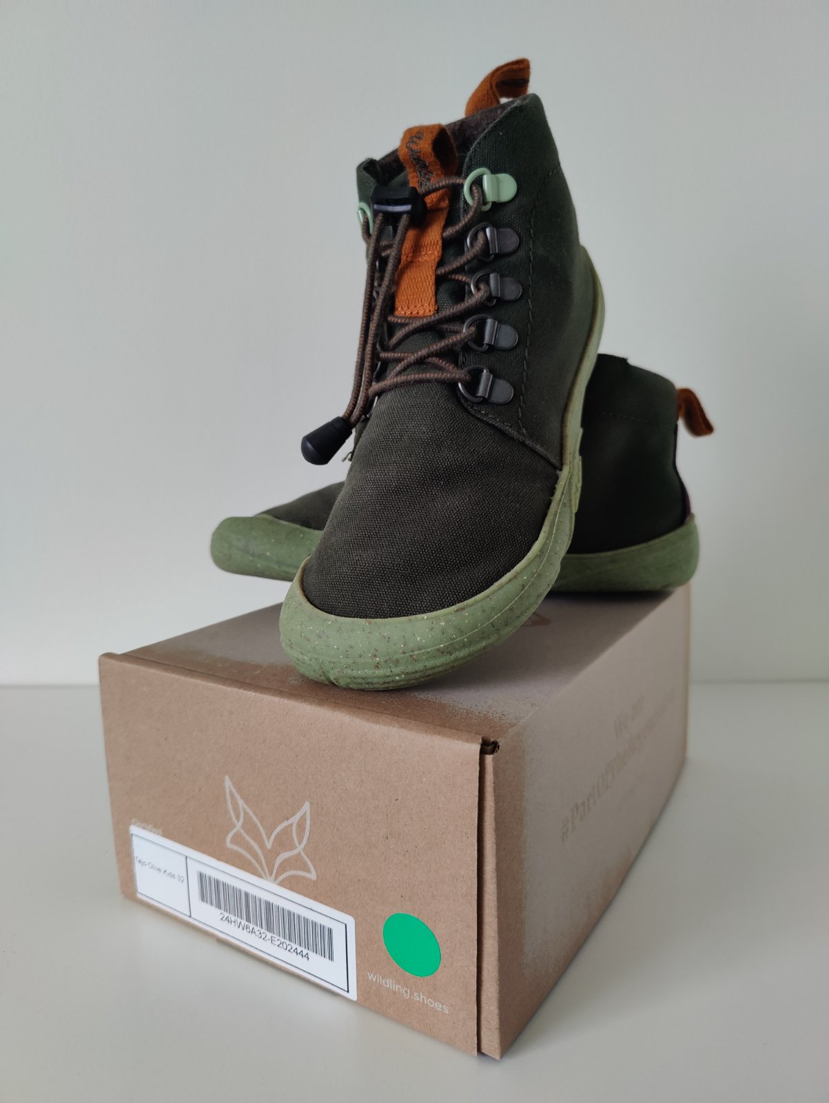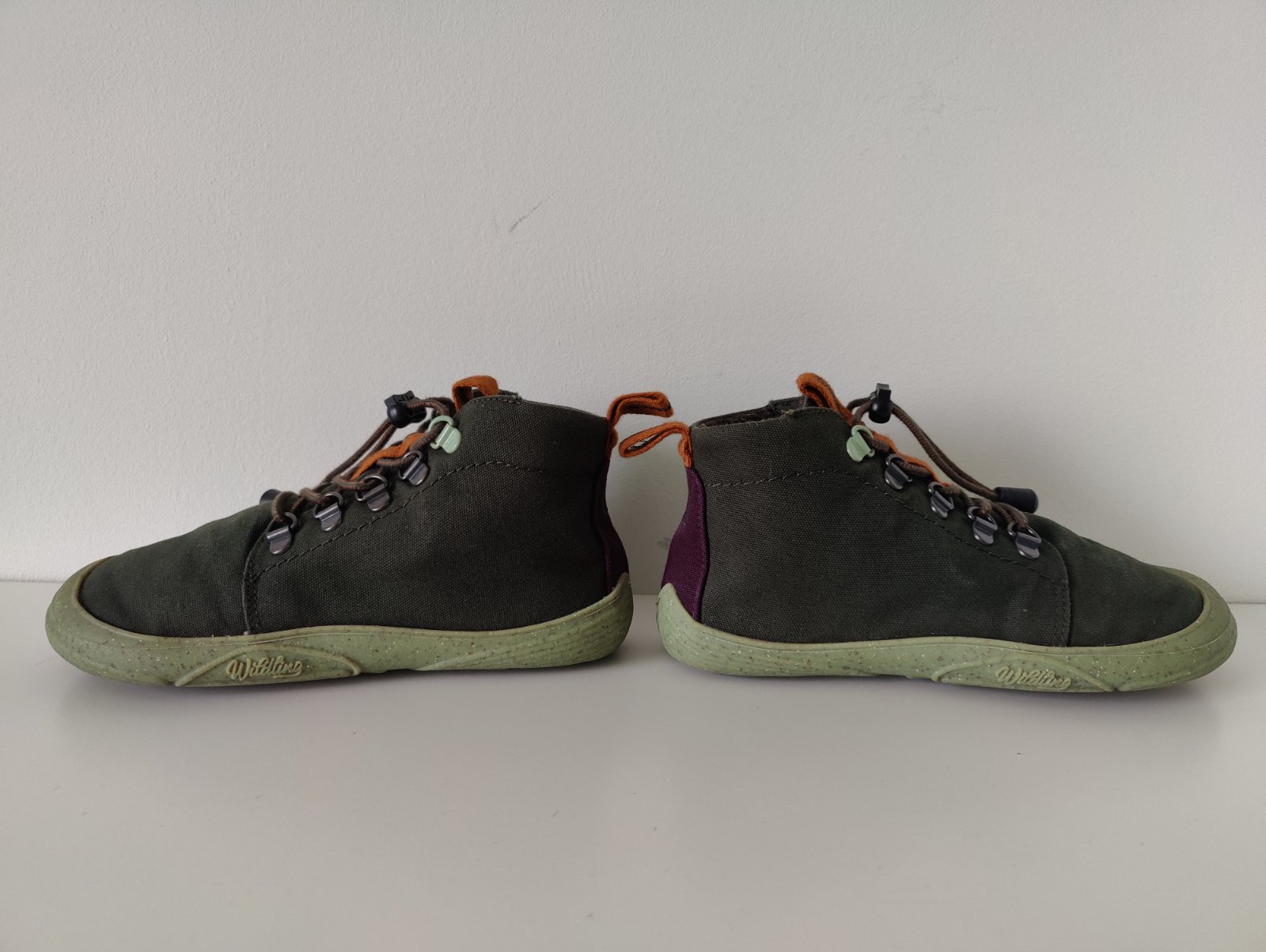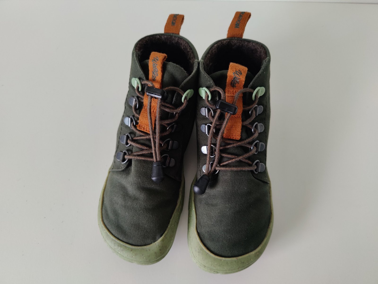 Predám detské zimné členkové barefoot topánky Wildling Tejo Olive s membránou. Veľkosť 32, vnútorná dĺžka 21 cm, vnútorná šírka cca 8,5 cm. Farba olivová s kontrastnou svetlozelenou podrážkou, oranžovými a baklažánovými detailami. Zapínanie na gumičku. Materiál zvonku recyklovaná bavlna, zvnútra pravá varená vlna Nordwolle. Veľmi pekný stav, nosené boli nakoniec len týždeň na konci zimy.