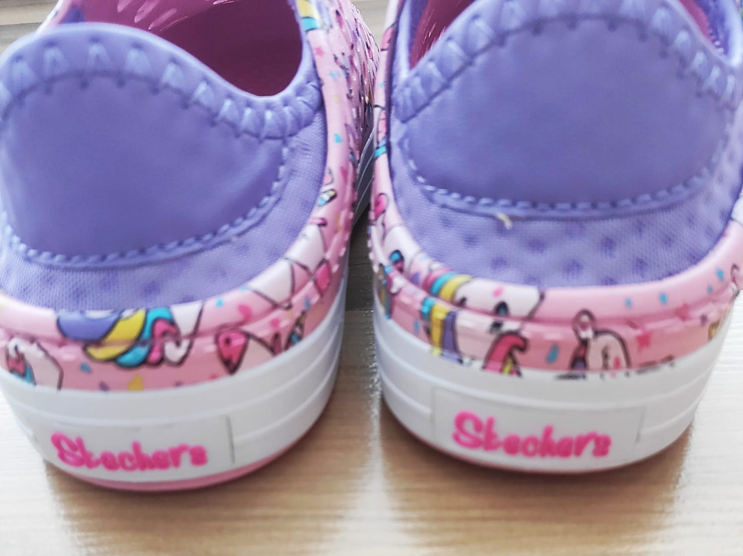 Dievčenské tenisky značky Skechers. Sú mäkučké, vnútorná vložka z materiálu Memory Foam. Biele podrážky vhodné aj do telocvične. Vnútorná dĺžka stielky 18,5 cm