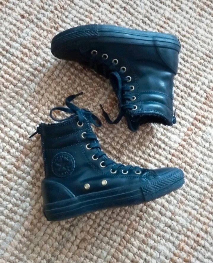 Zateplené kožené Converse tenisky, 8 dierkové. Zateplené vysoké topánky. Zips na päte. Perfektný stav. Vnútro namerané nadoraz max 20cm. Veľkosť USA junior 13 =EU 31, Bez chyby, podrážky nezošliapané.