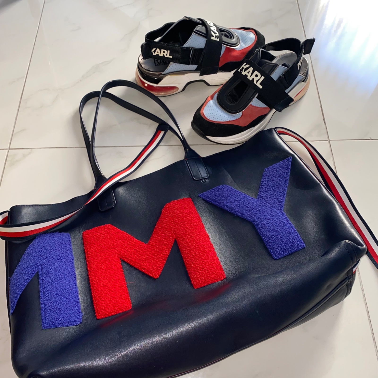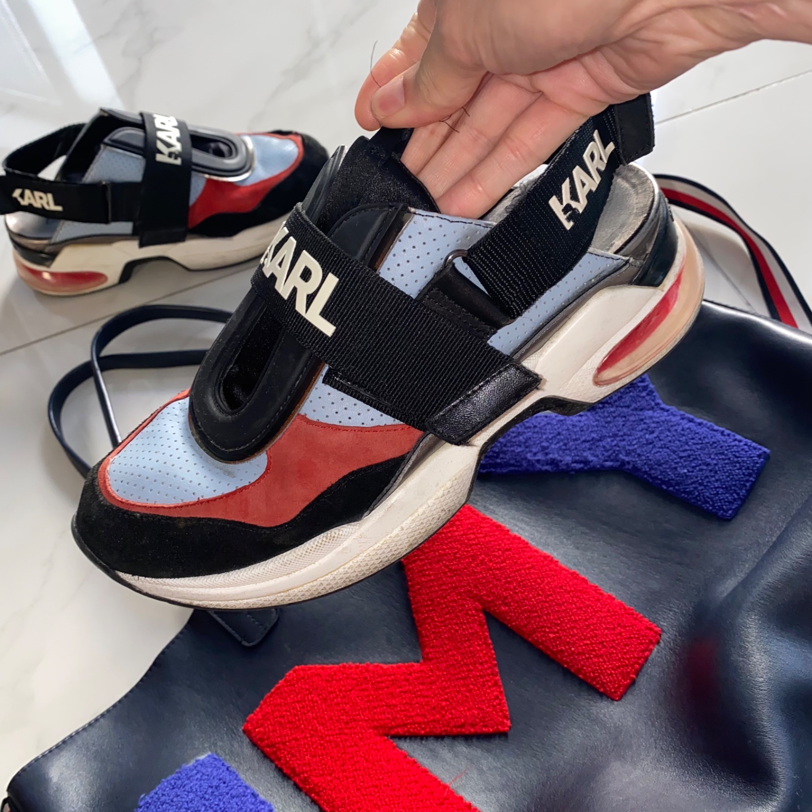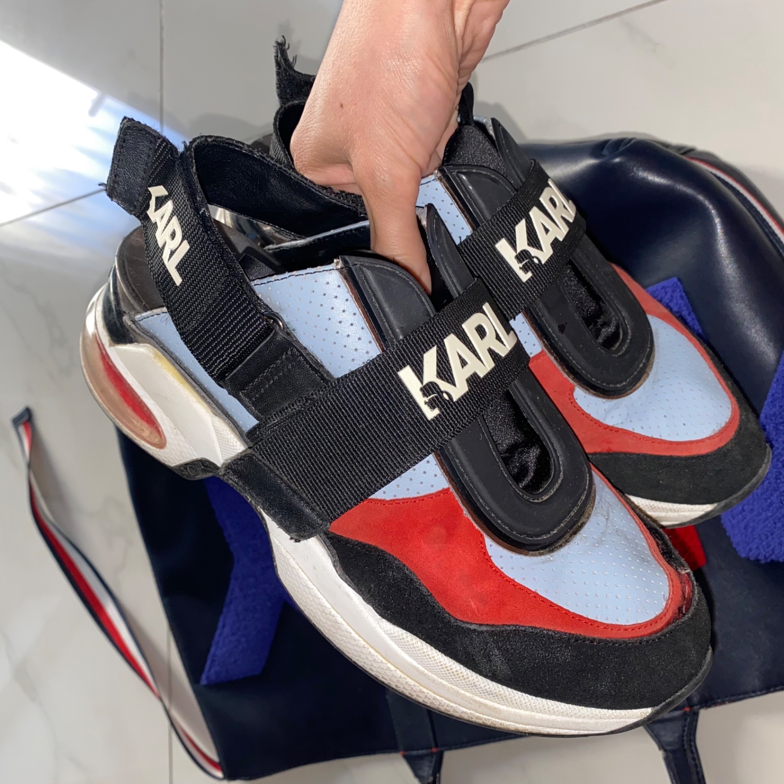 💙❤️ Predám sneakersy zn. Karl Lagerfeld, veľ. 39, sedia aj na 40, boli moje obľúbené, majú už nedostatky (najväčší je rozpárané šitie na špičke pravej topánky, treba opraviť o obuvníka). Kabelka Tommy Hilfiger krásne ladí k topánkam, v dobrom stave (viď foto). PC vyše 400€.