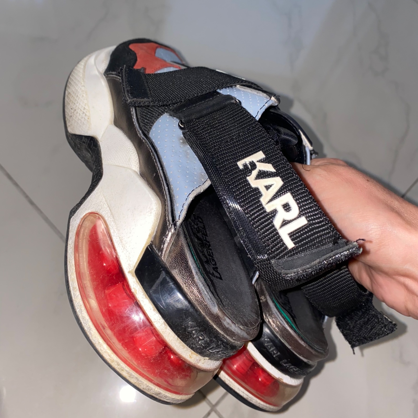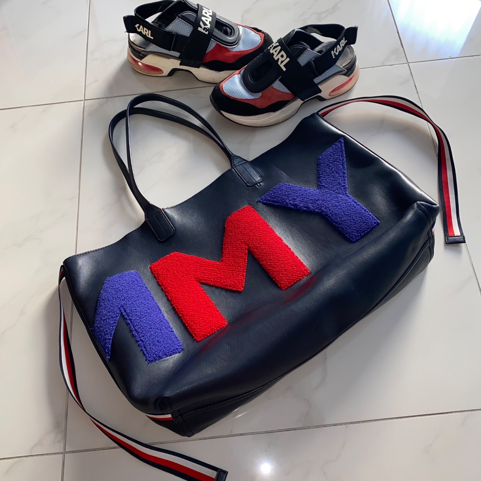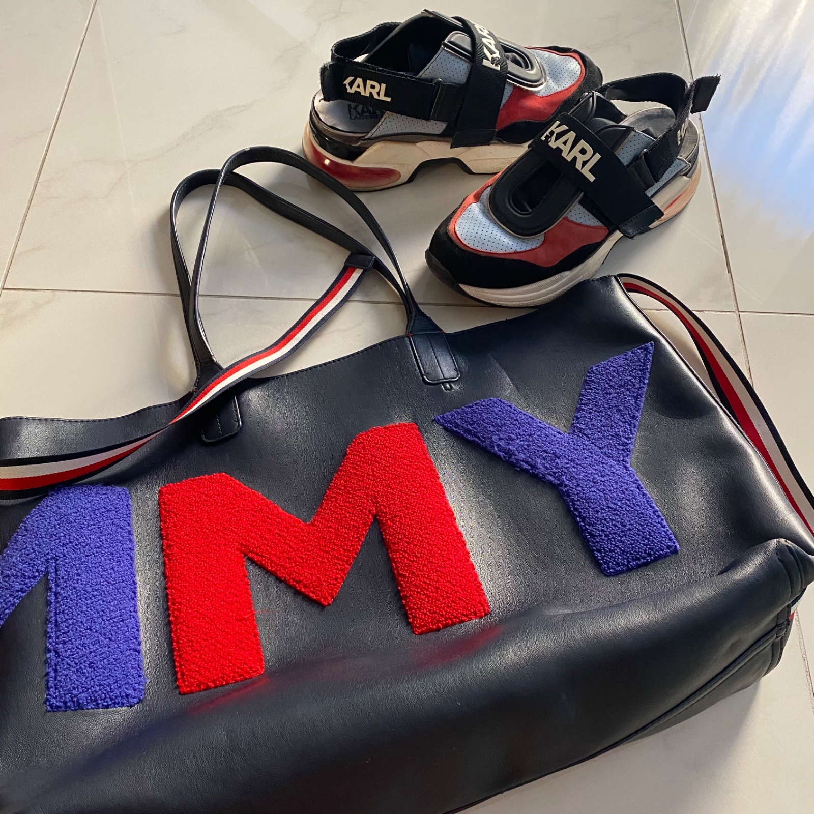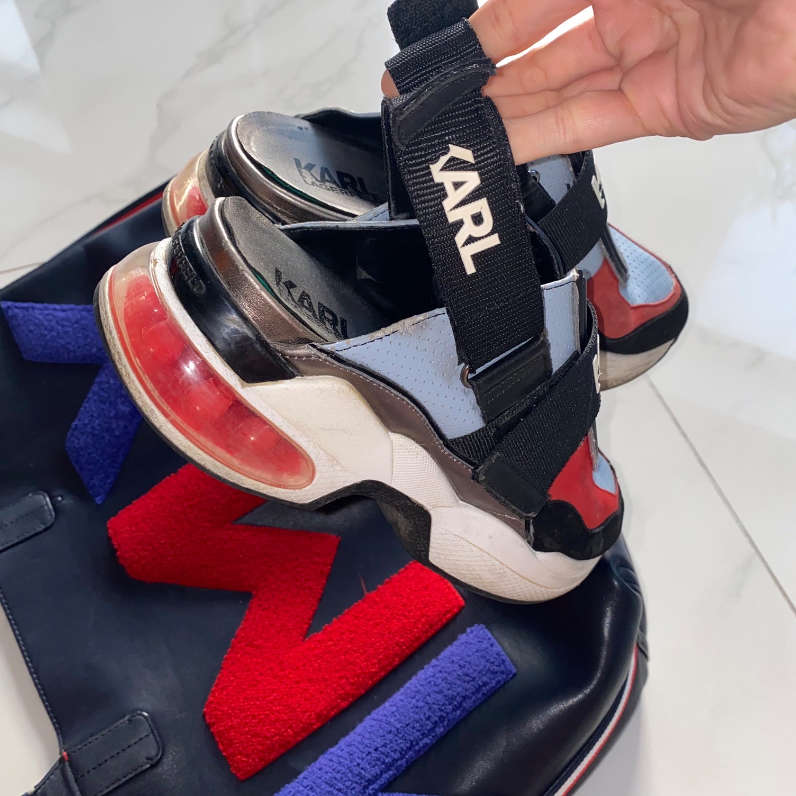 💙❤️ Predám sneakersy zn. Karl Lagerfeld, veľ. 39, sedia aj na 40, boli moje obľúbené, majú už nedostatky (najväčší je rozpárané šitie na špičke pravej topánky, treba opraviť o obuvníka). Kabelka Tommy Hilfiger krásne ladí k topánkam, v dobrom stave (viď foto). PC vyše 400€.