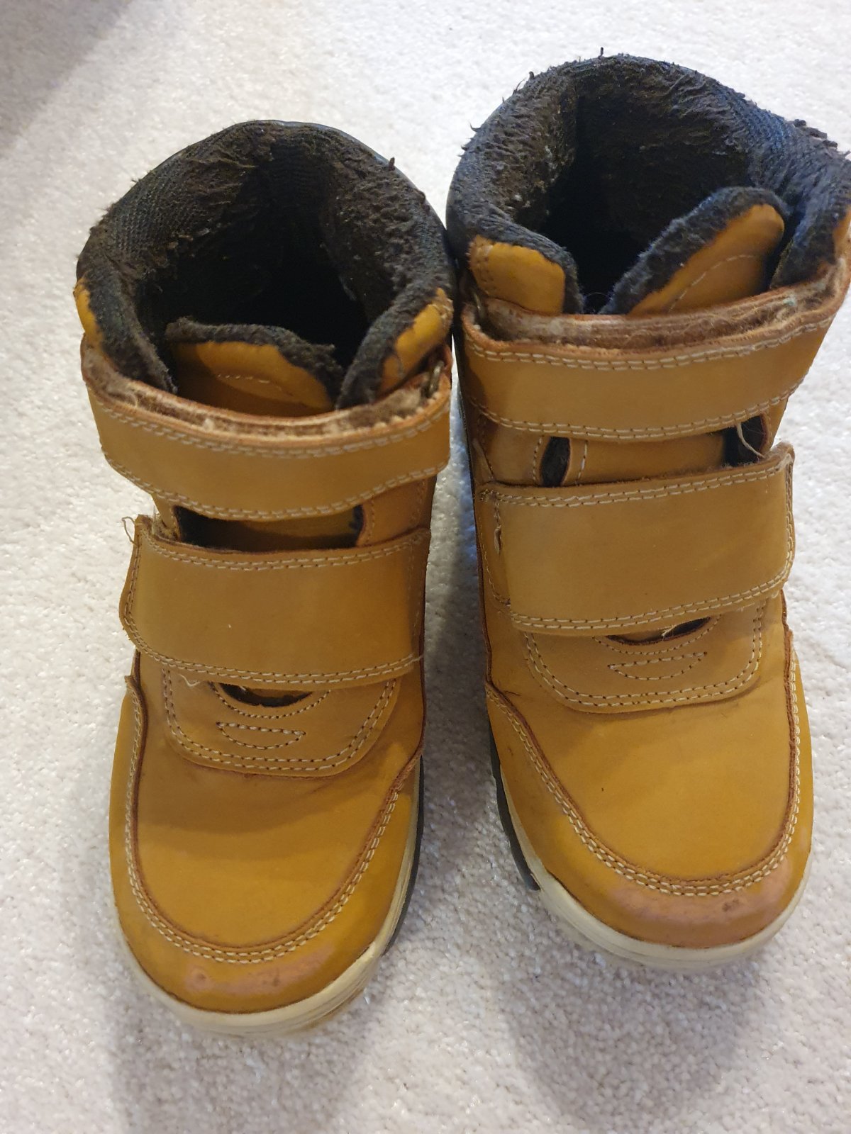 Hnedo horčicové štýlové detské zimné topánky. Nosené jednu sezónu na striedačku s dalšími.