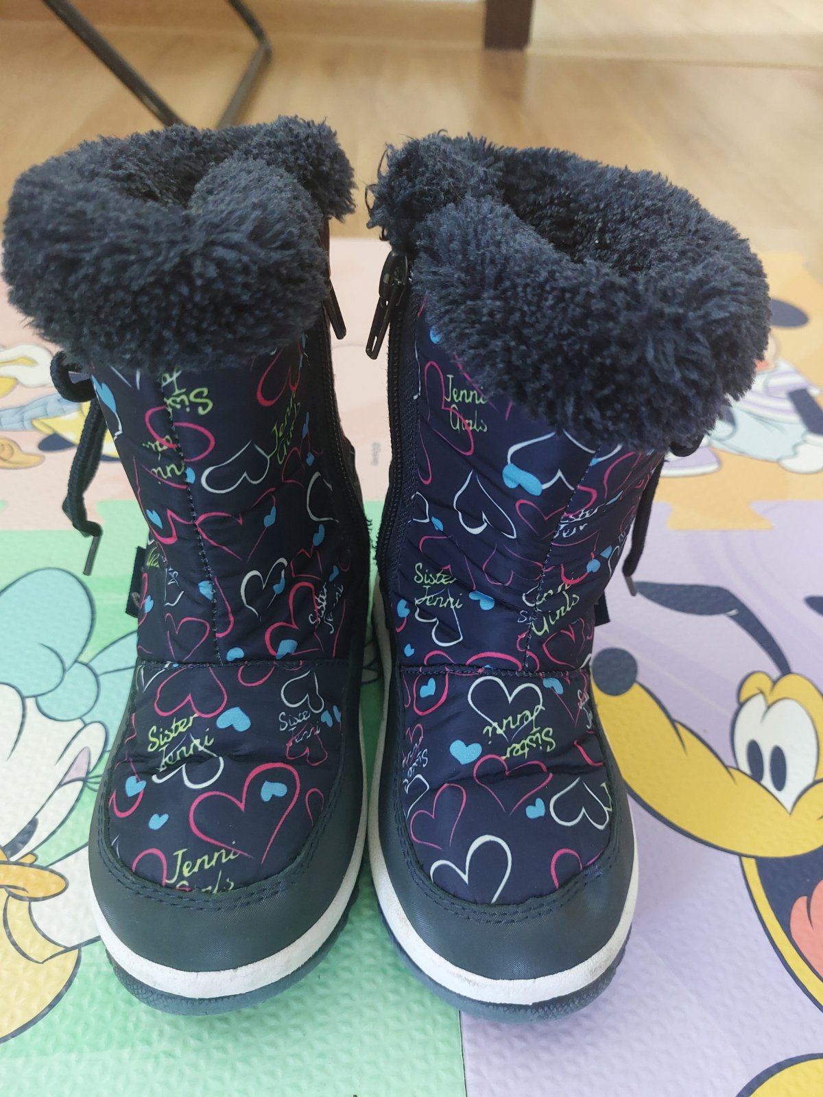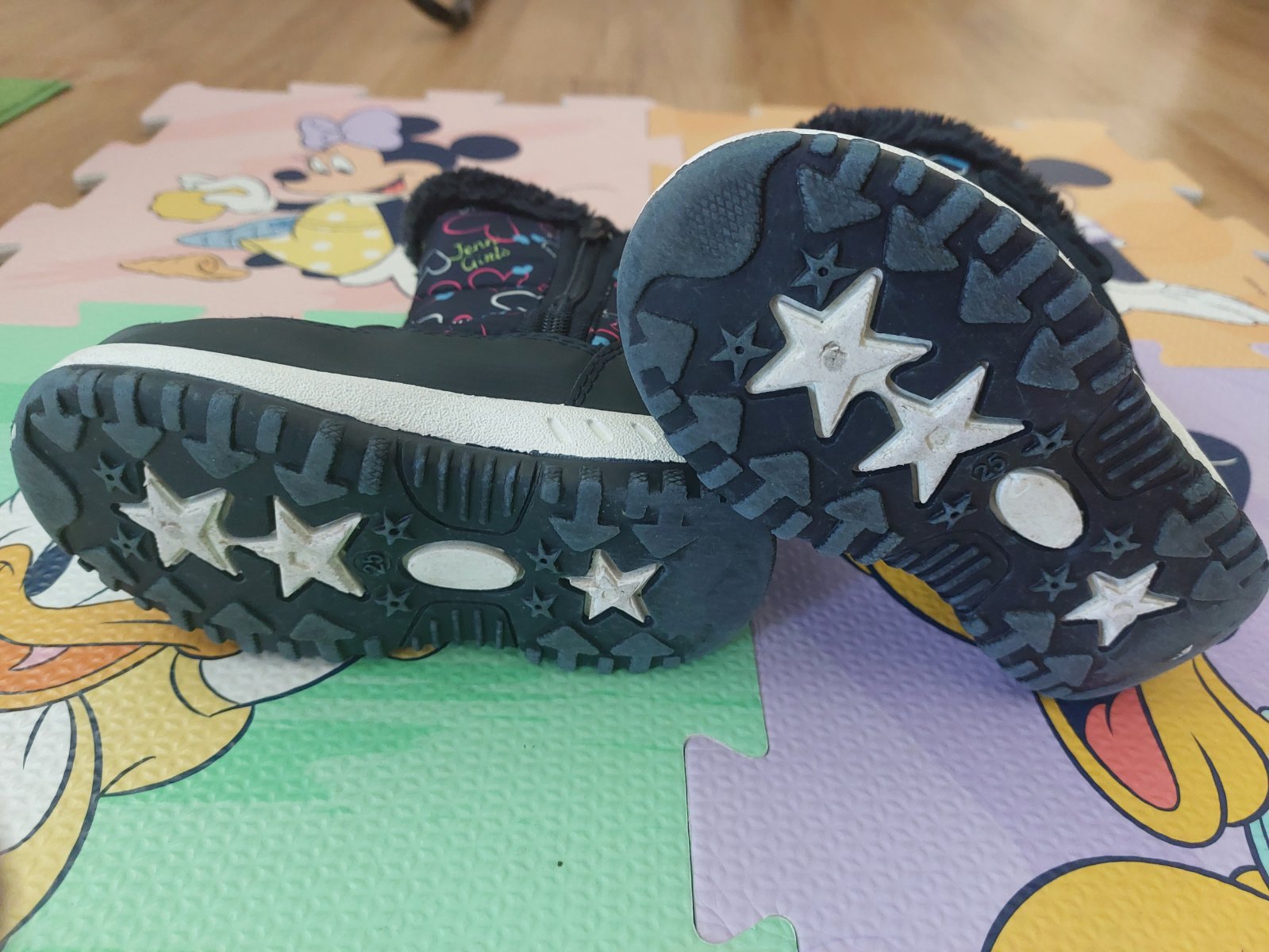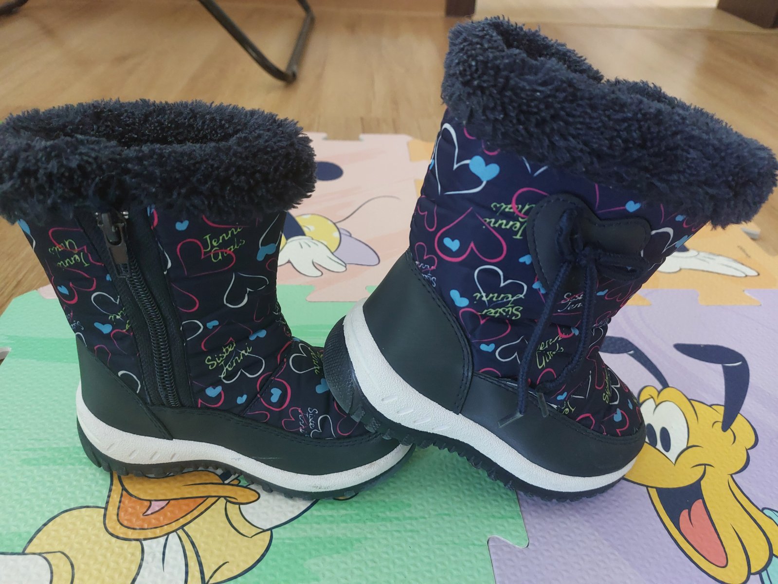 Tmavomodré snehule kupované v Deichmanne, veľkosť 25, s motívom Labkovej Patroly. Zachovalé, používané jednu zimu, majú na pätách praskliny a vpredu na špickach oderky, viď foto. PC 29,9e