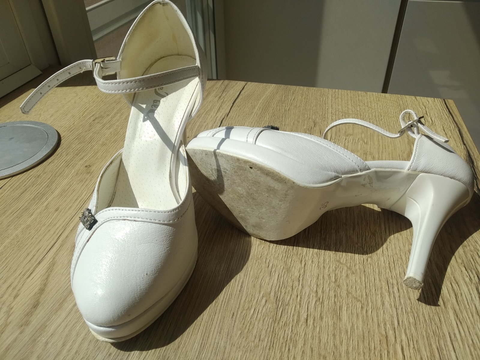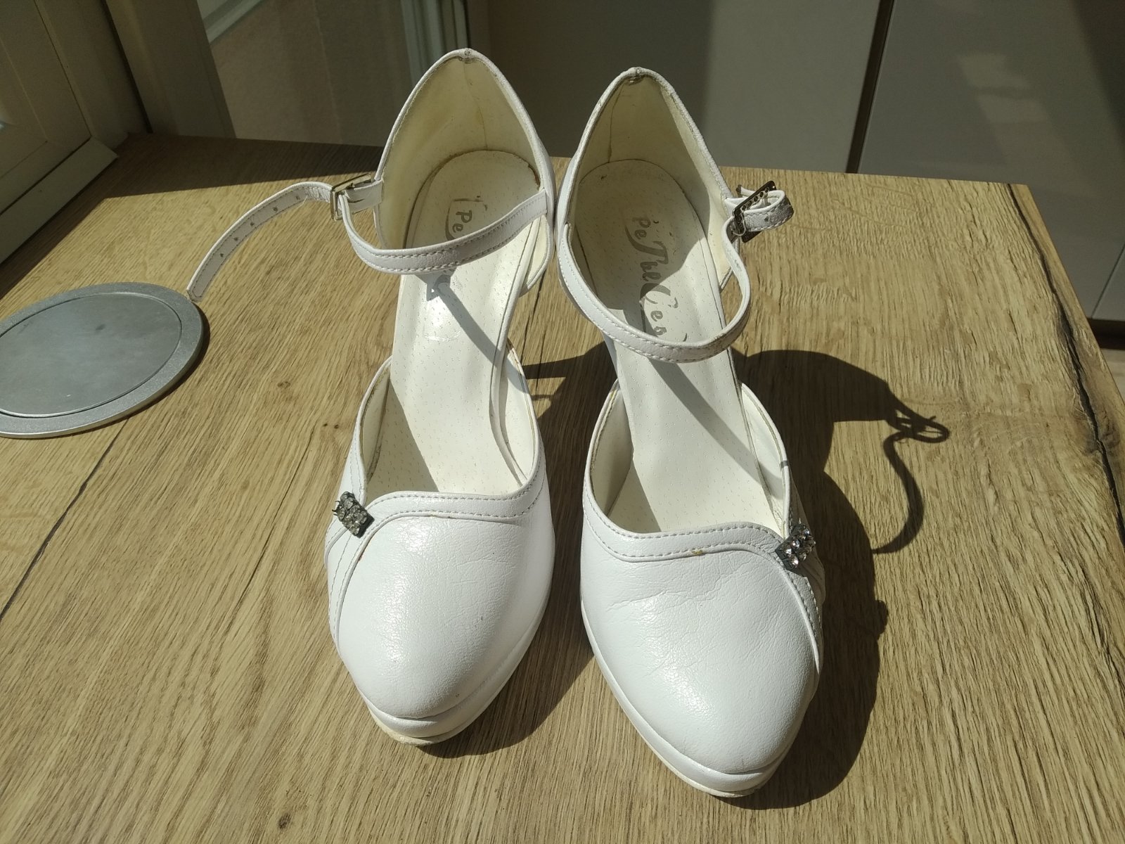 Ponúkam biele topánky, vhodné na 1sv.prijímanie, biela farba, predok trošku obity nosením ale ešte sa daju nosiť, velkost 35, cena 5€