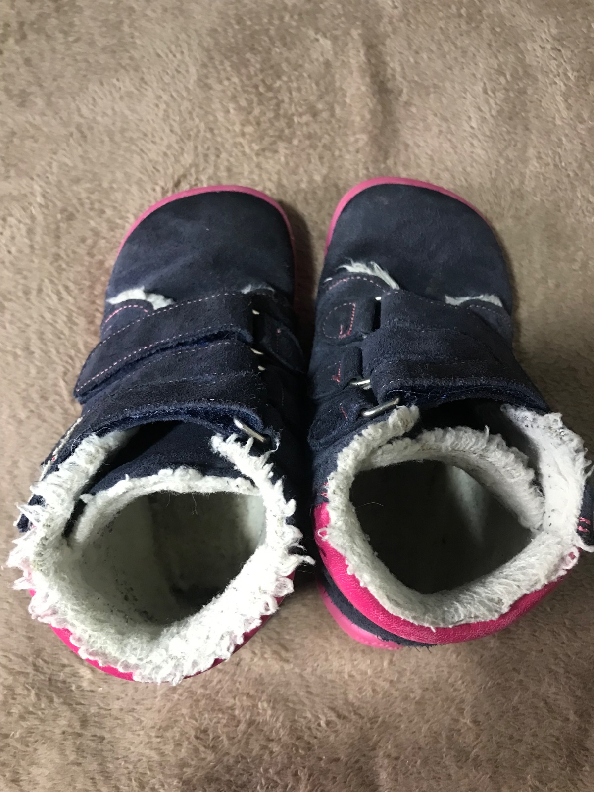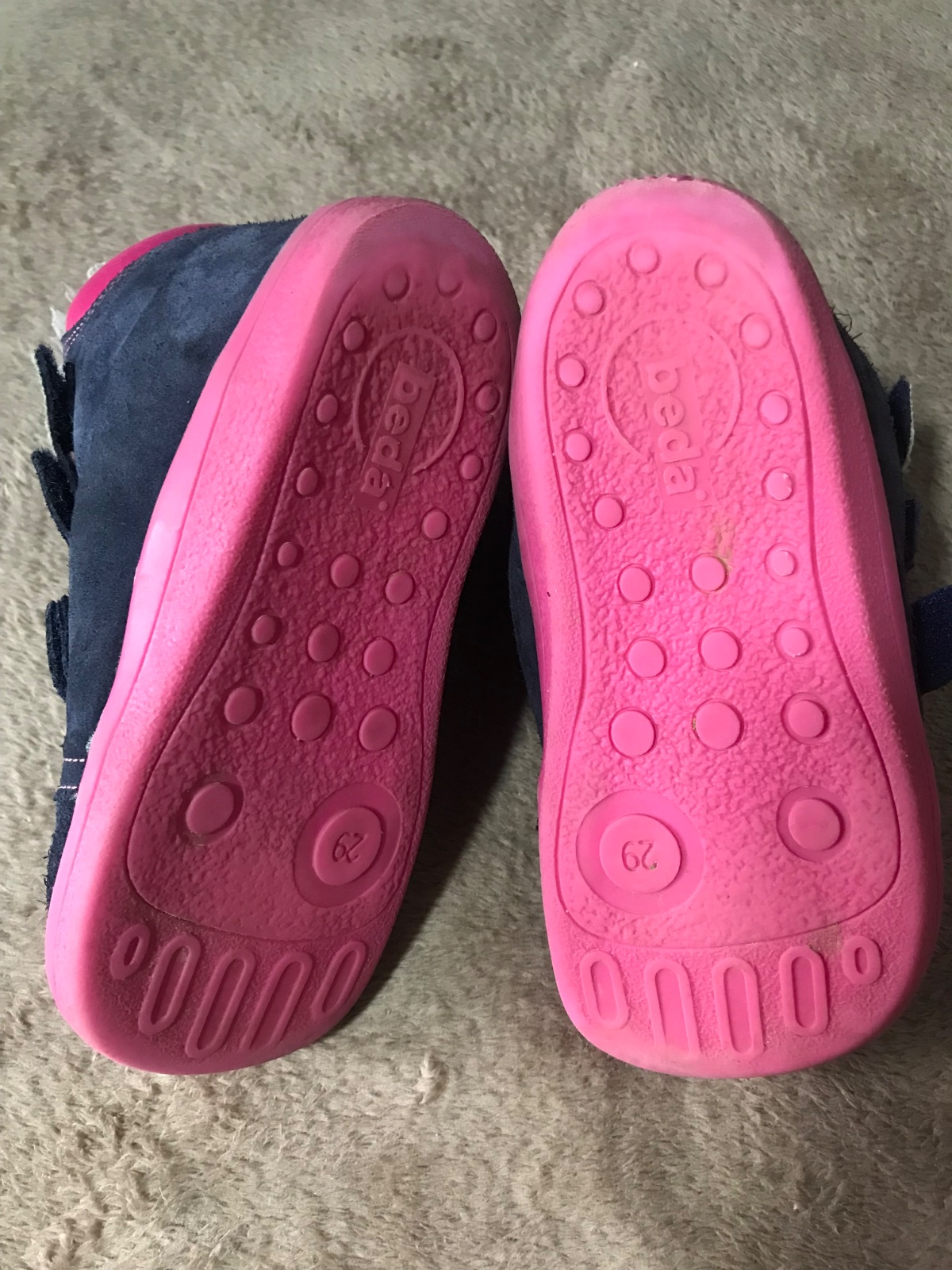 Barefoot zimné topánky nosené 2 sezóny. VD 185 mm, VŠ 76 mm. Vnútorná časť je zateplená kožúškom. Obuv má dve stielky jedna je rovnaká ako u celoročných, druhá je filcová a zateplená kožúškom. Päty sú už schodené (viď foto č. 3). Ideálne na záhradu alebo ako náhradná obuv.