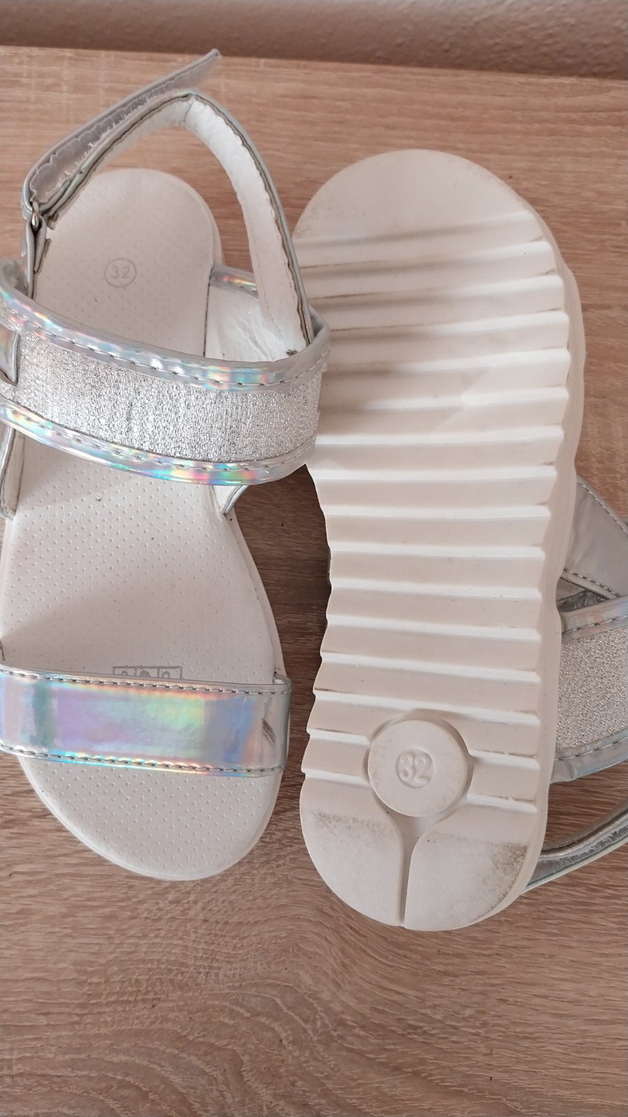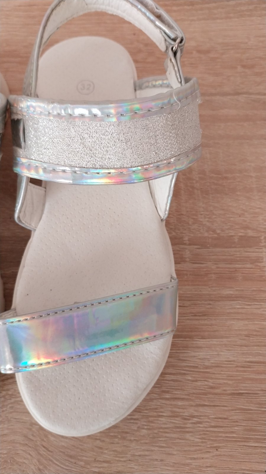 Strieborné dievčénske sandále. Obuté na jednej oslave a 1x na vystúpení - čiže len v interiéri. Už malé. Top stav, ako nové