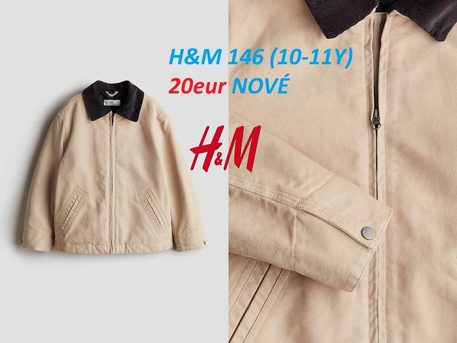 Ďalej predám chlapčenskú mierne vatovanú bundu H&M, veľkosť 146 (10-11Y). Bunda je z bavlneného plátna s menčestrovým stojačikom, zapínaním na gombíky, spevnenými prednými vreckami a dlhými rukávmi s manžetovými gombíkmi. S podšívkou. Cena 20eur.
