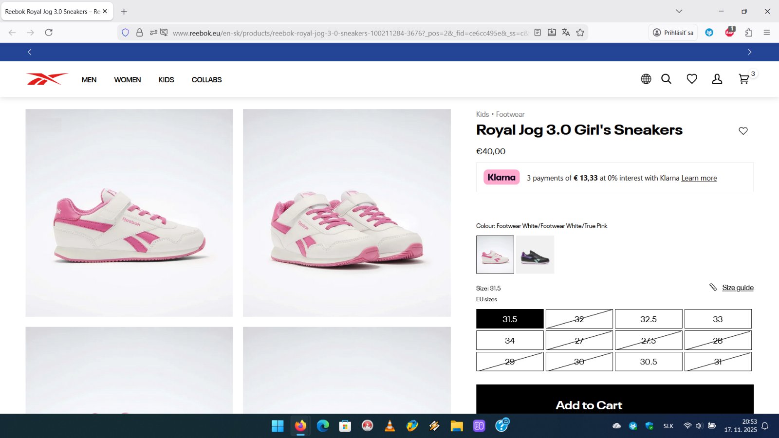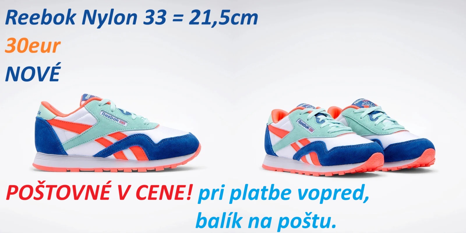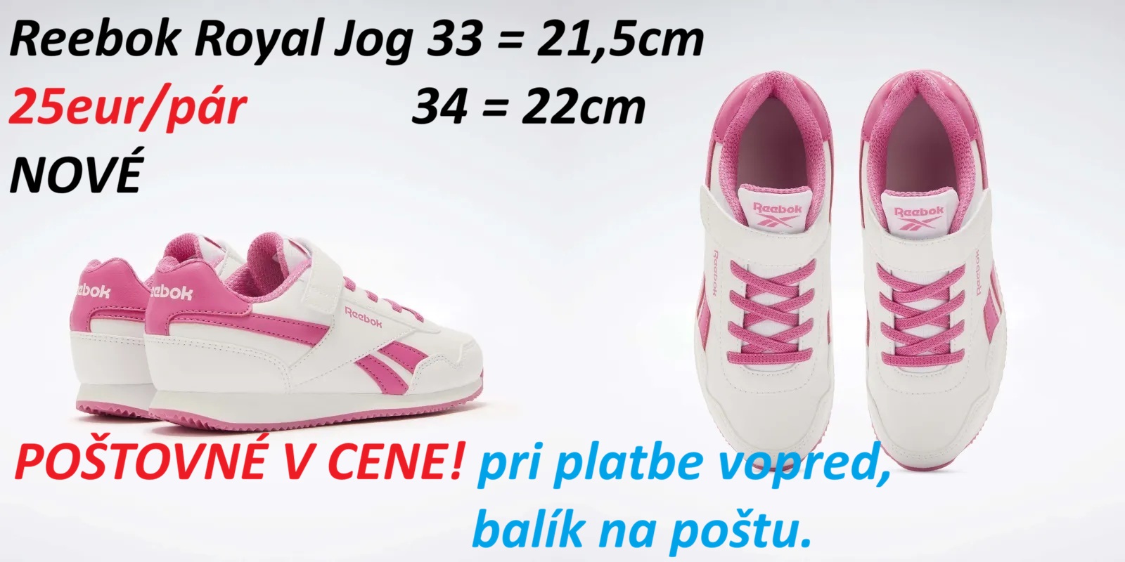 Ďalej predám dievčenské tenisky Reebok Royal Jog, veľkosť 33 = 21,5cm a veľkosť 34 = 22cm. Cena 25eur/pár.