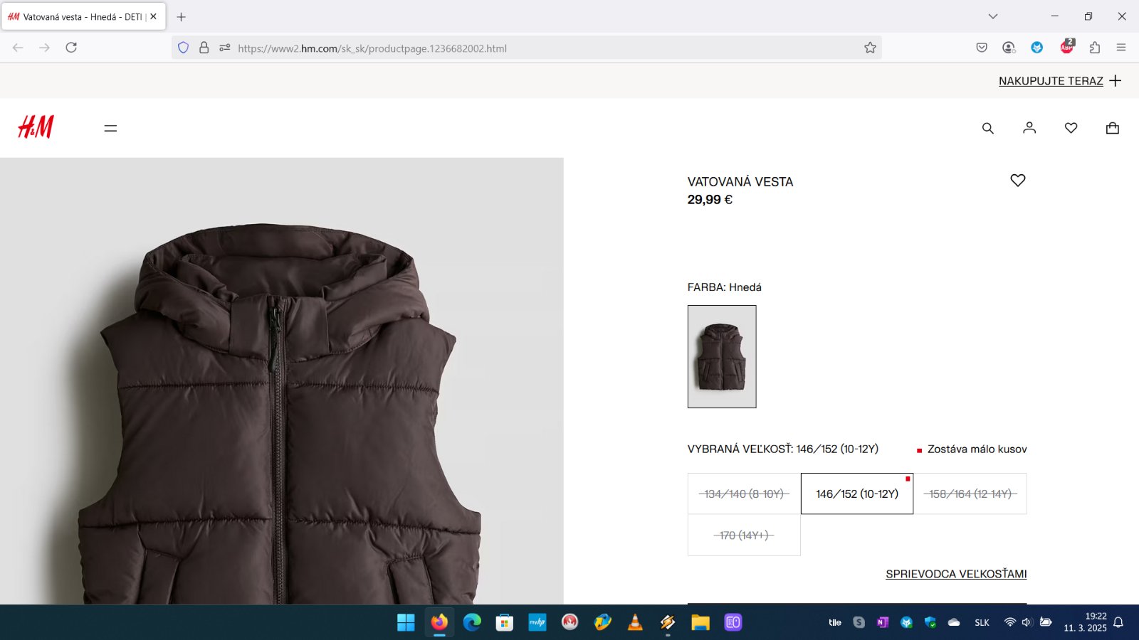 Ďalej predám chlapčenskú vatovanú vestu s kapucňou H&M, veľkosť 146/152 (10-12Y). Vesta je z prešívanej tkaniny s odnímateľnou kapucňou, stojačikom a zapínaním na zips. Spevnené predné vrecká a naberaný šev naspodku. Taftová podšívka. Cena 17eur.