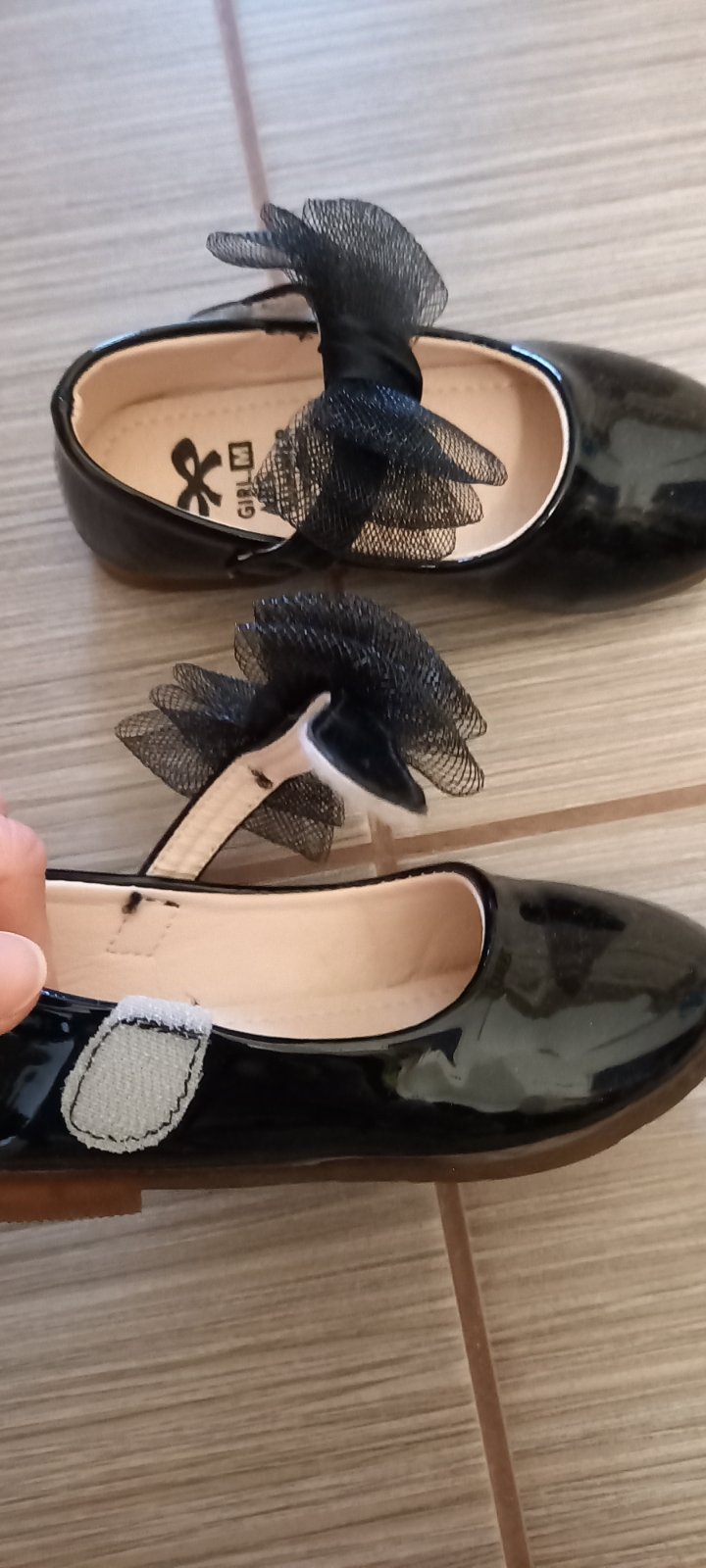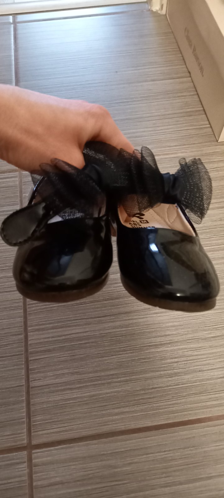 Predám čierne lakované topánočky, slávnostné, zapinanie na suchy zips. Veľkosť odhadom, VD 14,5-15 cm, vonkajšia 16cm. Na pravej špičke je malá ďobka, nešla ani odfotiť. Prezrite poriadne fotky. Stav je super. Boli obuté 1x na príležitosť.