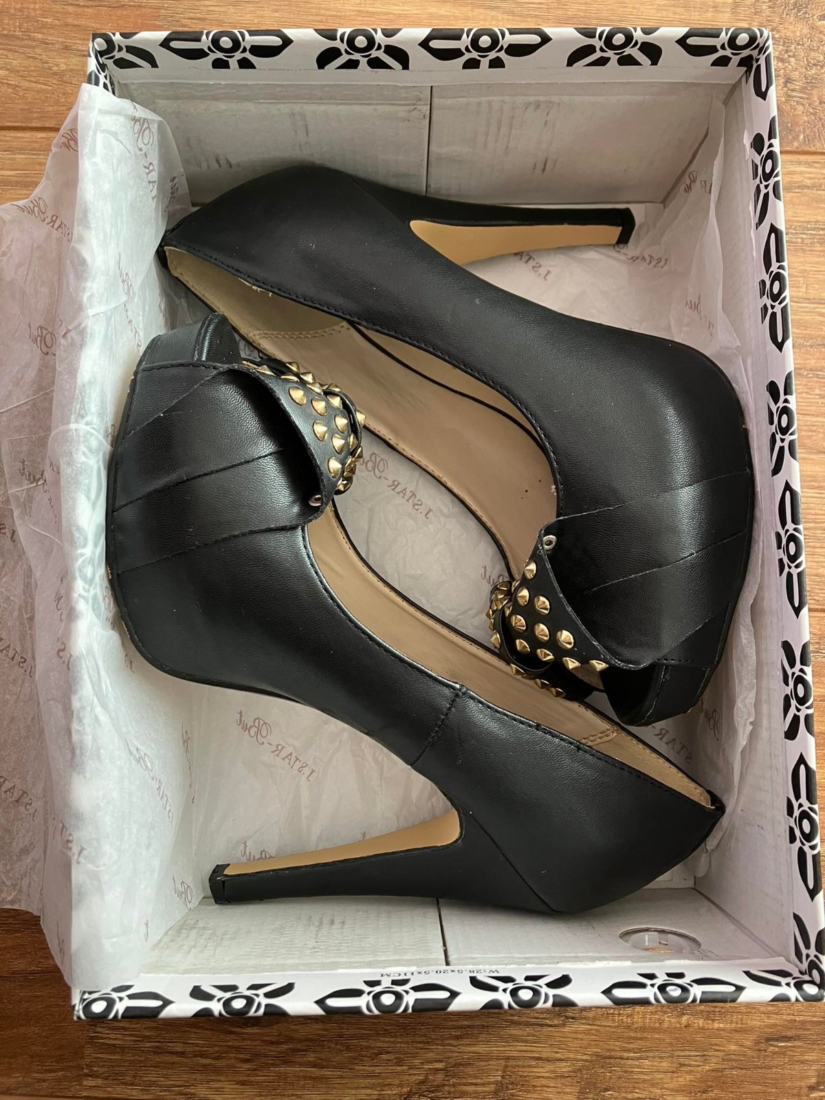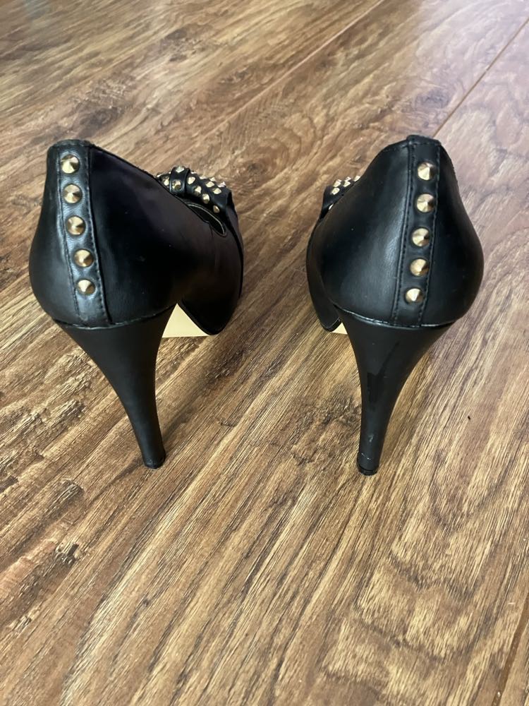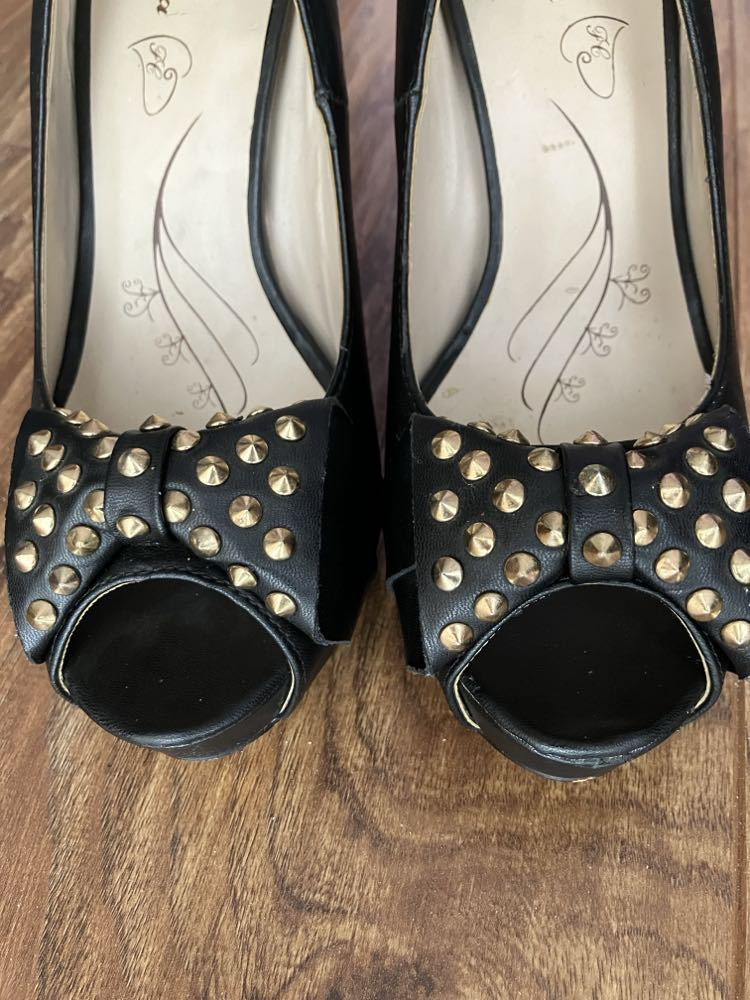 Raz obuté na svadbe, nepoškodené, lakované. PC 39,99. Výška opätku a pätníka spolu 9,5 cm. Dĺžka vnútornej stielky 23 cm.