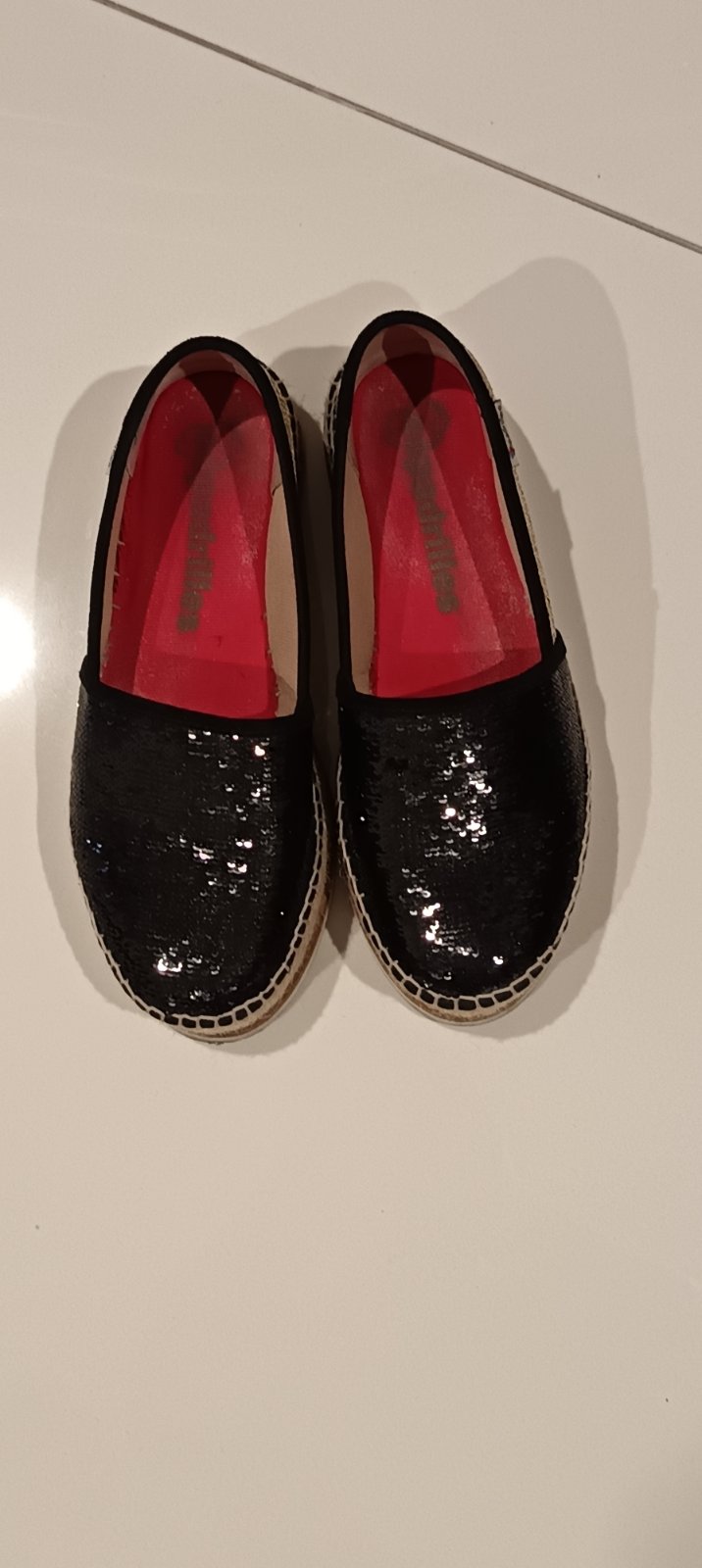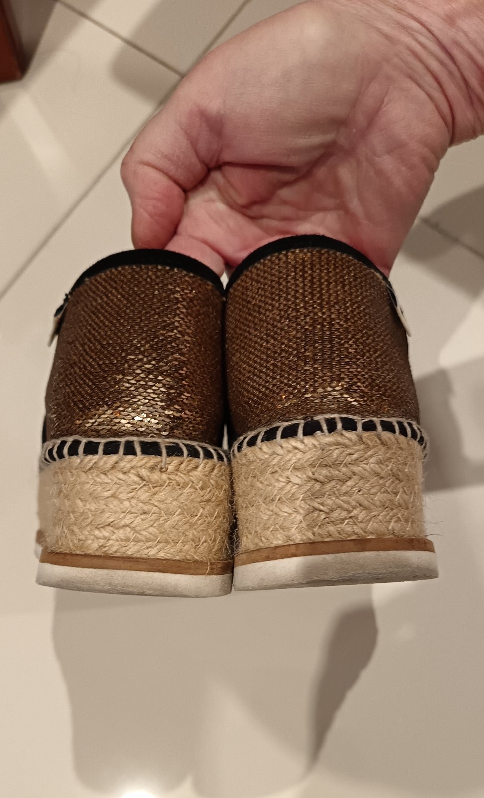 Krásne pohodlné zlato - čierne na vyššej platforme, celé trblietavé, pevná penová, mäkká vložka, materiál plátno pošité drobnými flitrami, super stav.