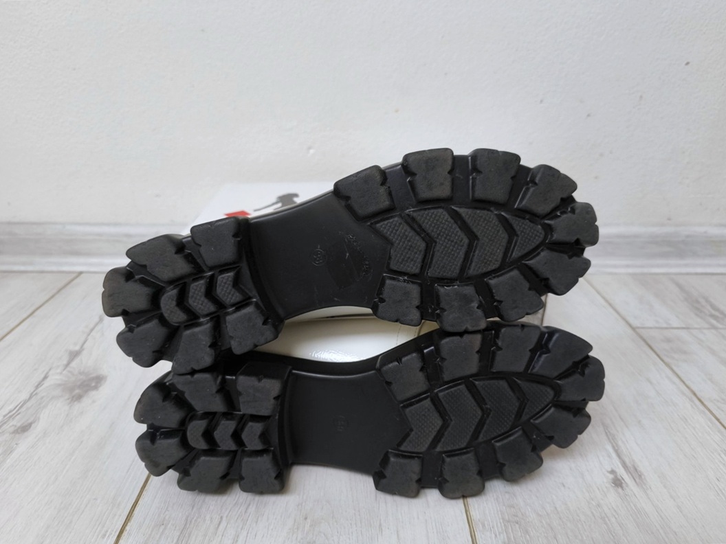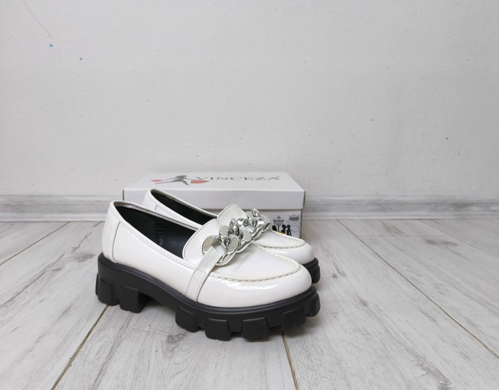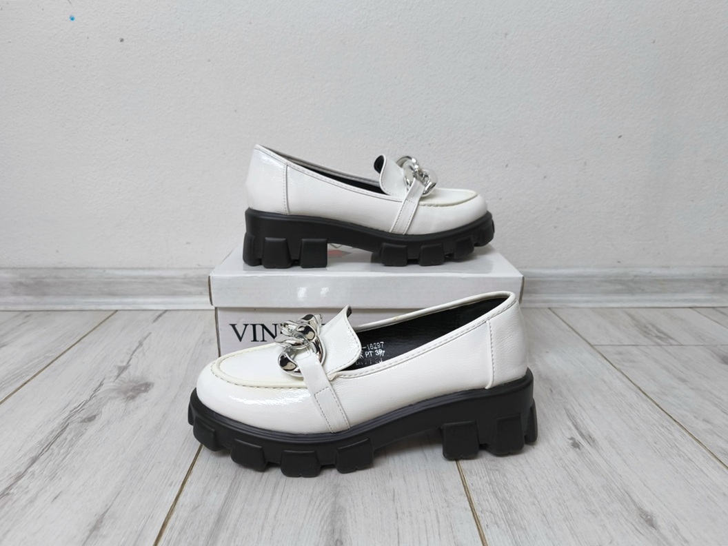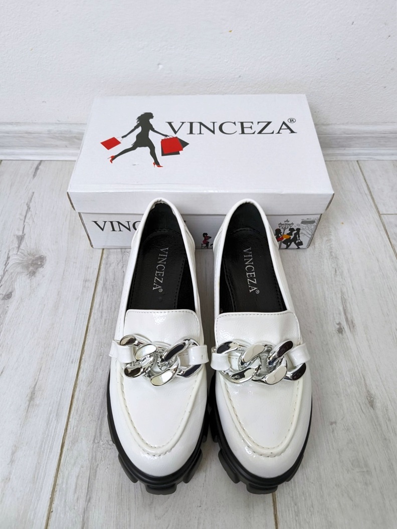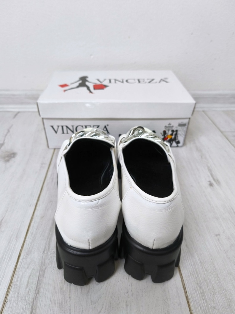 V perfektnom stave ako nové ľahučké mokasíny zn. VINCEZA, bielej farby so striebornou reťazou na hrubej čiernej podrážke. Veľkosť uvádzaná 38, ja túto veľkosť nosím, ale sú mi voľnejšie, takže treba na 38,5 alebo širšiu nohu. Vnútorná dĺžka 24,8cm.