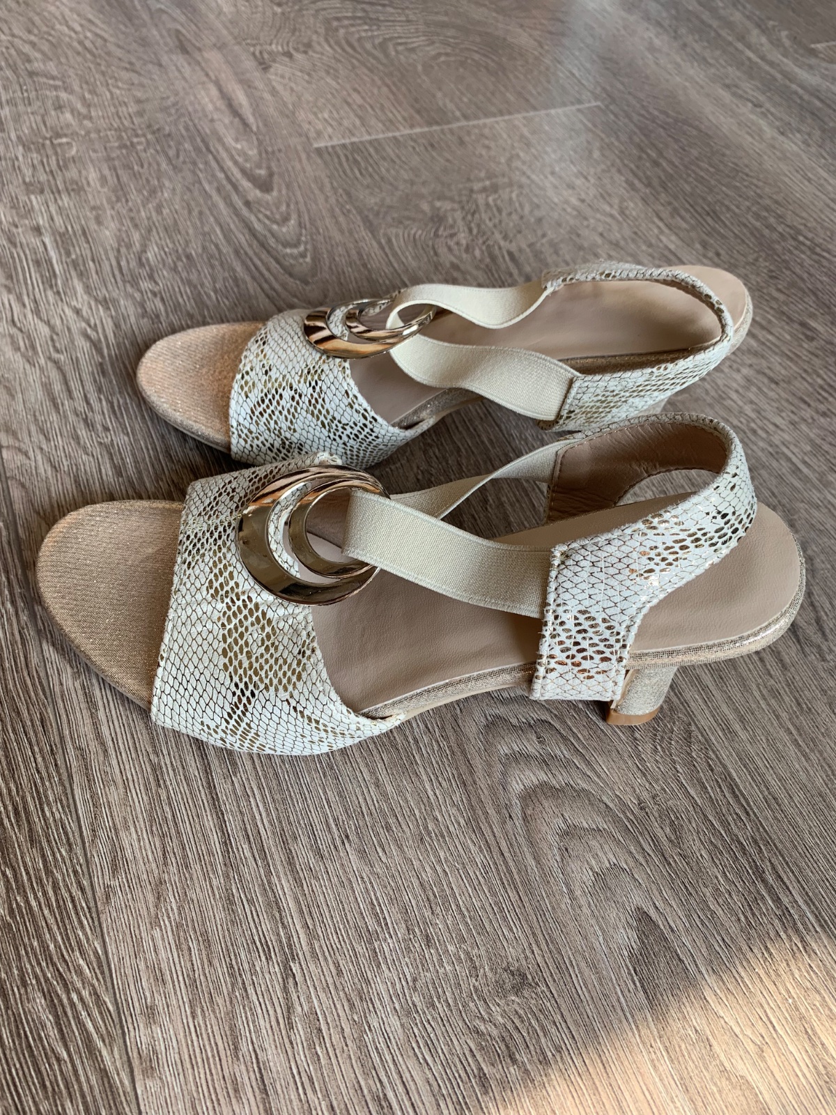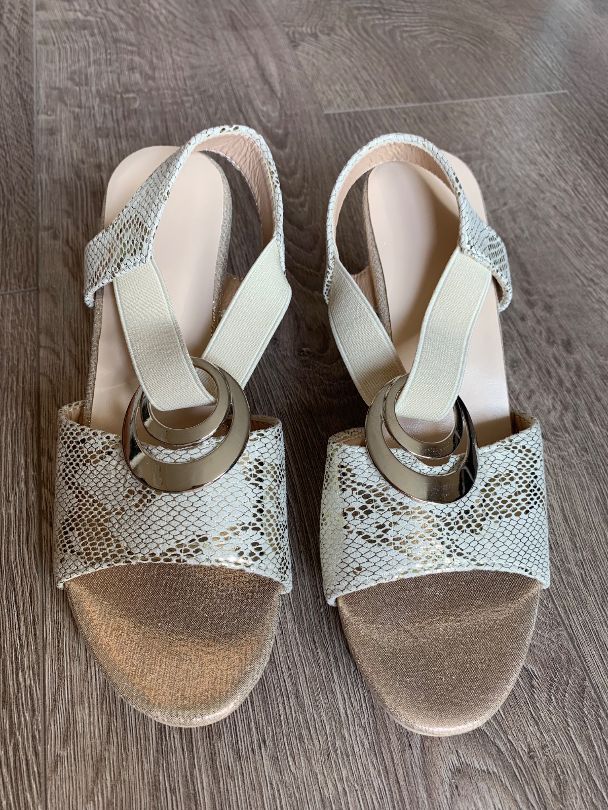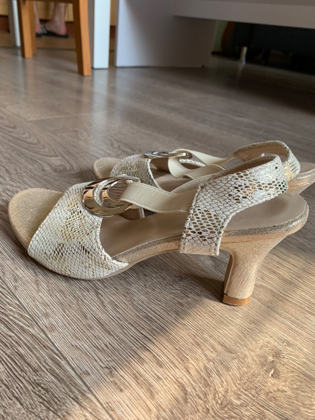 Dámske nové sandále, veľmi pohodlné kvôli nízkemu podpätku a gumičke. Farba béžovo-zlatá. Ihneď k odberu.