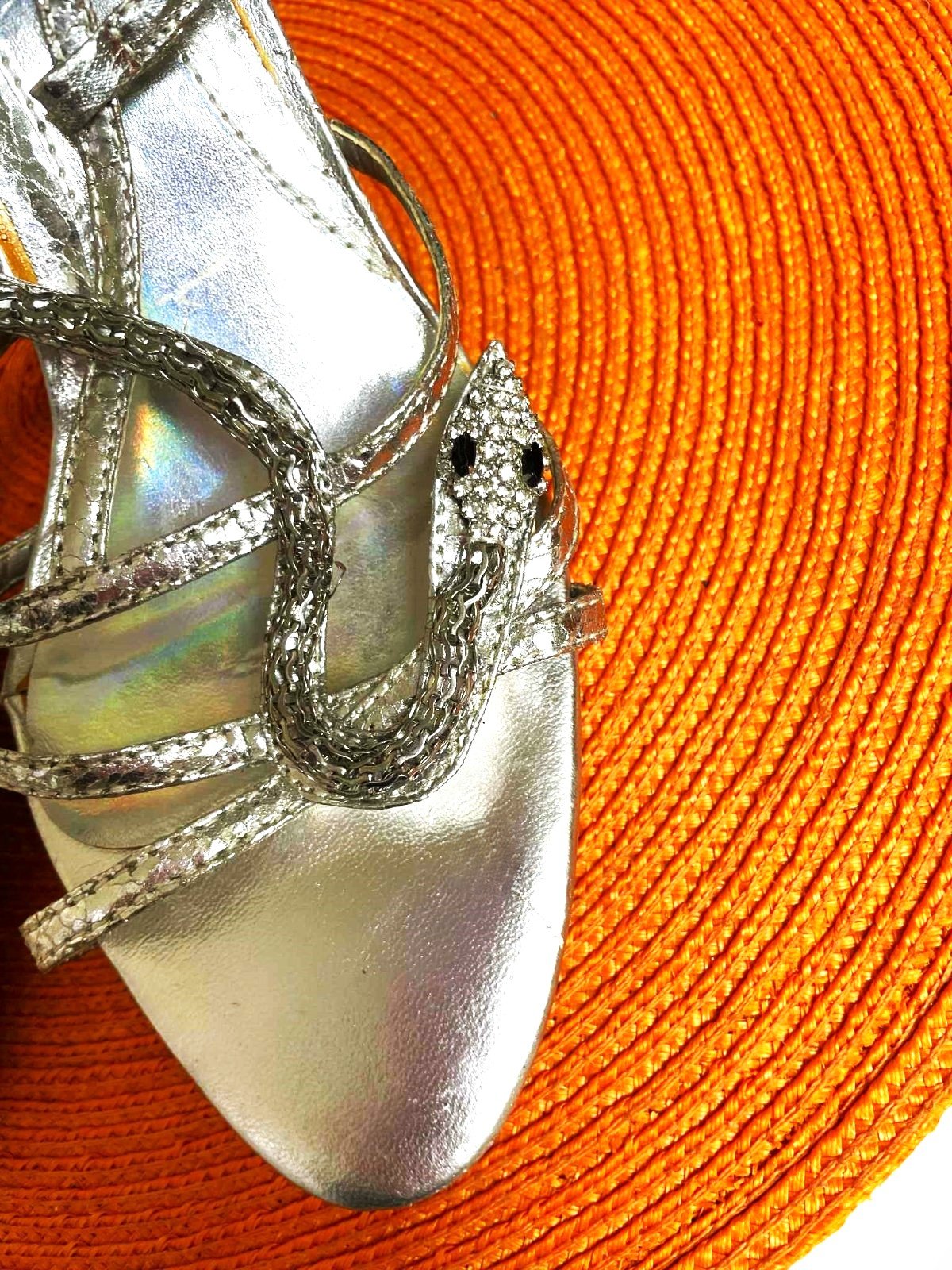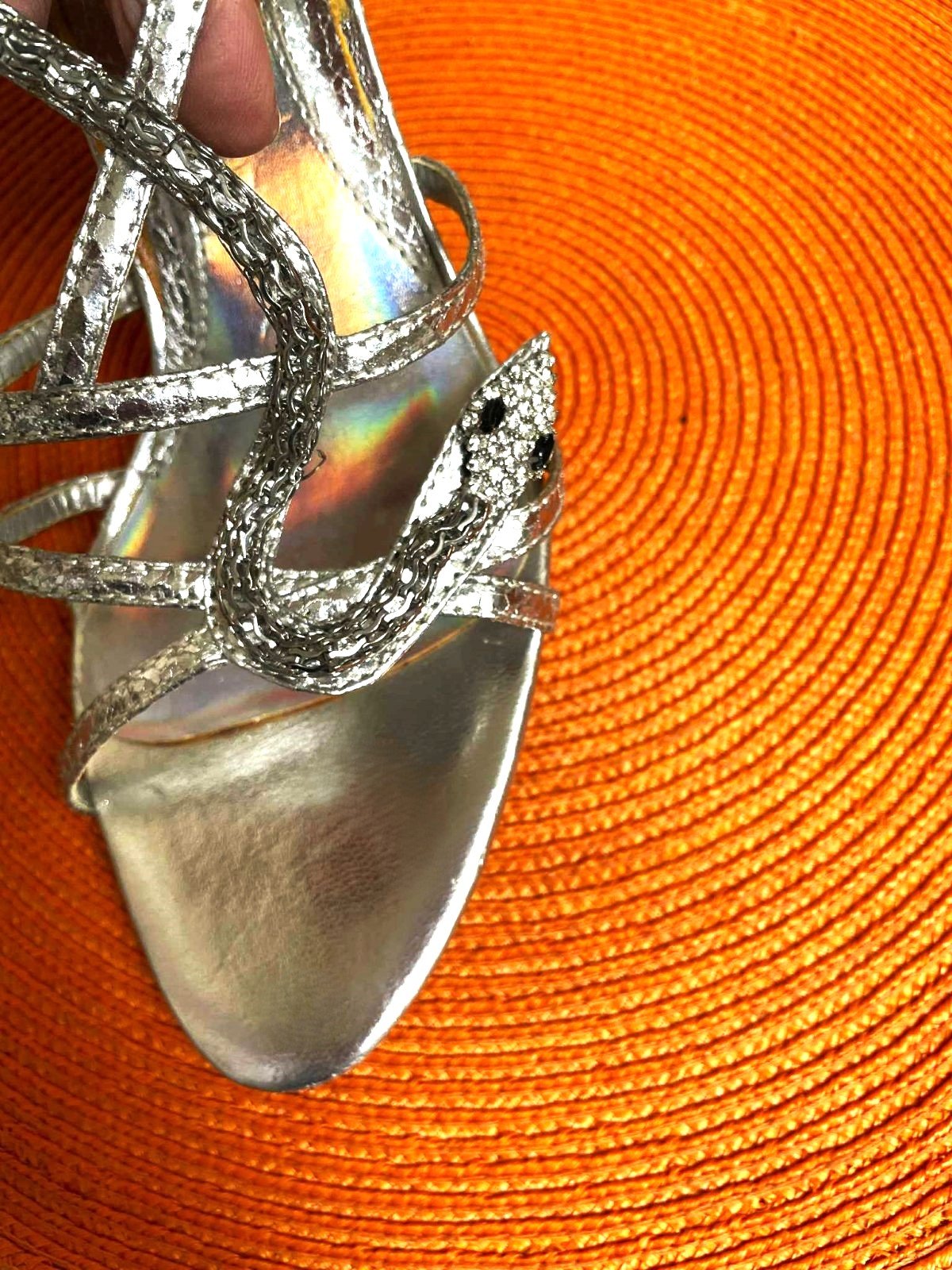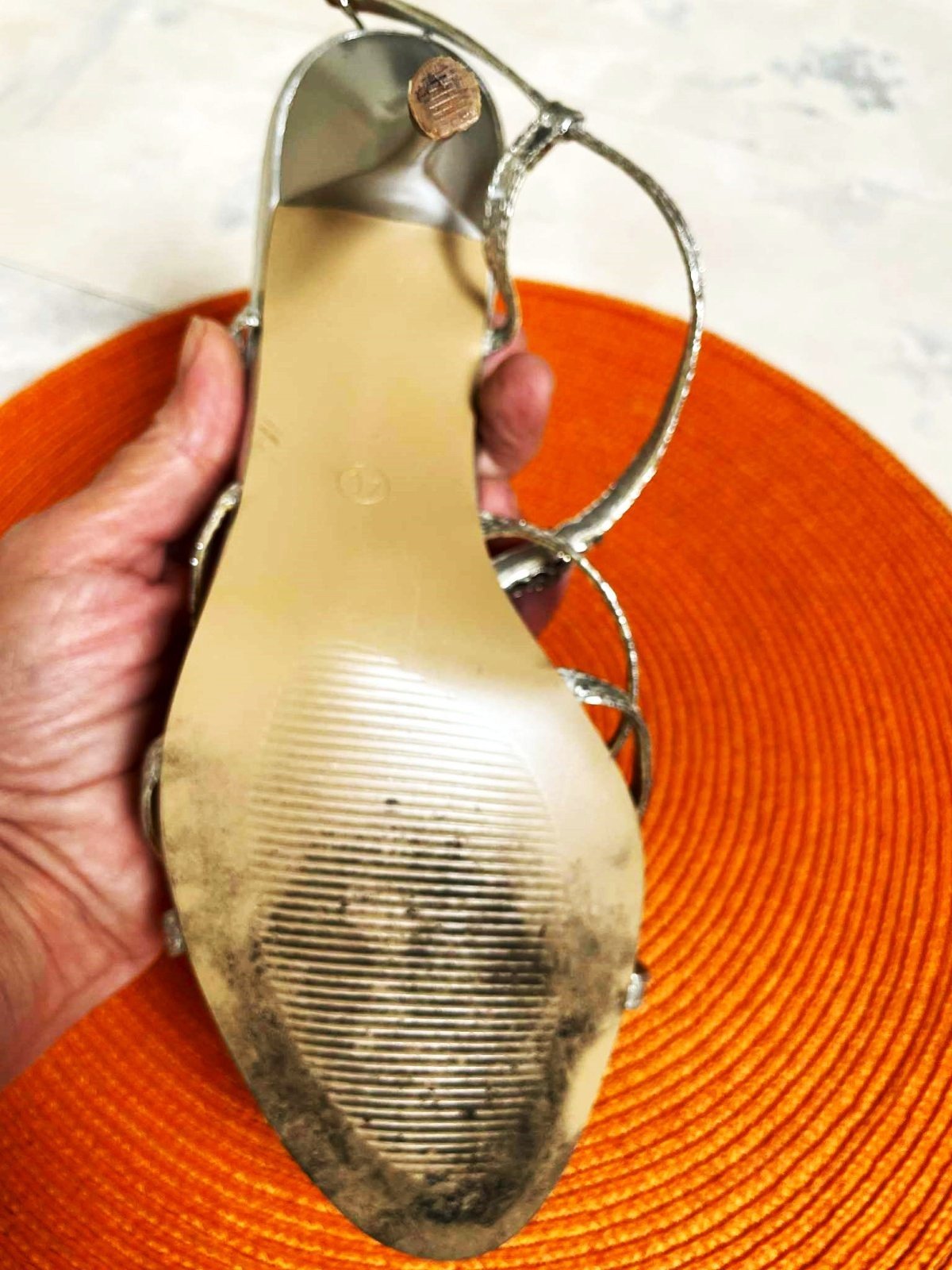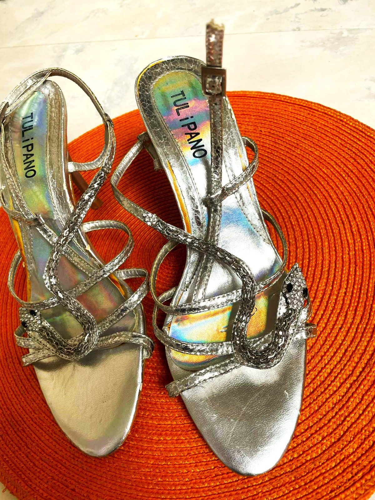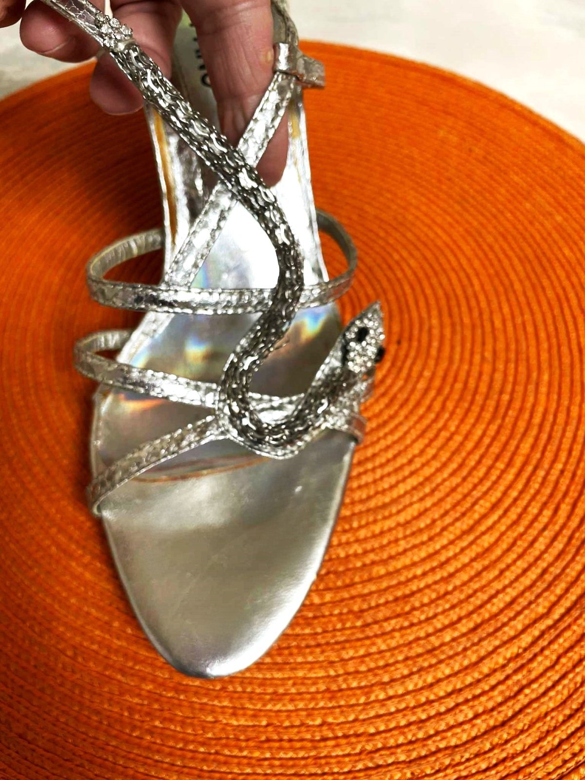 krásne talianske sandálky,podpätok = 10 cm, vn, dlžka = 26 cm,je to merané presne,takže na nohu o dlžke cca 25 - 25,5 cm,zaujímavý prepletaný vzor,krásne sedia na nohe,pôsobia veľmi zoštíhľujúco,zapínanie na pružnú gumičku vzadu naboku,prispôsobivé a vďaka gumičke pevne držia a nezosúvajú sa.....