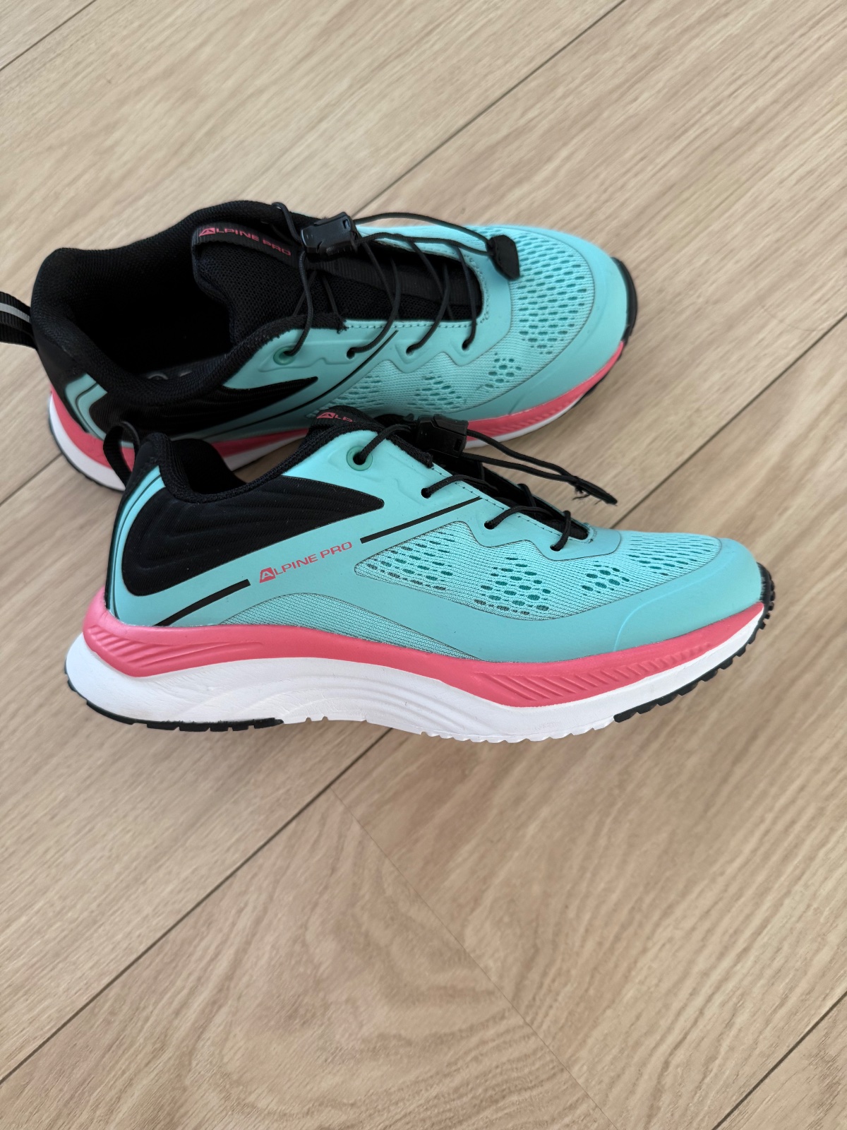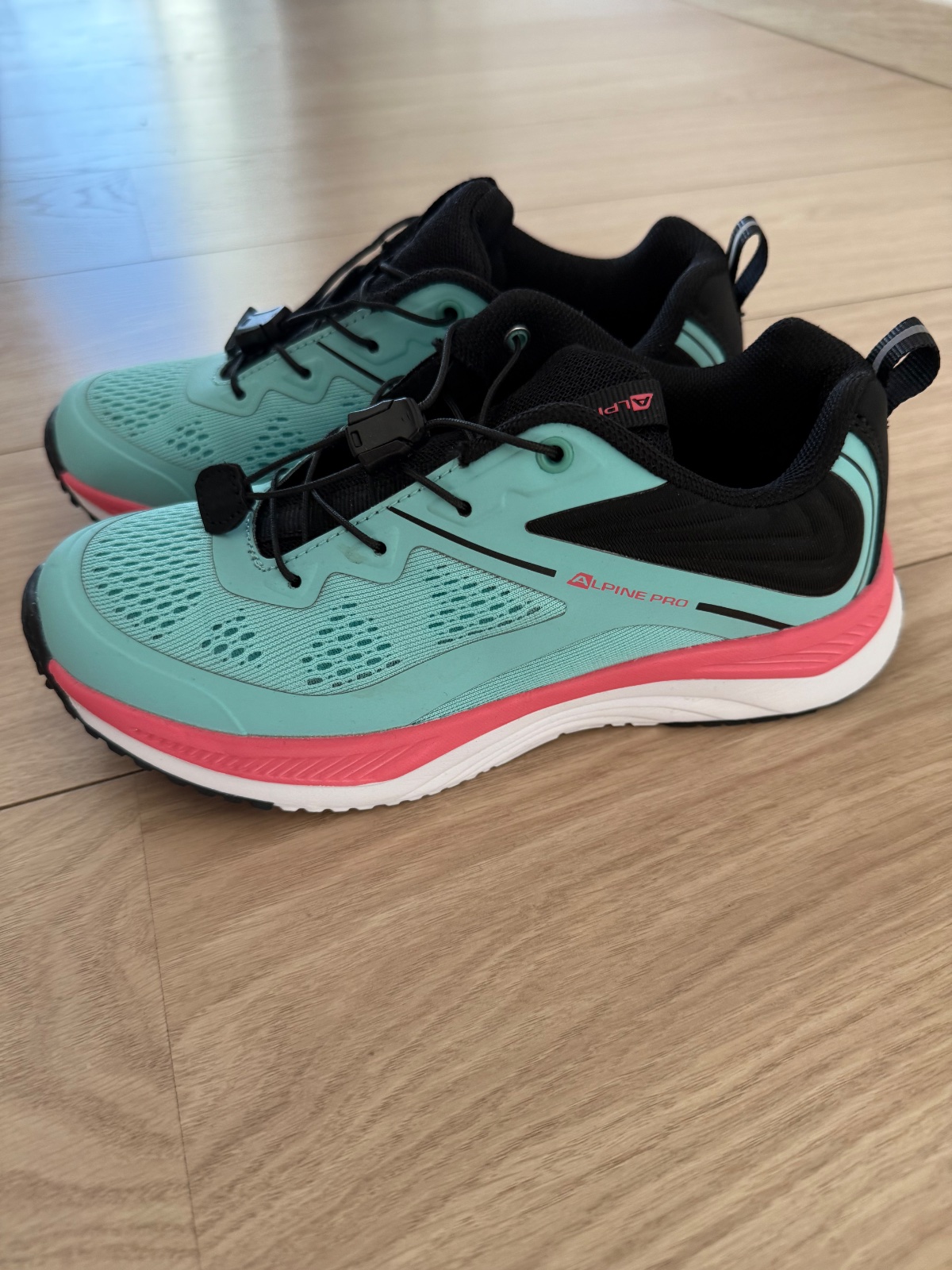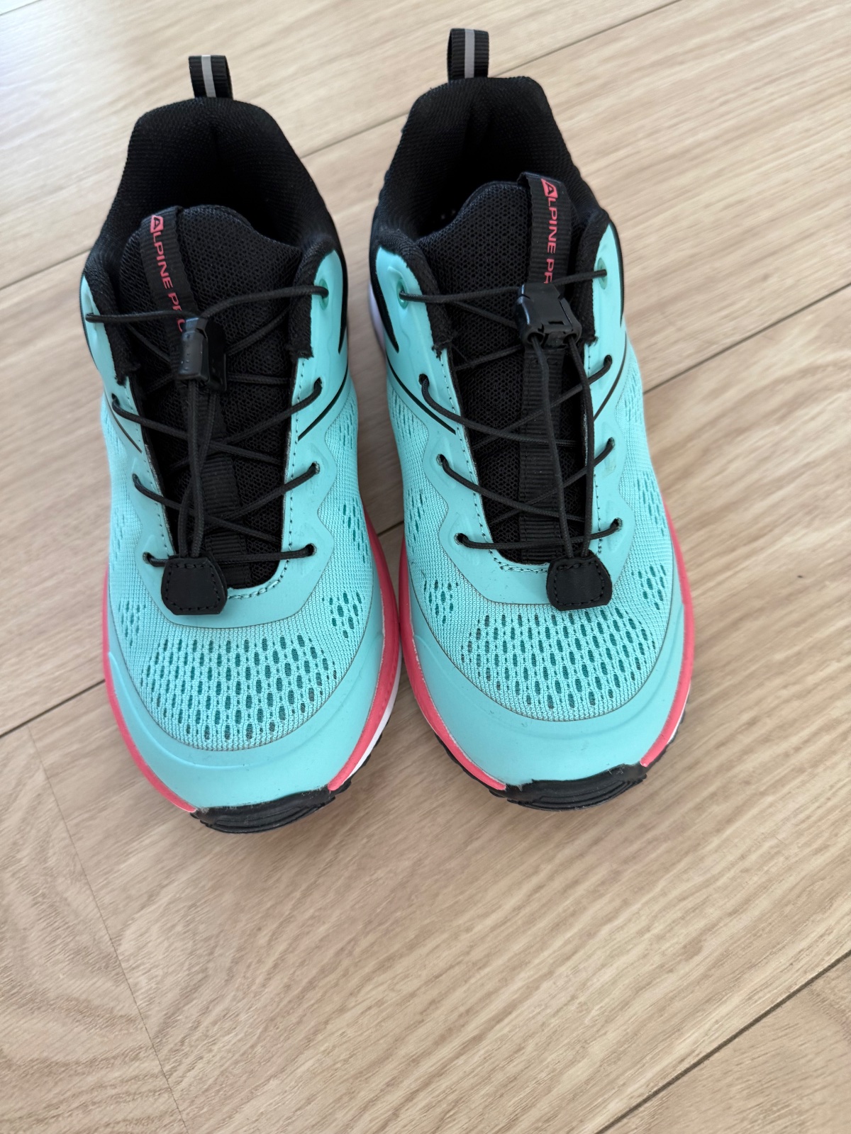Nosene tenisky z Decathlonu, velkost odhadom 34, dlzka stielky 21,5cm. Vidiet na nich znamky nosenia, na pravej spicke je fliacik, ktory sa ale tazko da zachytit fotakom. Cena prisposobena nedostat...