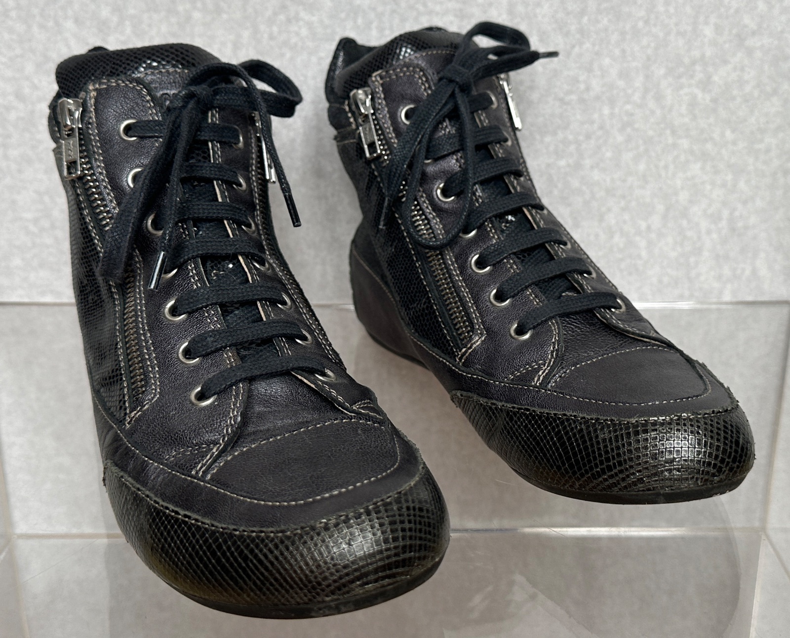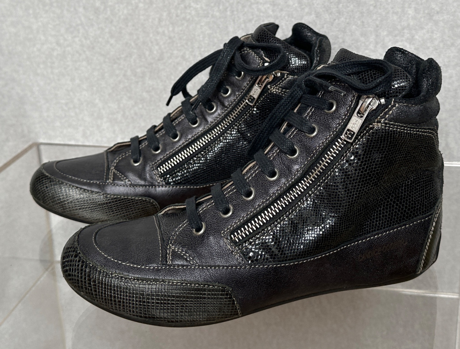 Veľmi kvalitné kožené topánky talianskej značky Candice Cooper. Topánky sú šnurovacie, ale ľahko sa obúvajú cez zipsy po bokoch topánky. Interiér topánky je z jemnej hladkej kože. Päta je vo vnútri zvýšená cca 3 cm - sú veľmi pohodlné. Podrážky sú pružné gumené, šnúrky povoskované.