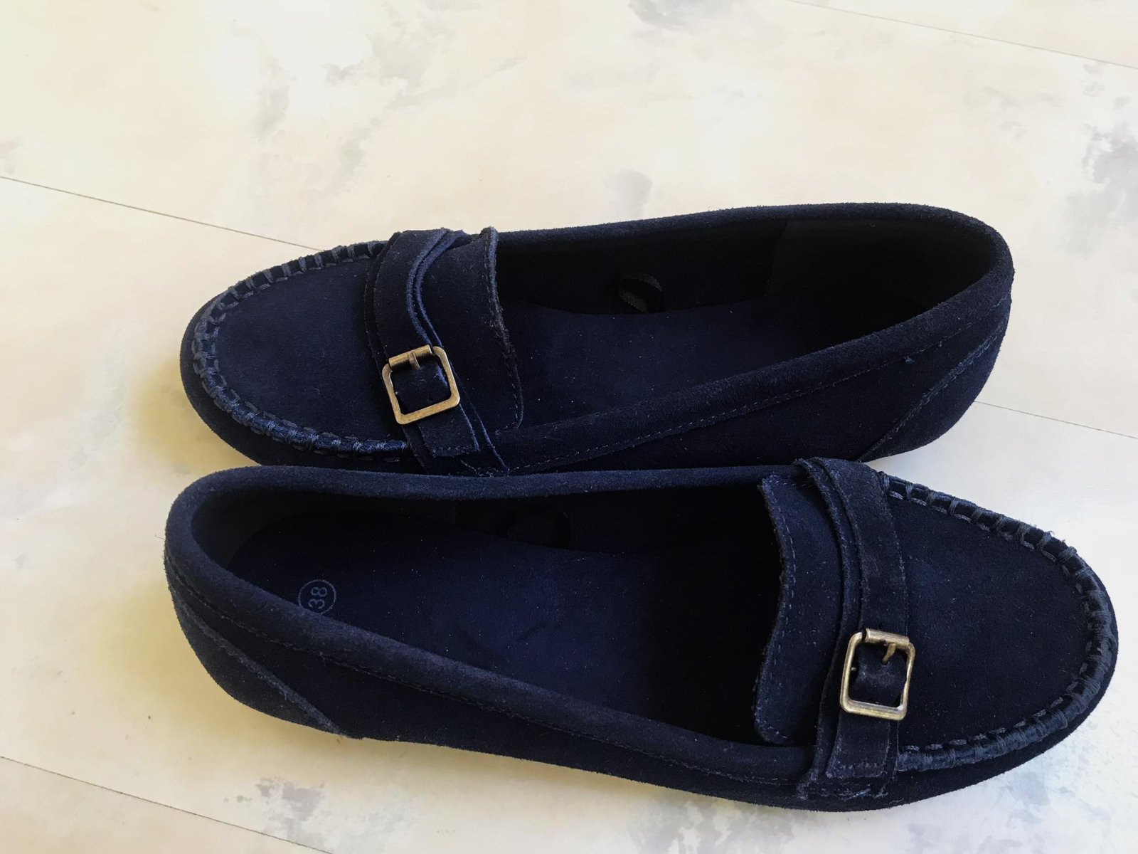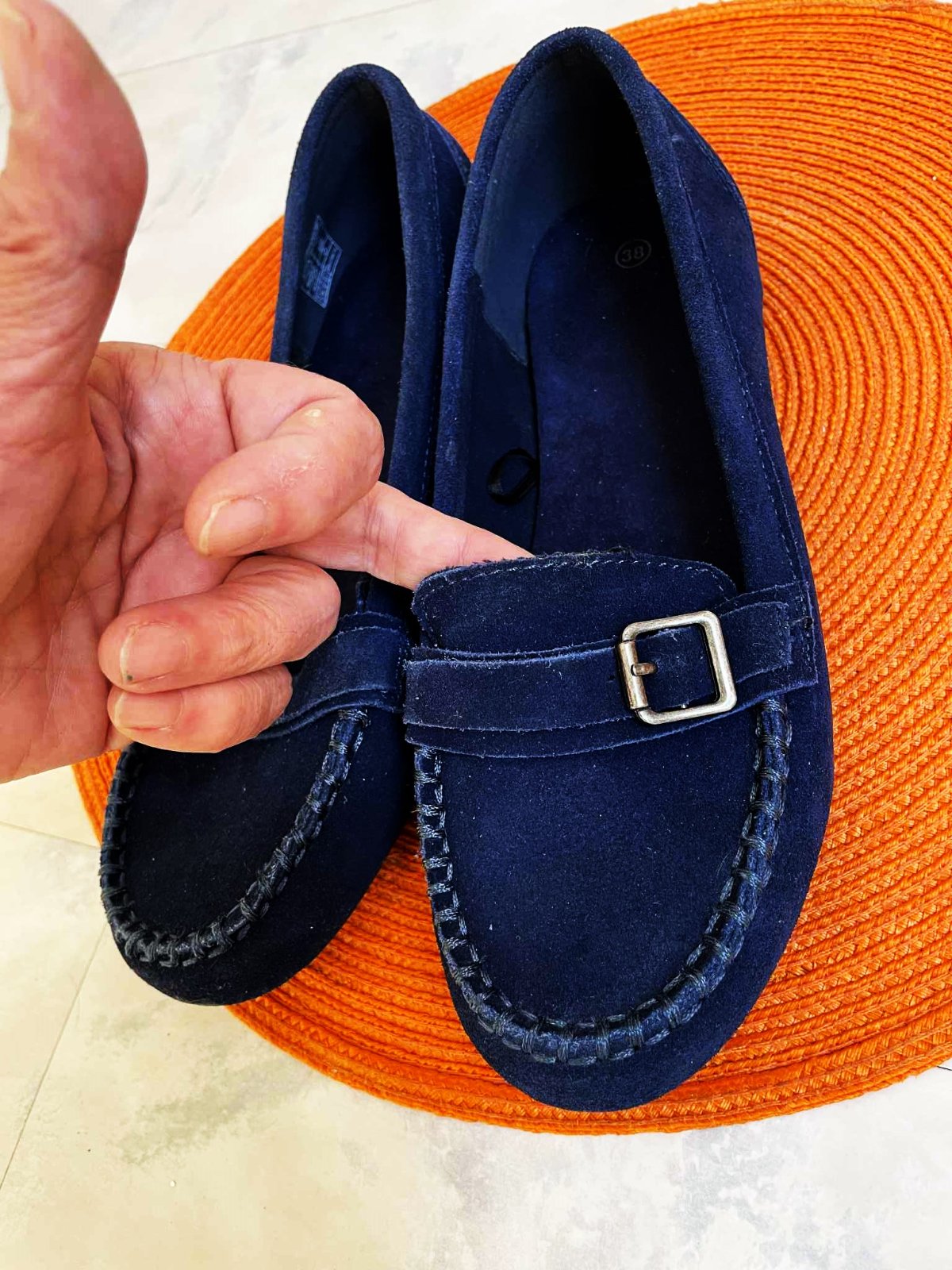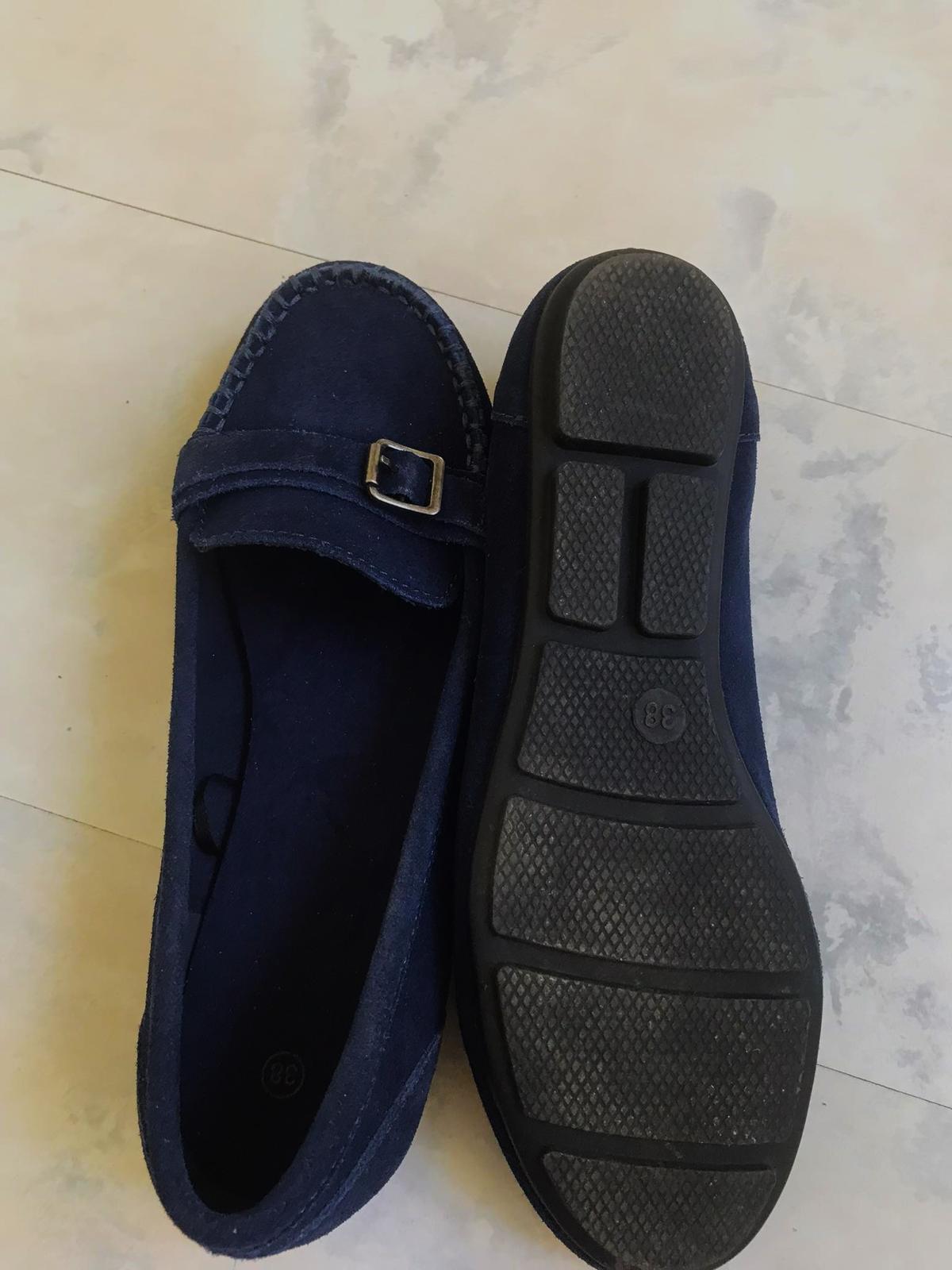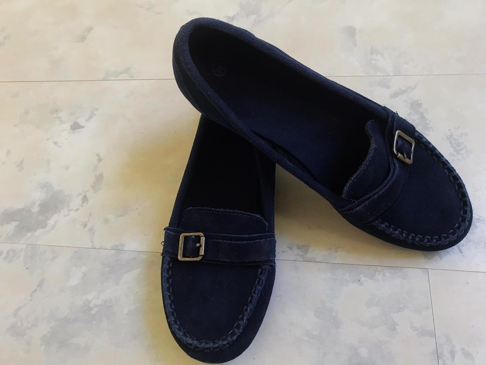 štýlové pohodlné min.nosené trendové ľahké mokasínky,kožené - semiš,krásna sýta tmavomodrá farba,pekne poprešívané,mäkučké,vn. dlžka = 24,3 - 24,5 cm