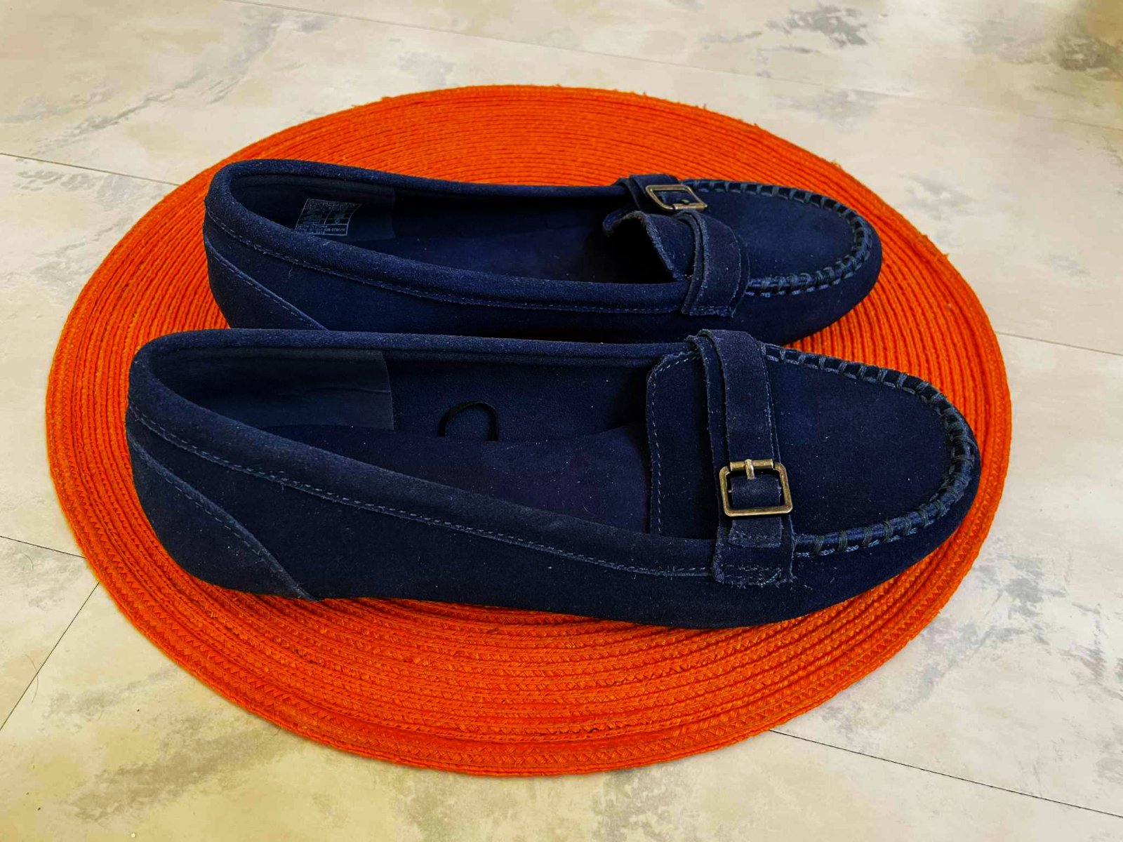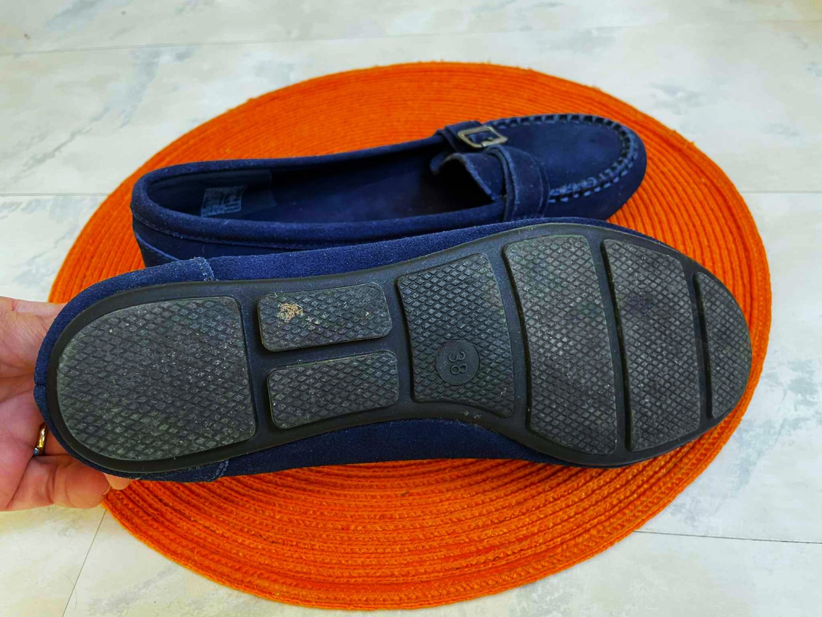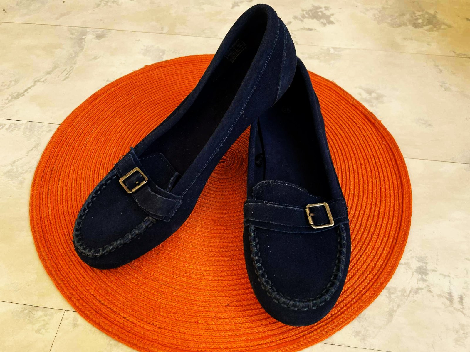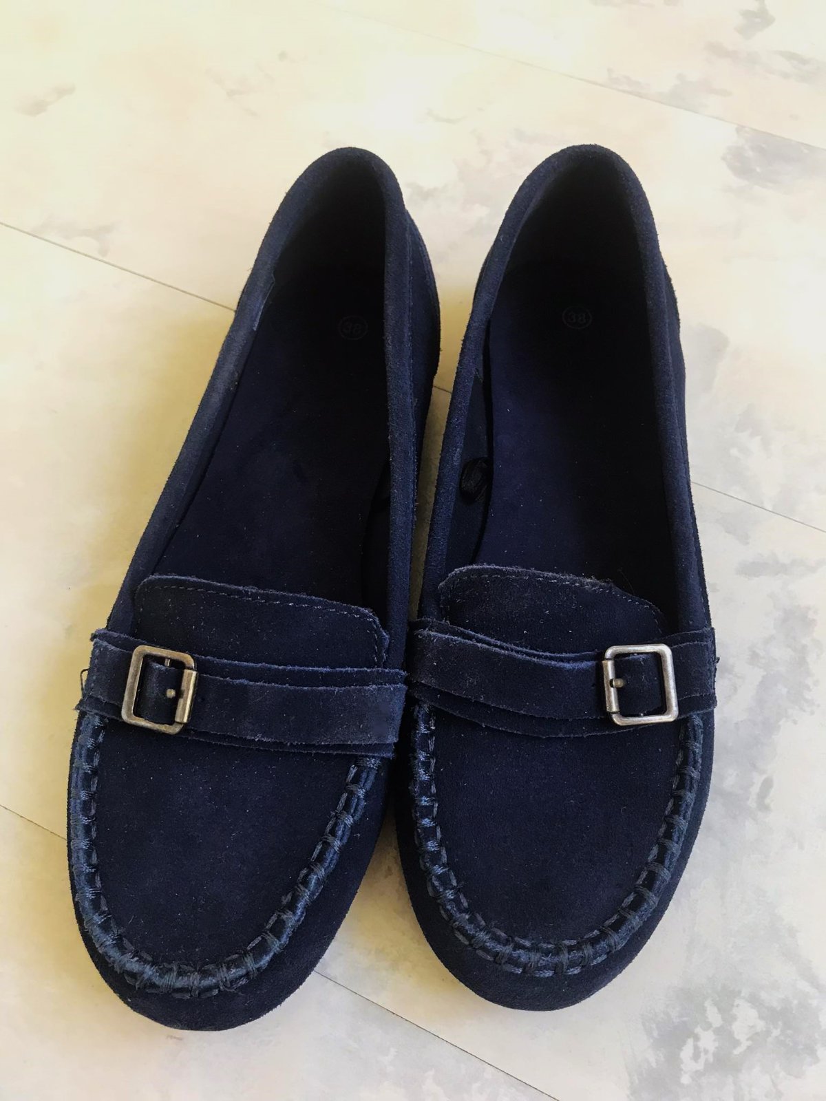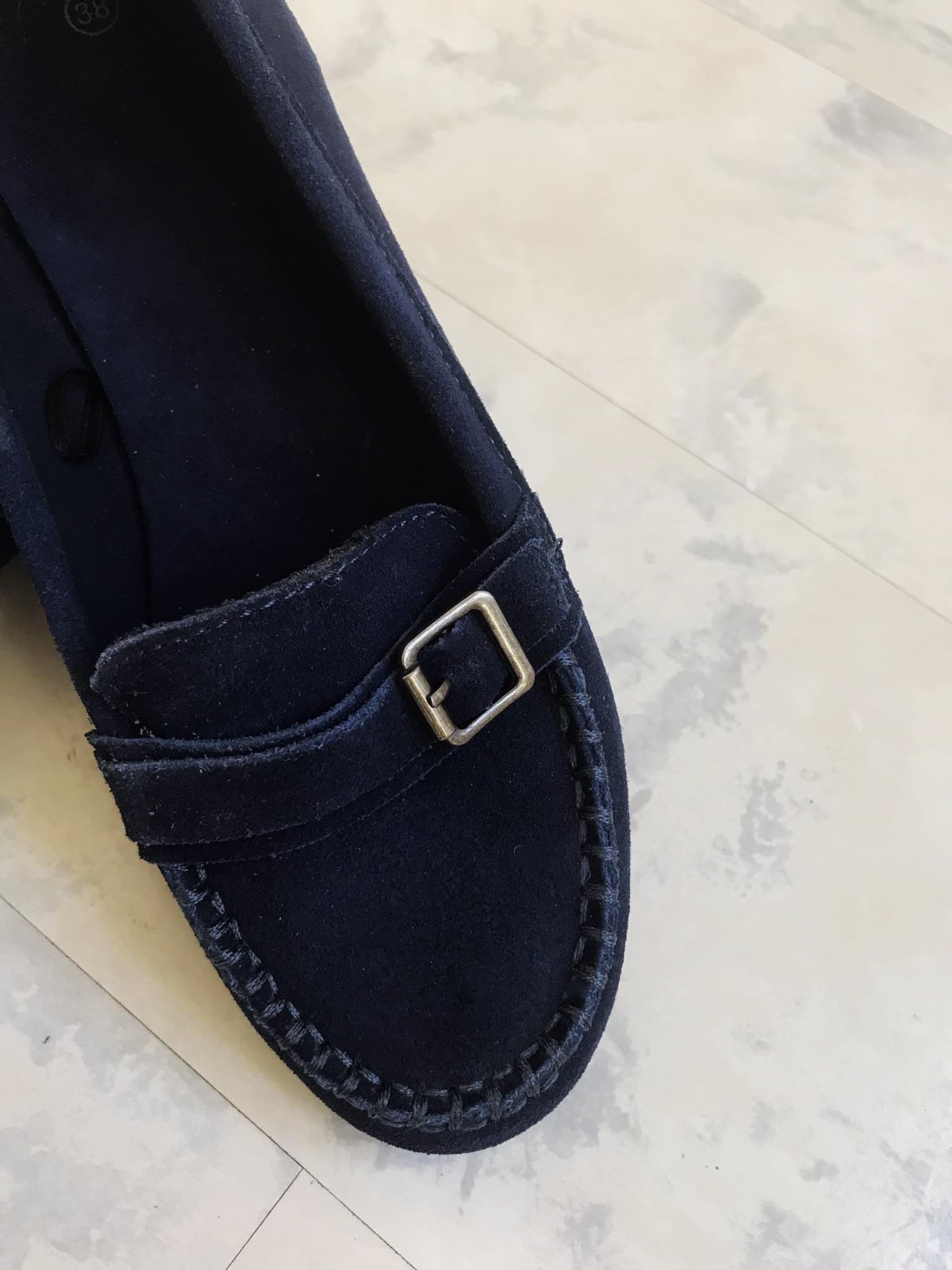 štýlové pohodlné min.nosené trendové ľahké mokasínky,kožené - semiš,krásna sýta tmavomodrá farba,pekne poprešívané,mäkučké,vn. dlžka = 24,3 - 24,5 cm