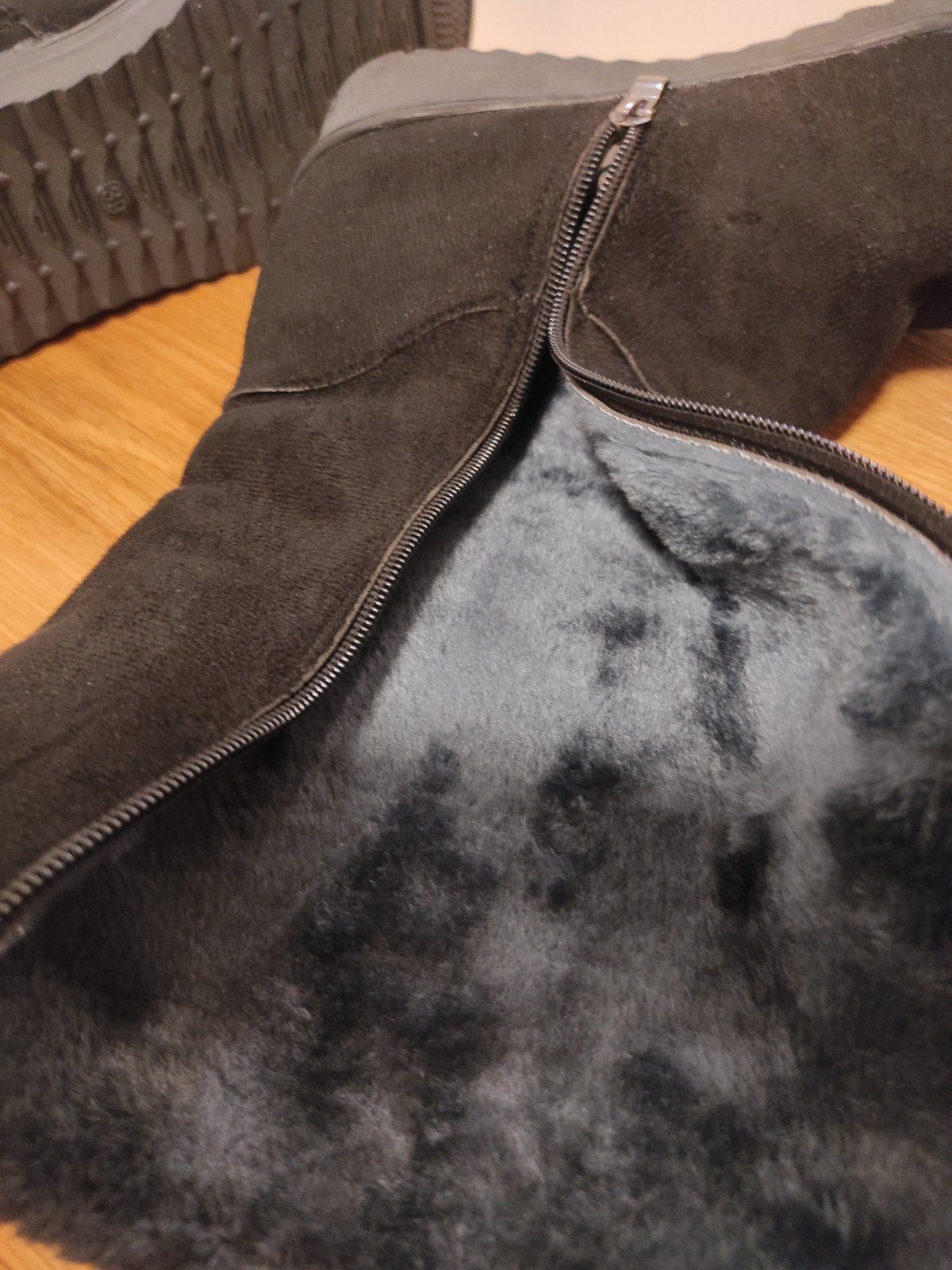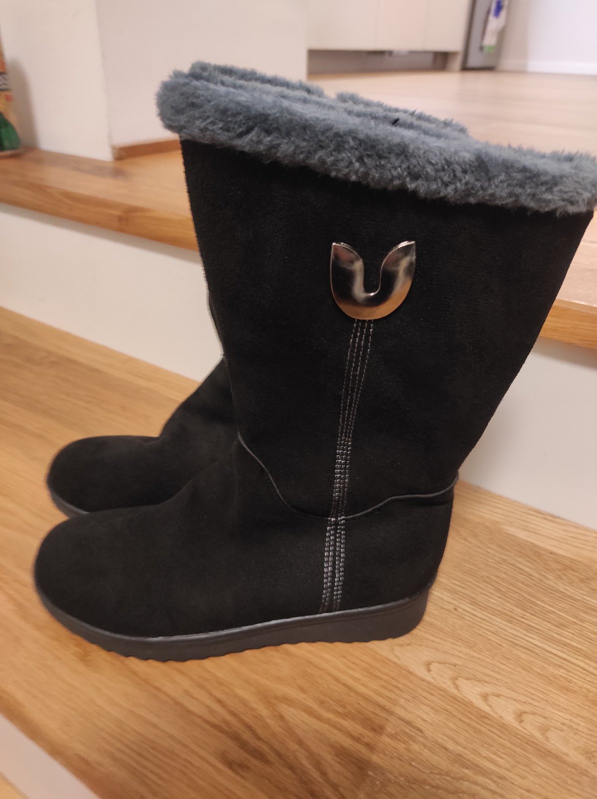 Zimne cizmy zateplene kozusinkou. Vyska tak do pol lytka. Su nenosene, nesadla mi velkost, pisana je 39 ale sedia na 38.