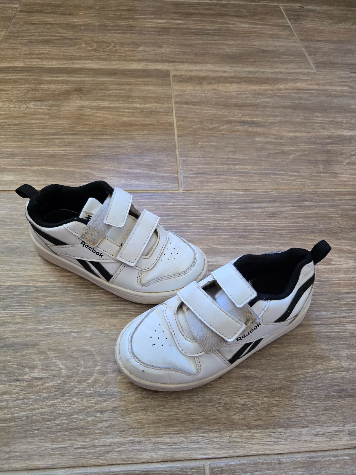 Tenisky Reebok biele s tmavomodro-červenej kombinácii, po jednom dieťati, bežné známky nosenia