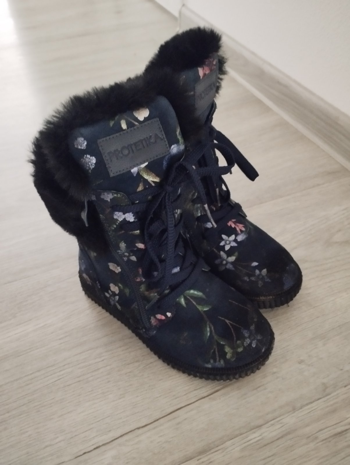 Velmi teplucke, kozene, tmavomodre s potlacou, zimne topanky - Protetika. PC okolo 70e.