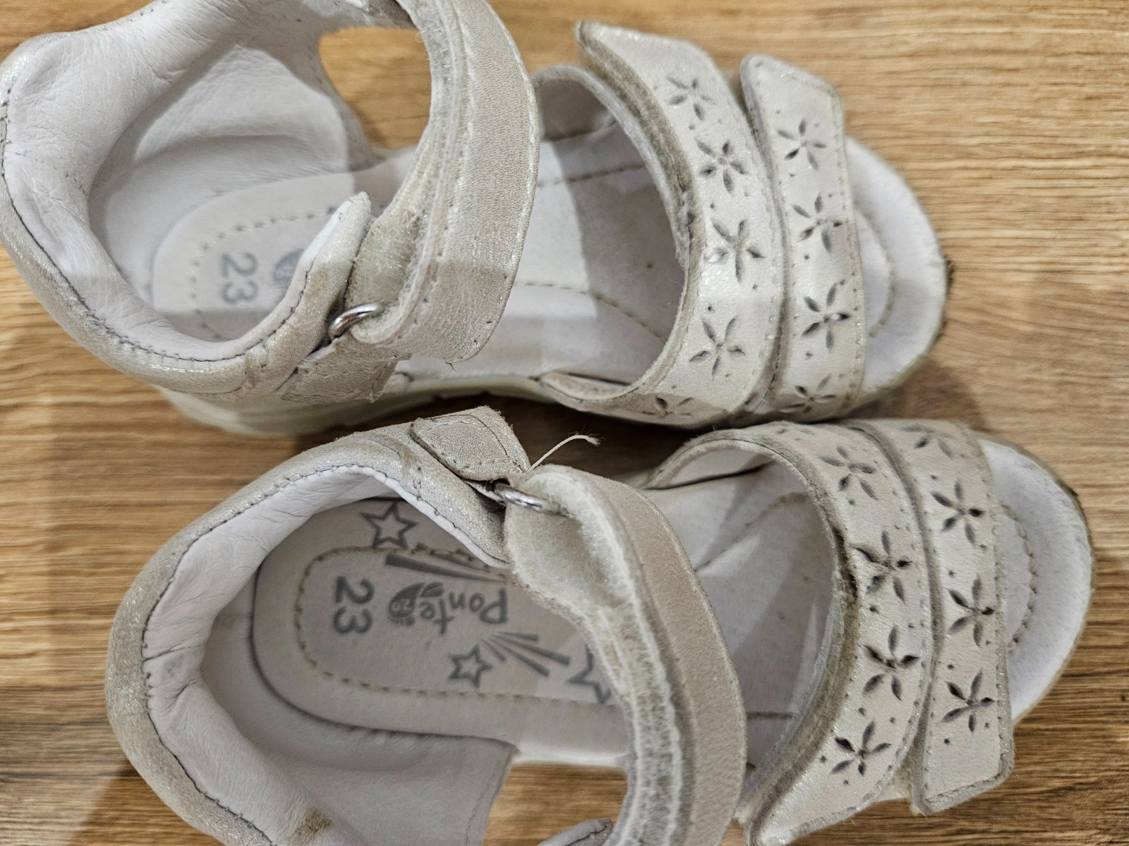 Nosené sandálky, pohodlné, nastaviteľná šírka, suché zipsy držia dobre, reálny stav na foto, ošúchaný stred kvetinky , na jednej topánke trhlinka, ale viac sa to otvoriť nedá, vyzerá to tak ak...