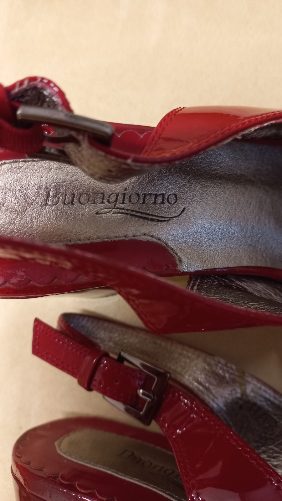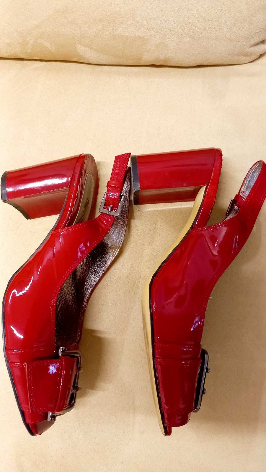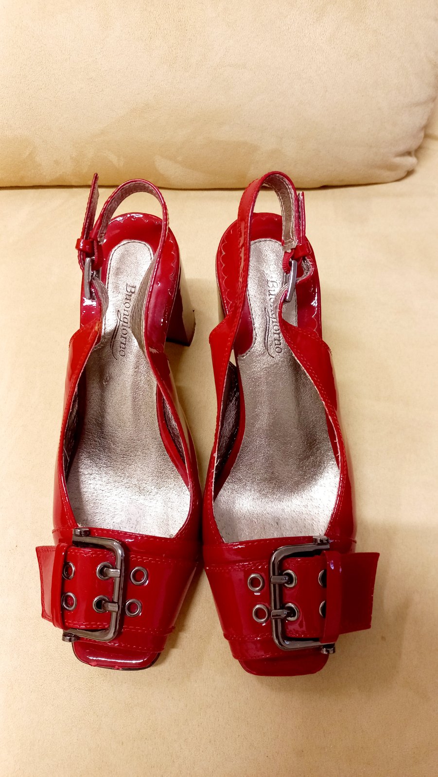 Červené , zaujímavé sandáliky s ozdobnou sponou vpredu, ktorou sa aj redukuje šírka. Veľkosť je 35, no sedia aj na 36 veľkosť. ZN: BOUNGJORNO