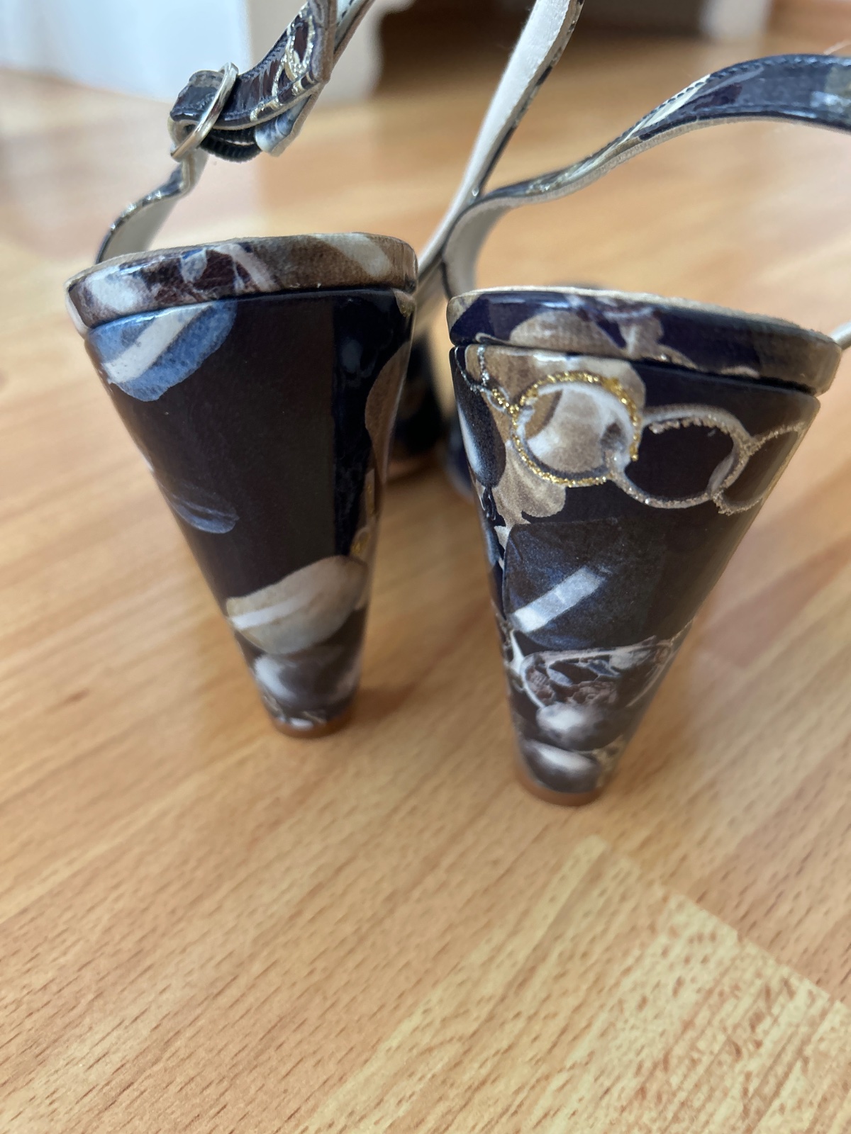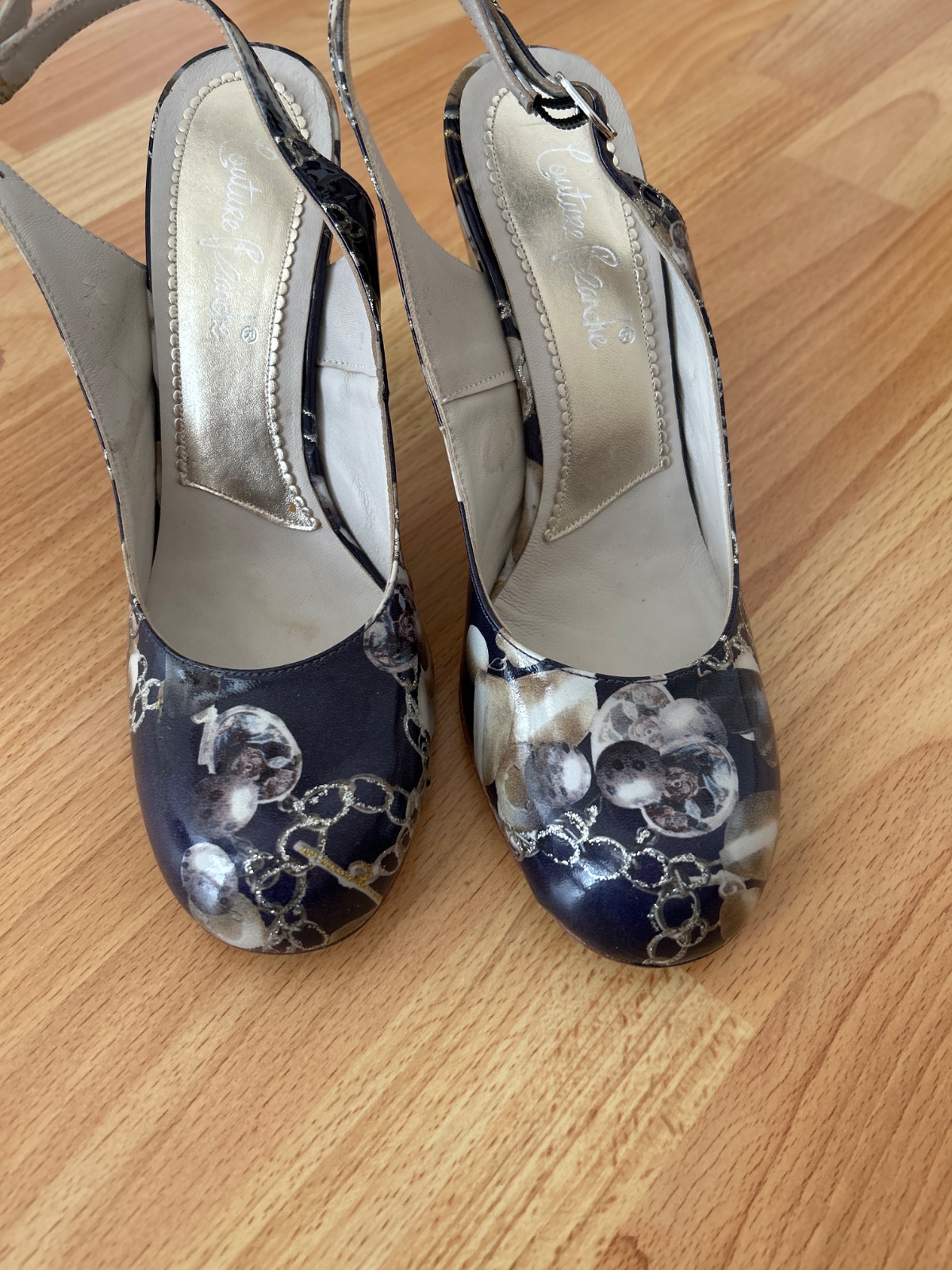 Lodičky zn. Baťa. Veľmi sa mi páčili tak som si ich kúpila. Nosím skôr č.40 takže som s nimi prežila jeden svadobný obrad. Skoro nové. Podklad je tmavomodrý a na vrchu je čierna čipka. poštu neplat...
