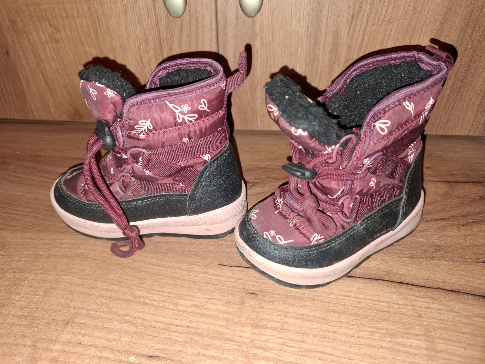 Zimné topánky na šnurovanie, zips. Nosené jedným dieťaťom v dobrom stave, ešte poslúžia. Veľkosť 22/23. Trocha odreté na špičke. Boli nosené jednu zimu.