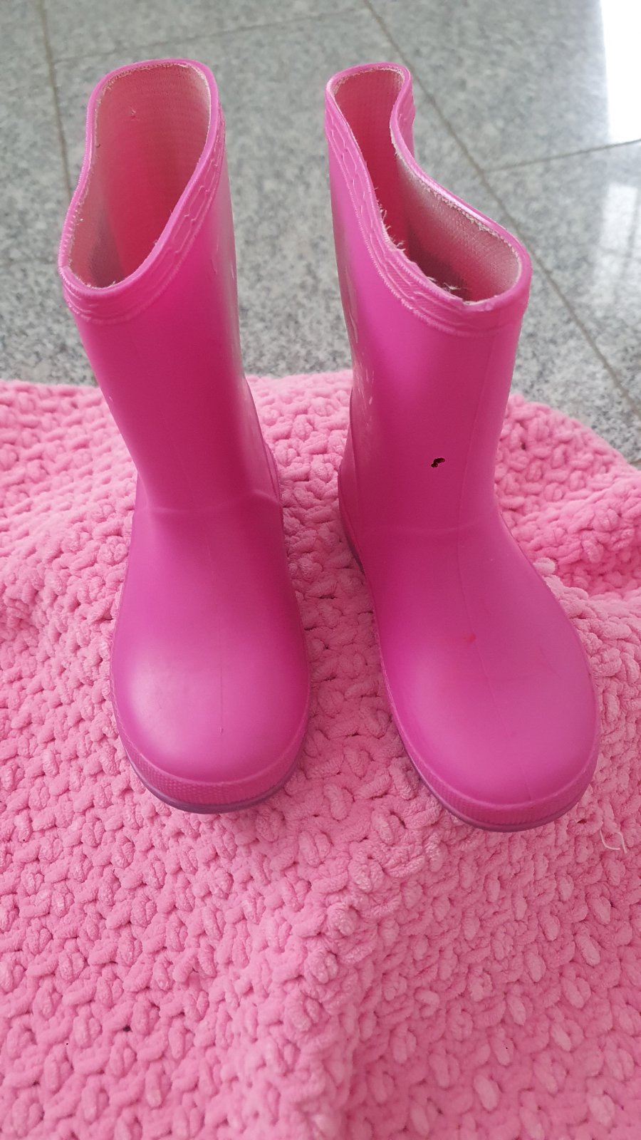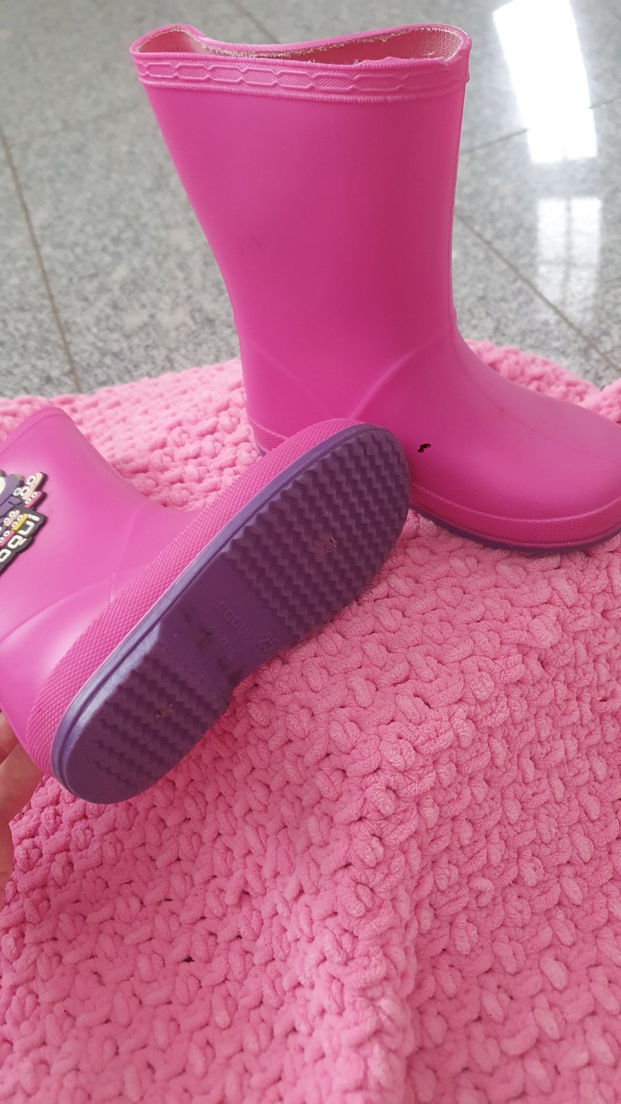 Gumáky sú zo 100% kaučuku, vnútro je bavlnené. Gumáky sú veľmi ohybné, výborne sa v nich detičkám chodí a ľahko si ich samé obujú. * veľk. 21 - priležitostne nosené mojou dcérou, bez poškodení = 5...