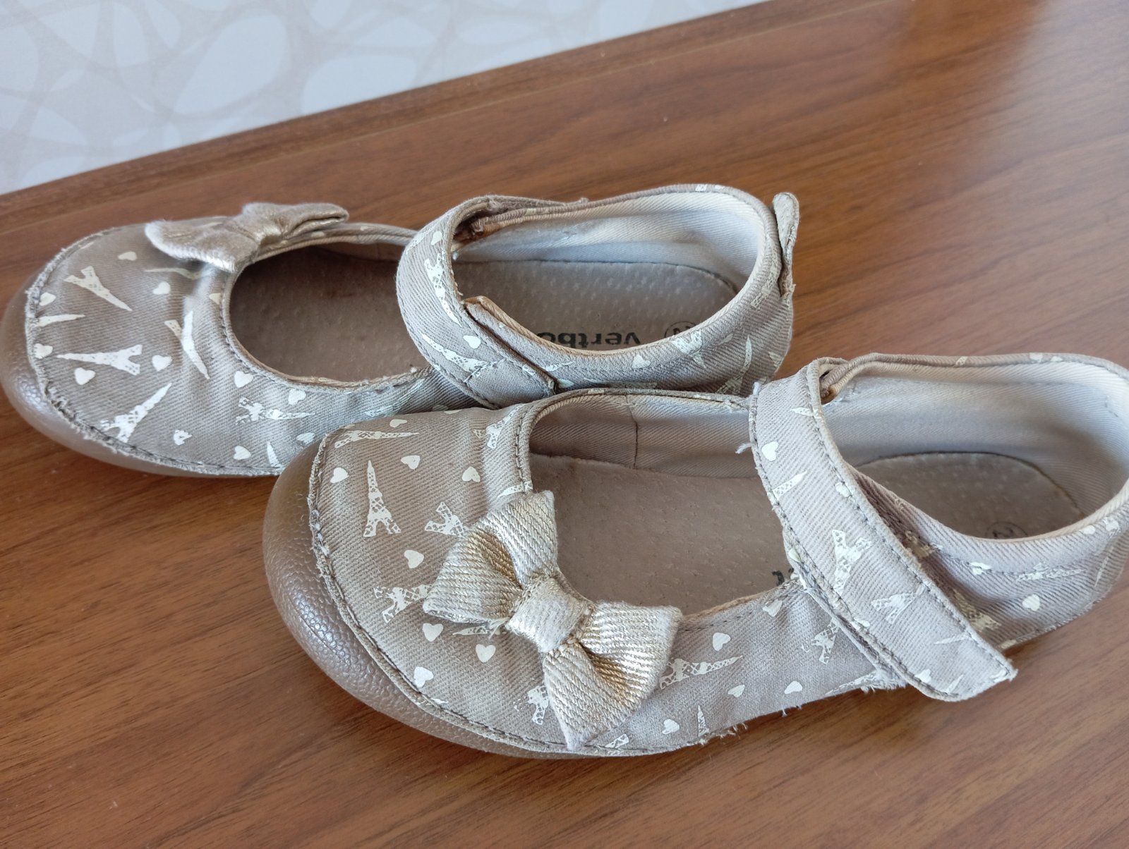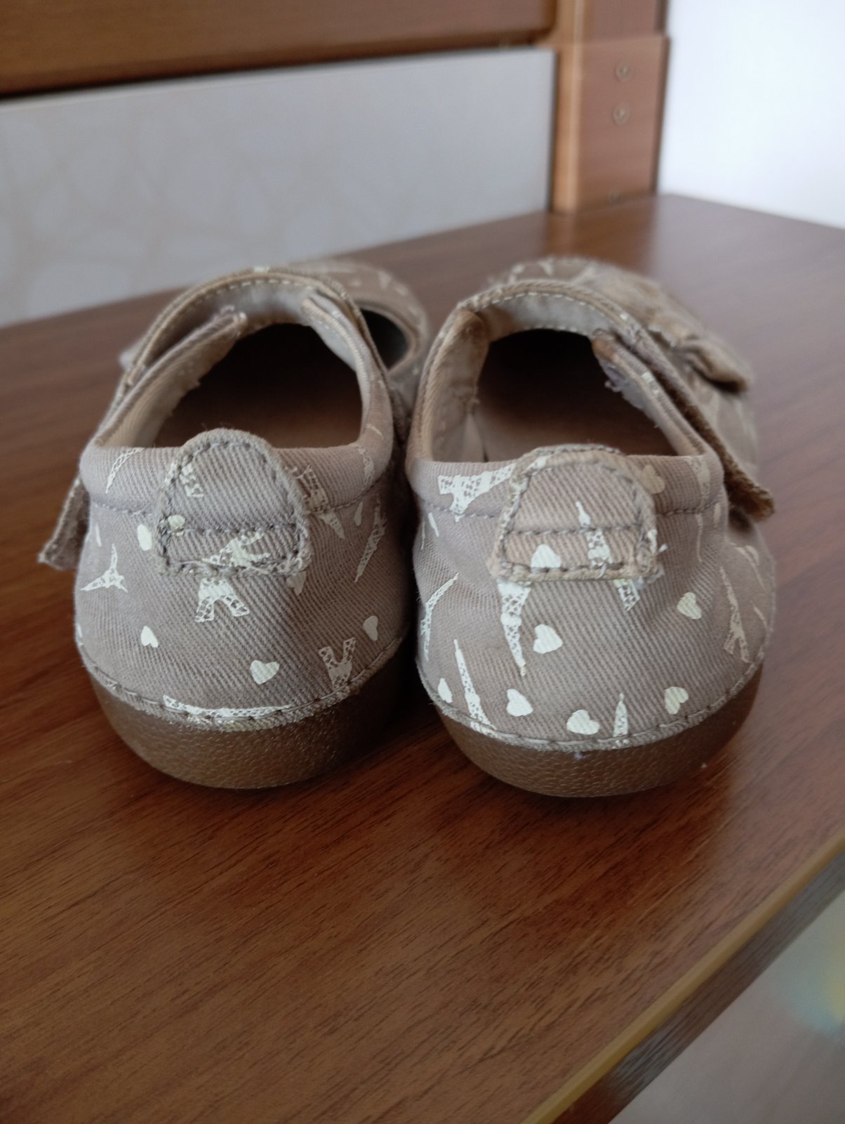 Pohodlné balerínky, predná časť už trochu stmavla. Žiadne poškodenia. Vnútro je kožené, zvonka látka. Eifellovky svietia v tme.