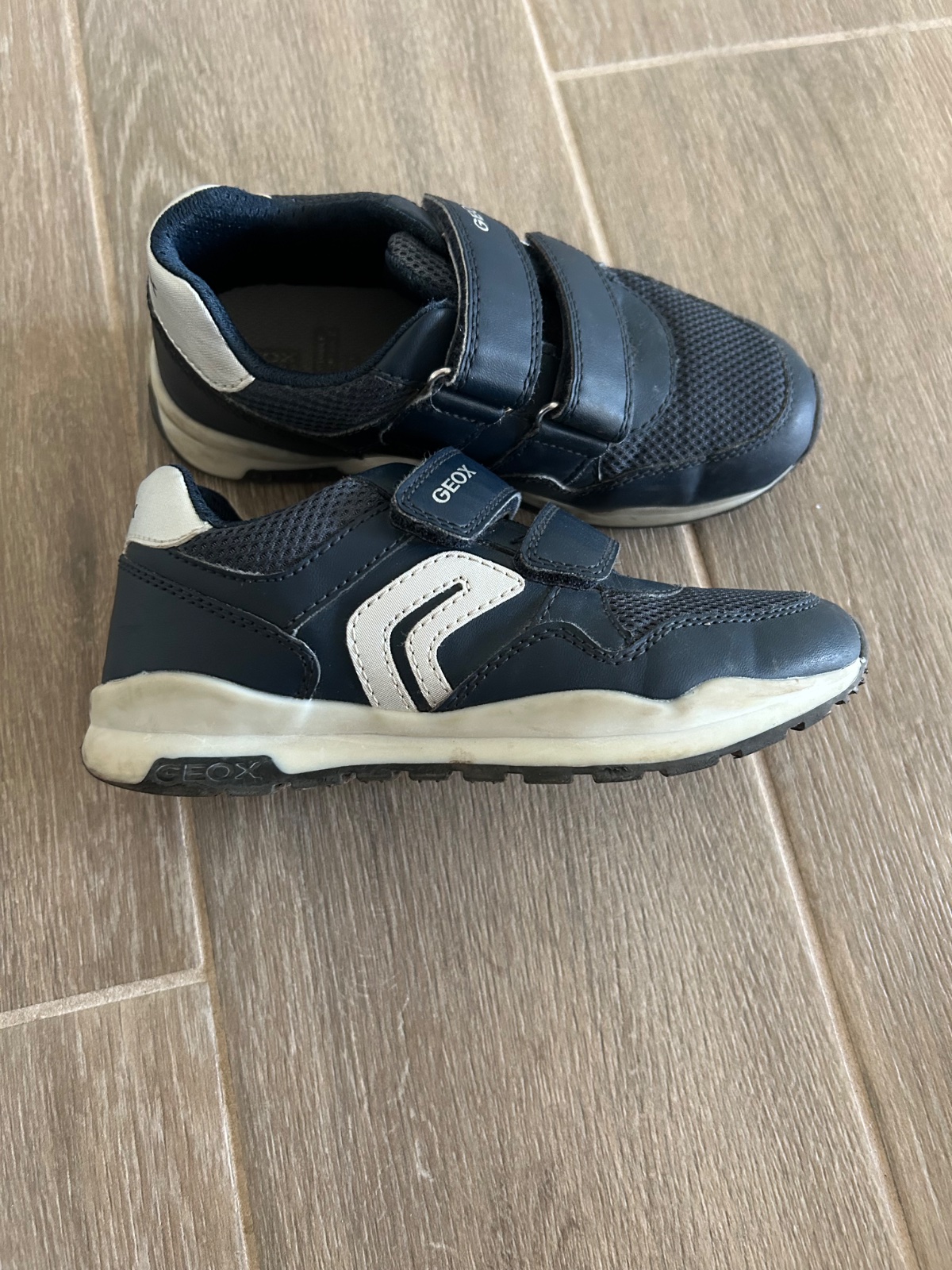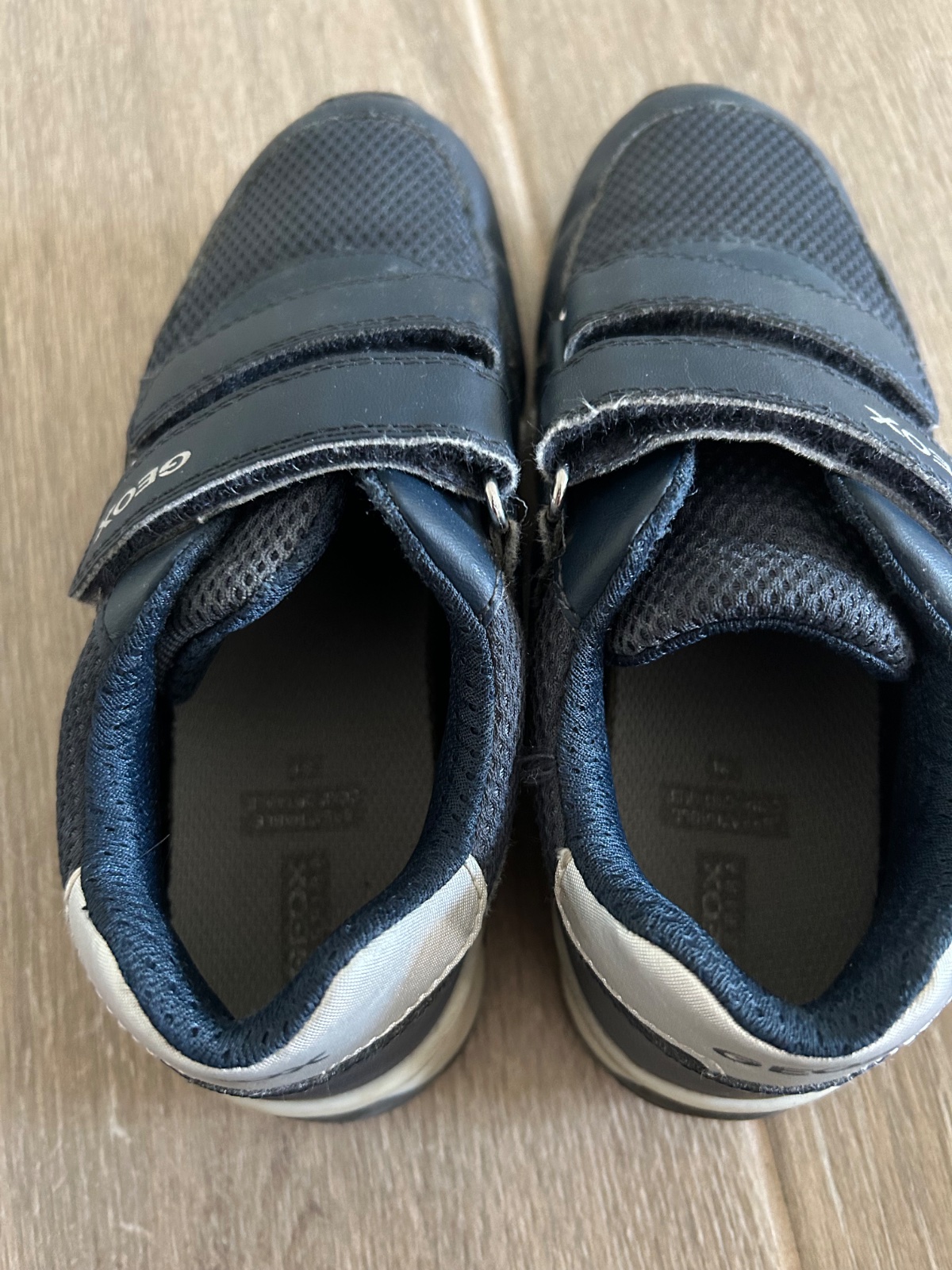 Predám detské topánky GEOX Respira, veľkosť 31 (UK 12,5 / US 13). Farba tmavomodrá/sivá s oranžovými detailmi. Pohodlné, priedušné, so spevnenou špičkou a suchým zipsom. Stav: dobrý, bežné známky n...
