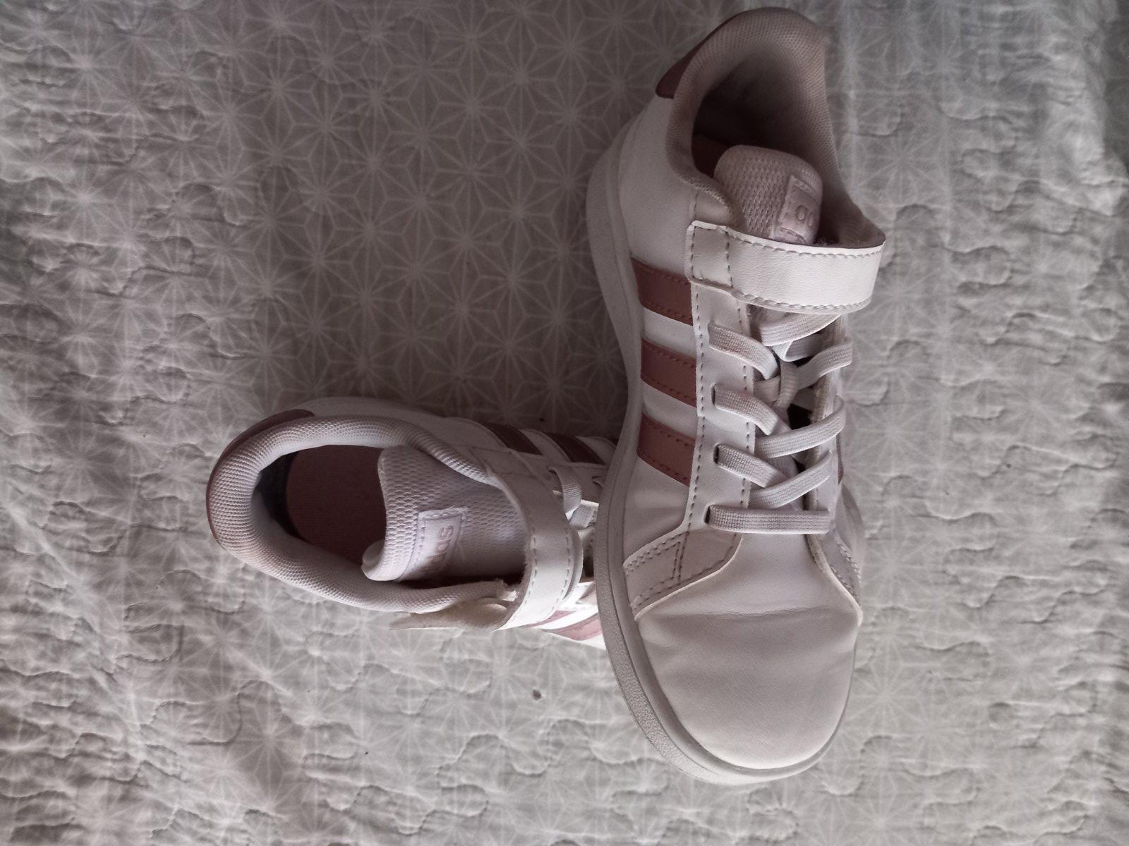 Tenisky na šnurovanie Adidas, s ružovými detailami. Veľkosť č. 33. Opotrebenie podľa fotografií.