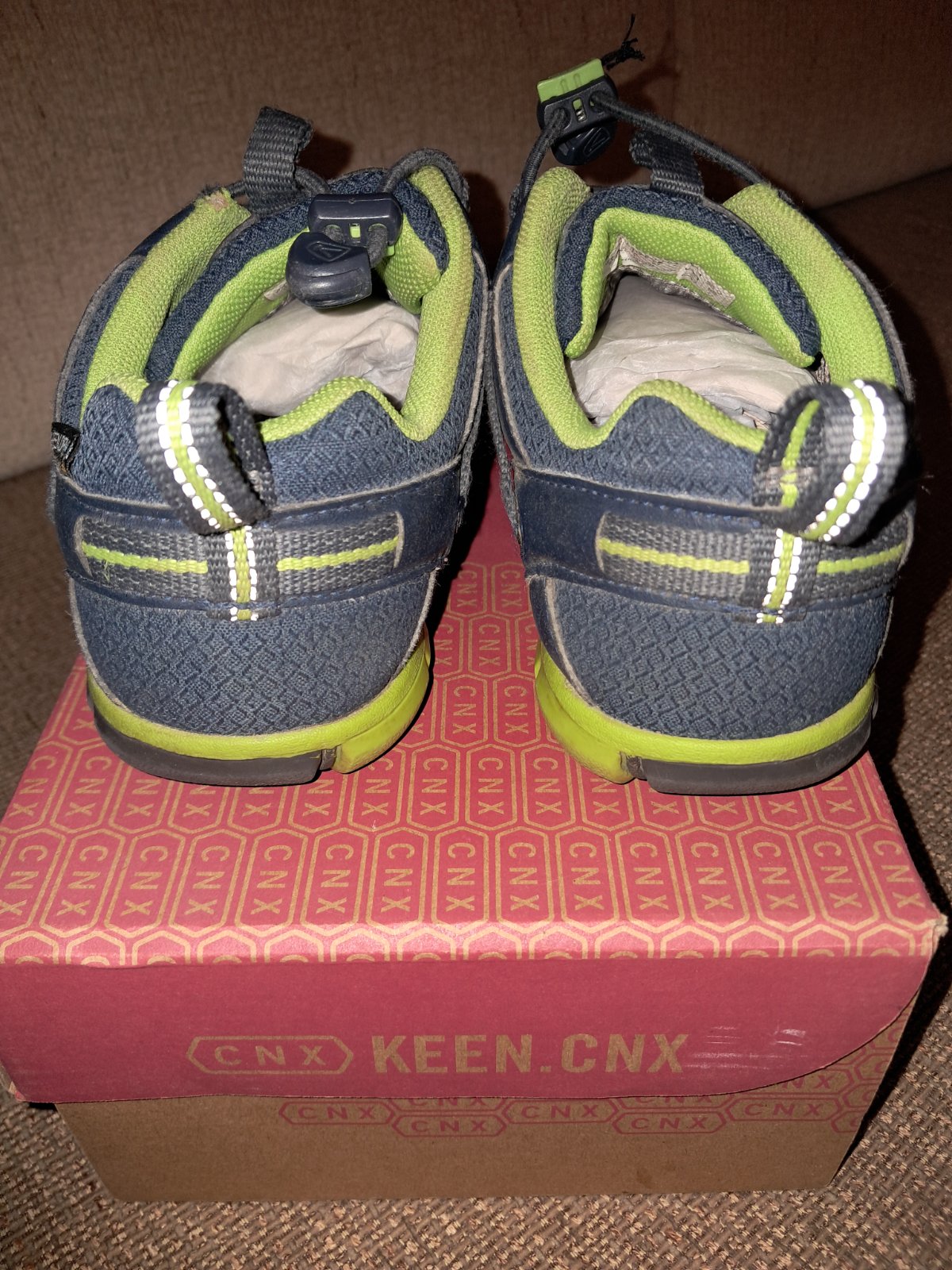 Predám tenisky Keen Chandler CNX WP - waterproof, veľkosť 34Je to alternatíva barefoot. Majú nepremokavú membránu, takže podržia bežnú mokrotu. Nosili sme ich do neskorej jesene. Sú impregnované. mme Sú v dobrom stave, kupované nové, nosené 2 deťmi. Jedna šnúrka je vytrnutá z plastového držiaka, ale je tam spravený uzlík, takže v pohode to drží - viď foto. Predám za 15 Eur + poštovné.
