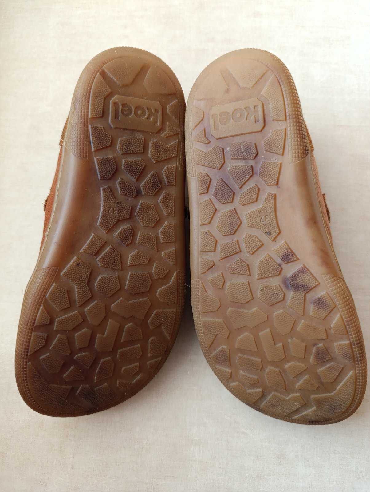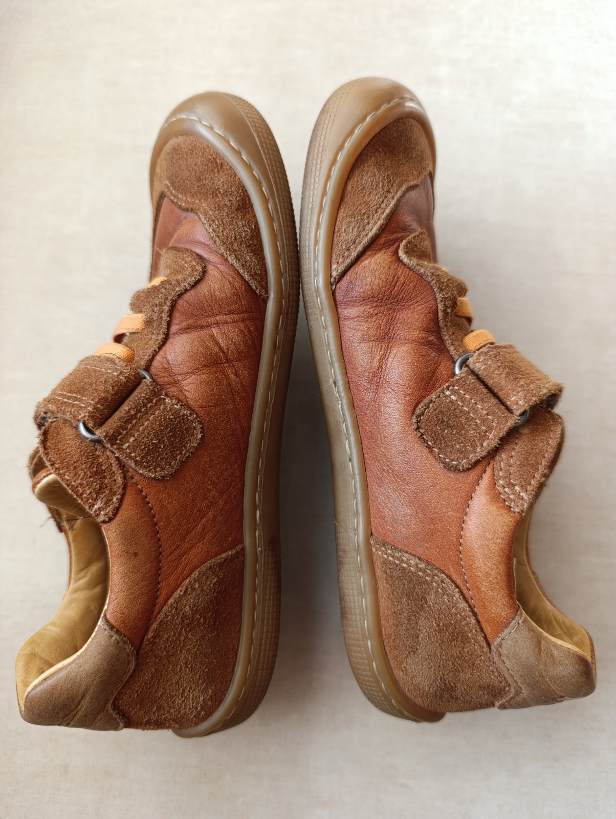 Kožené barefoot tenisky vo veľmi peknom nosenom stave, bez výrazných vád, len bežné známky nosenia. Jediný nedostatok je ten, že suché zipsy už držia slabo, čo je zohľadnené v cene. Aj napriek tomu sa dajú nosiť bez problémov, lebo gumičky držia dobre.