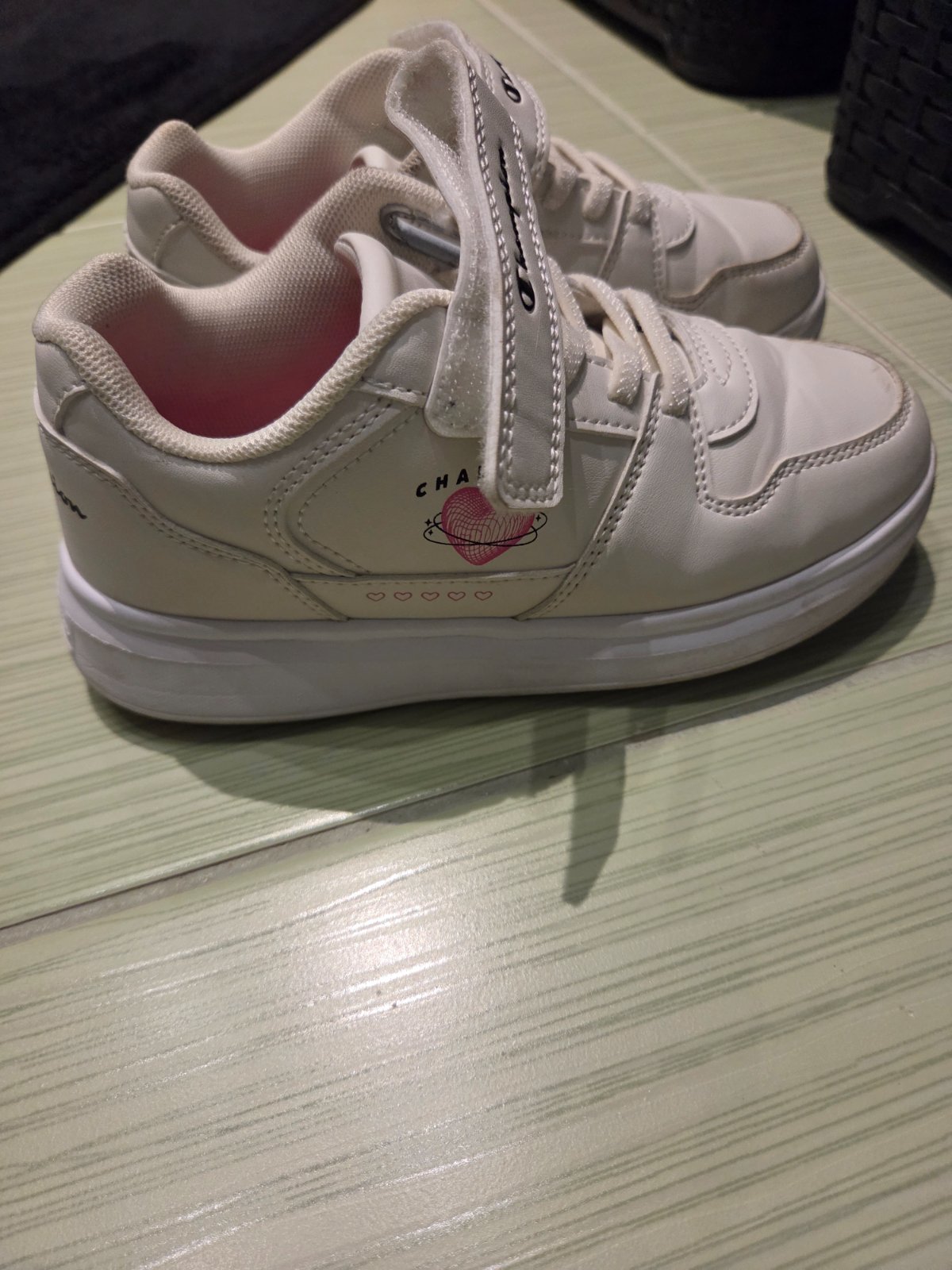 Nosený stav. Iba jedno poškodenie, na ľavej teniske je odpadnutá aplikácia - viď posledné foto. V tme svietia.