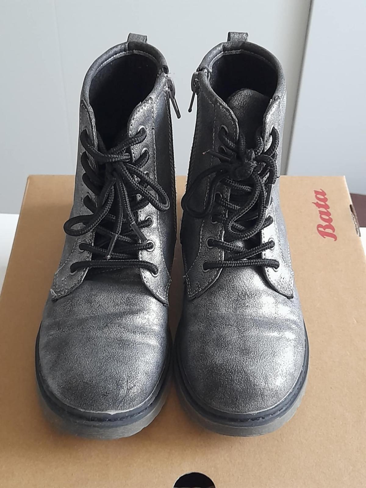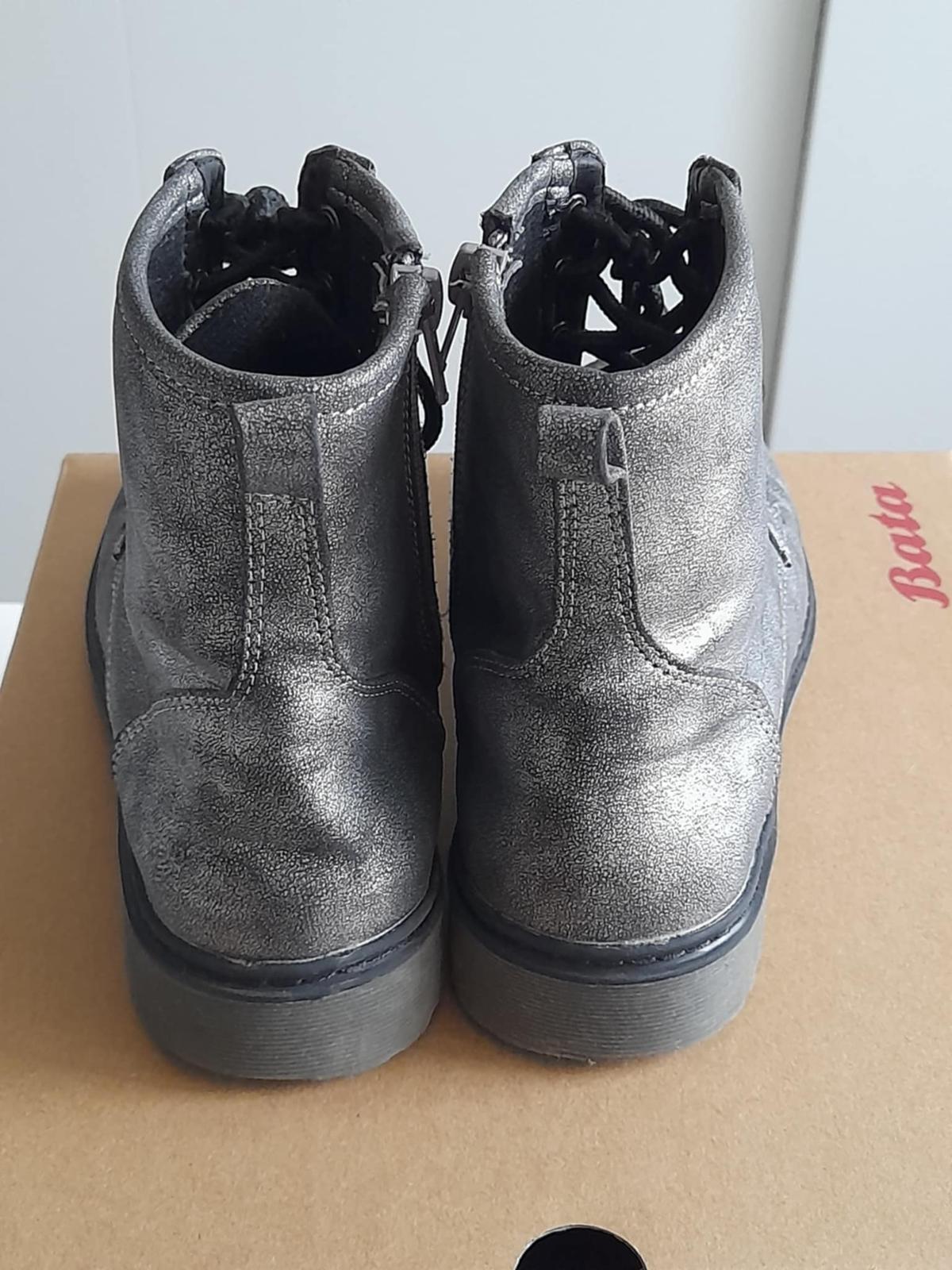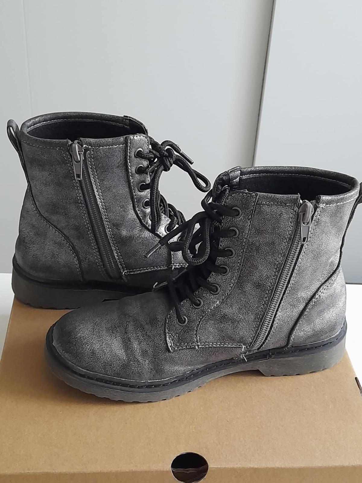 Pekne topanocky bez snurovania, na gumu a suchy zips. Drobne oskreniny, zatrela som fixkou. Pohodlne a pekne. Nosene len 2 mesiace. VD cca 22 - 22,3cm.