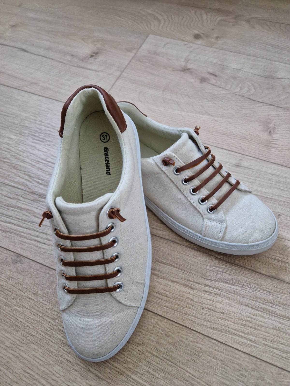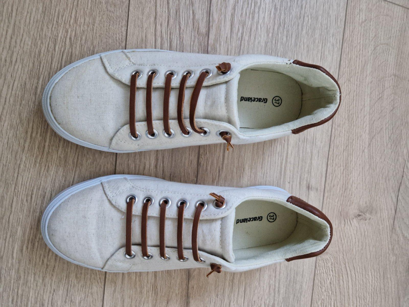 Bezove platene tenisky s kozenkovymi hnedymi doplnkami a s gumenou podrazkou. Raz obute. Vyska podrazky 2cm. Dlzka vonk 25,8cm. Vnut dlzka cca 24cm. PC 25e.