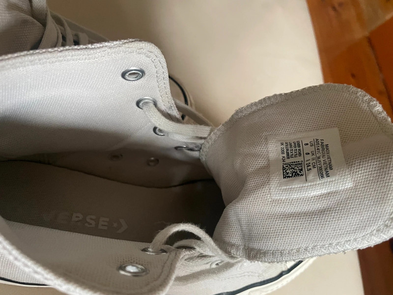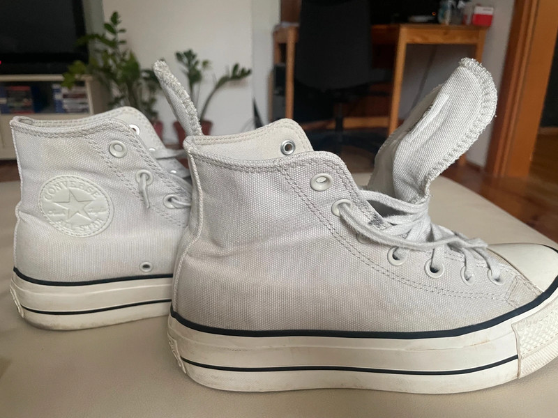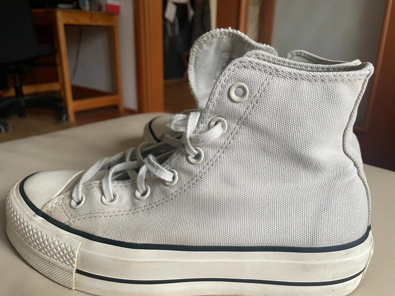 Látkové converse tenisky na platforme, kotníkové. Svetlošedej farby. V dobrom stave, na Ďalšie nosenie, bez vád a poškodení, okrem tých, že boli nosené. Materiál je hrubší ako na bežných converse teniskách, preto vhodné aj na jeseň či teplú zimu. Rovnako sú pevnejšie.Kupované začiatkom roka. Dajú sa využiť celoročne.