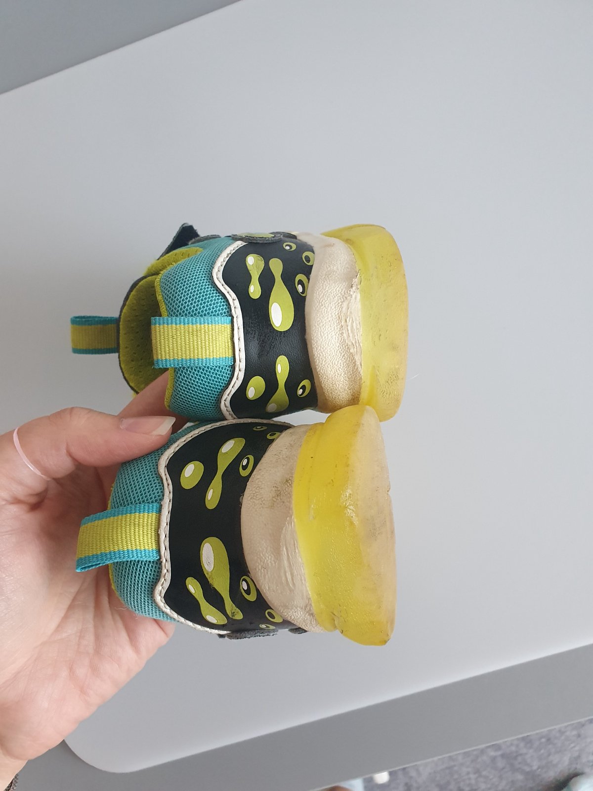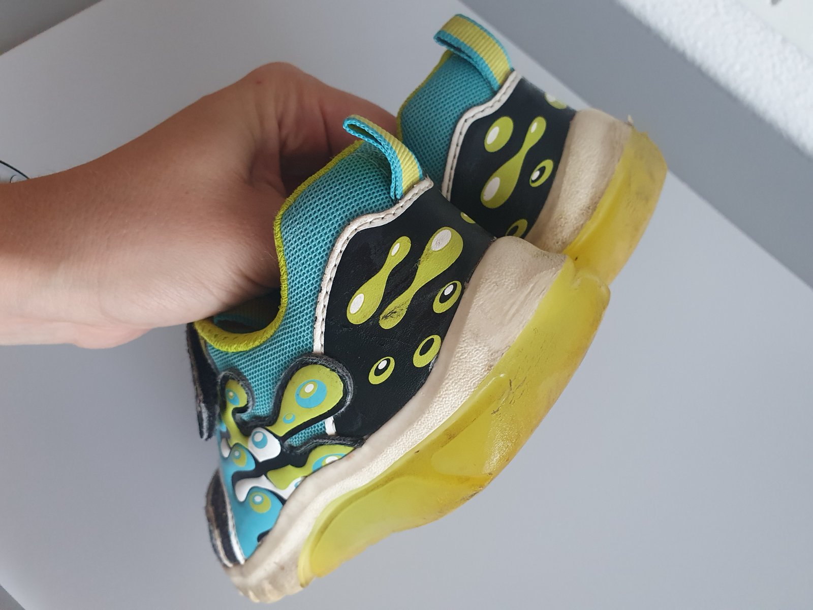 Nosene intenzivne, stale svietia, syn vsak zodral podrazku, pri pate, ked brzdil na kolotoci nohou vid foto...pri chodeni to nevadi a nepoznat to..