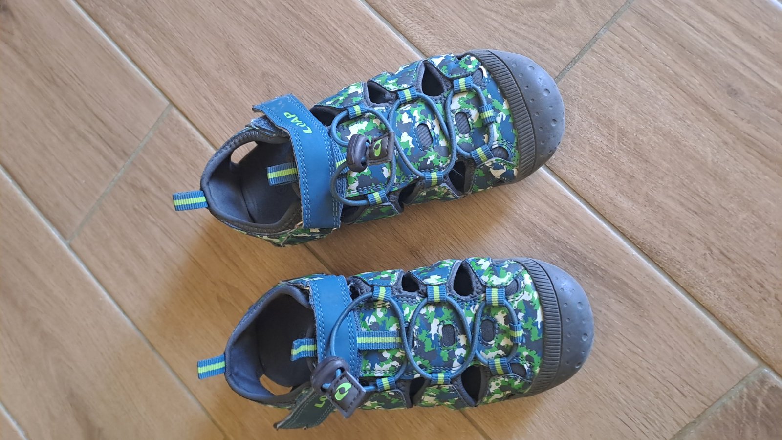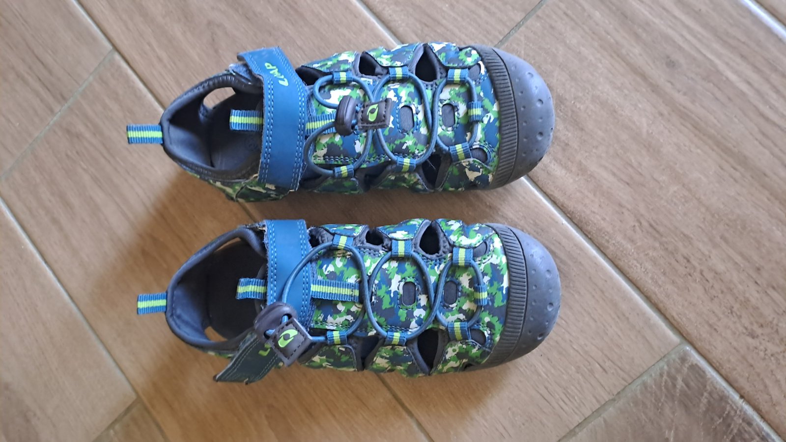 Predám v peknom nosenom stave sandálky bez poškodenia. Suché zipsy držia pevne. Dĺžka vnútornej časti (tyrkysová časť) je 21,5 cm.