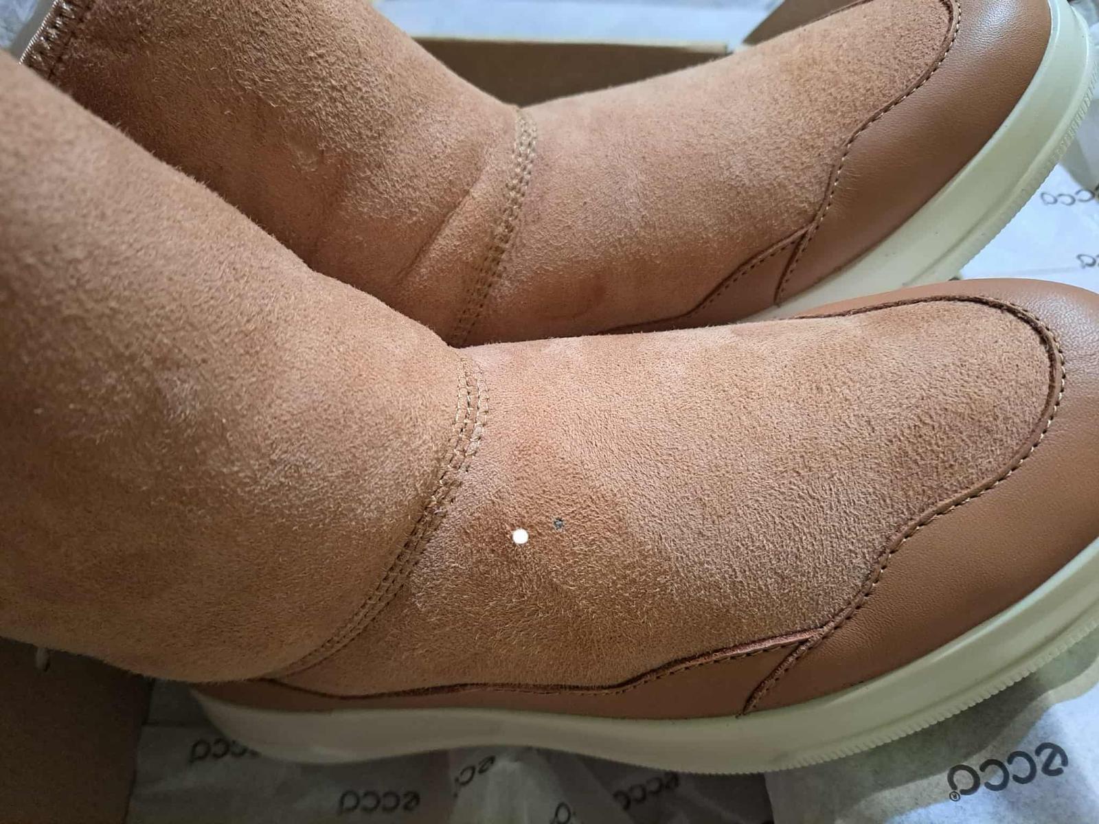 Krásne nové semišové čižmičky značky Ecco.kvalitne,lahulinke, kožušinka vo vnútri,teplučke.na foto vid malinká bodka ...nie tá biela...to je len ukážka,že kde....ani ju nie je poriadne vidieť,ale upozorňujem.PC 169€