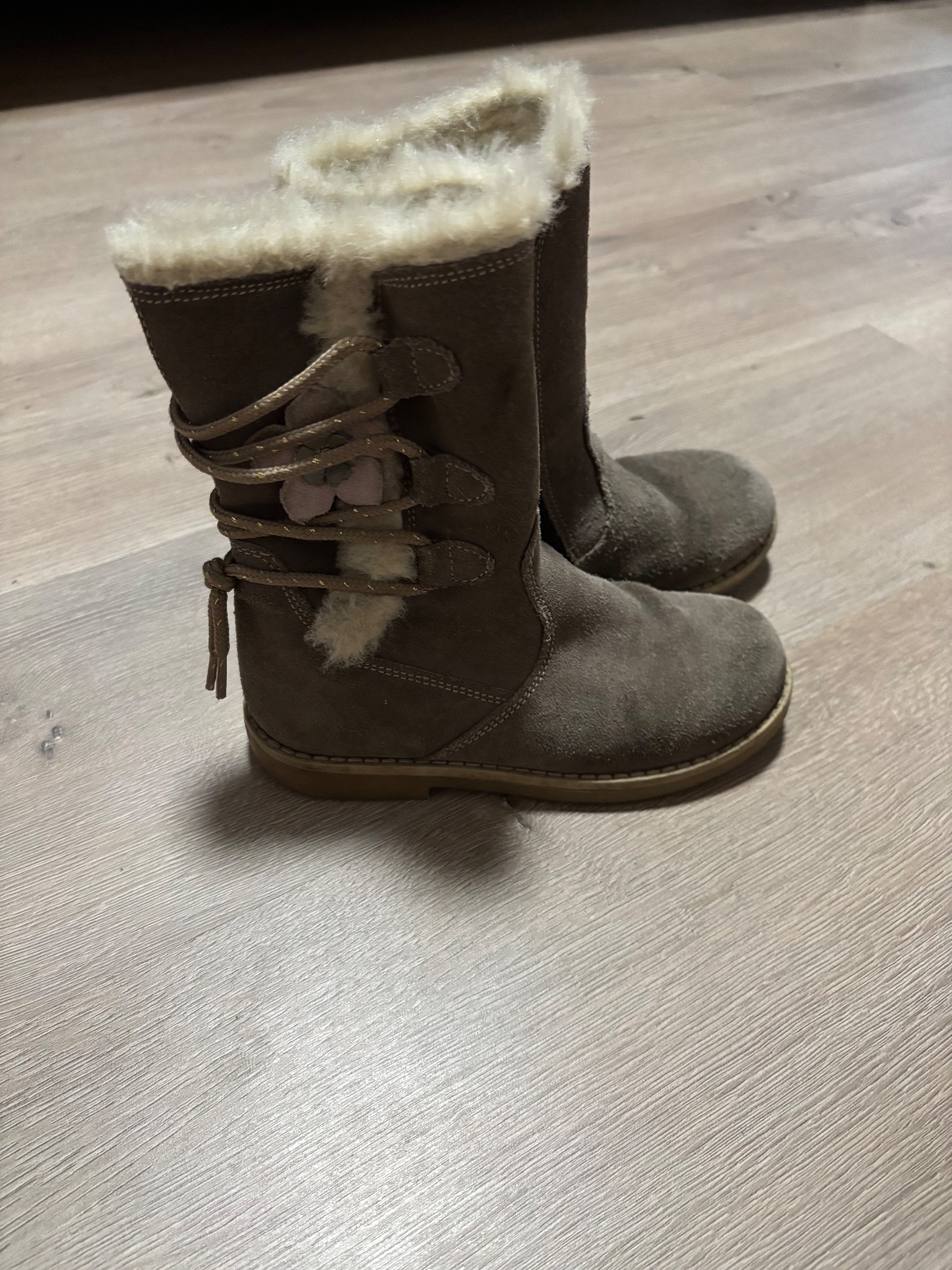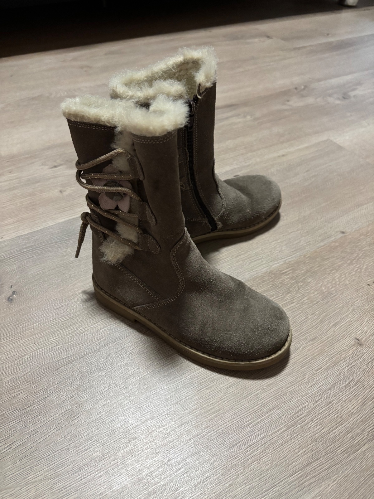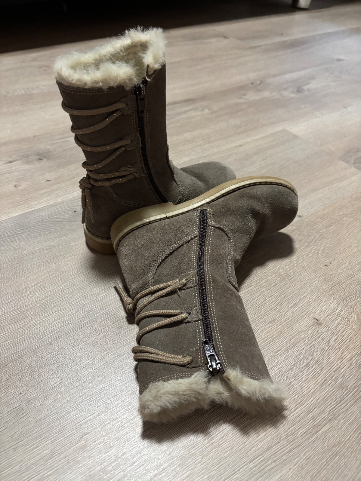Pekné, horčicovo-hnede čizmy pre dievčatko. Spodna časť je z brúsenej kože, vrch od členku vyššie je textilna imitácia. Zvnútra sú zateplené umelou kožušinkou. V predu na spodu vidno fliačky, ktoré...