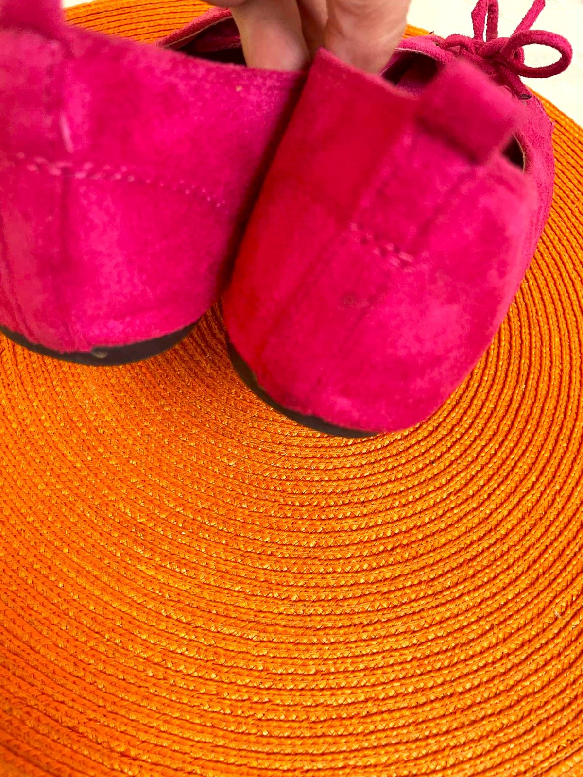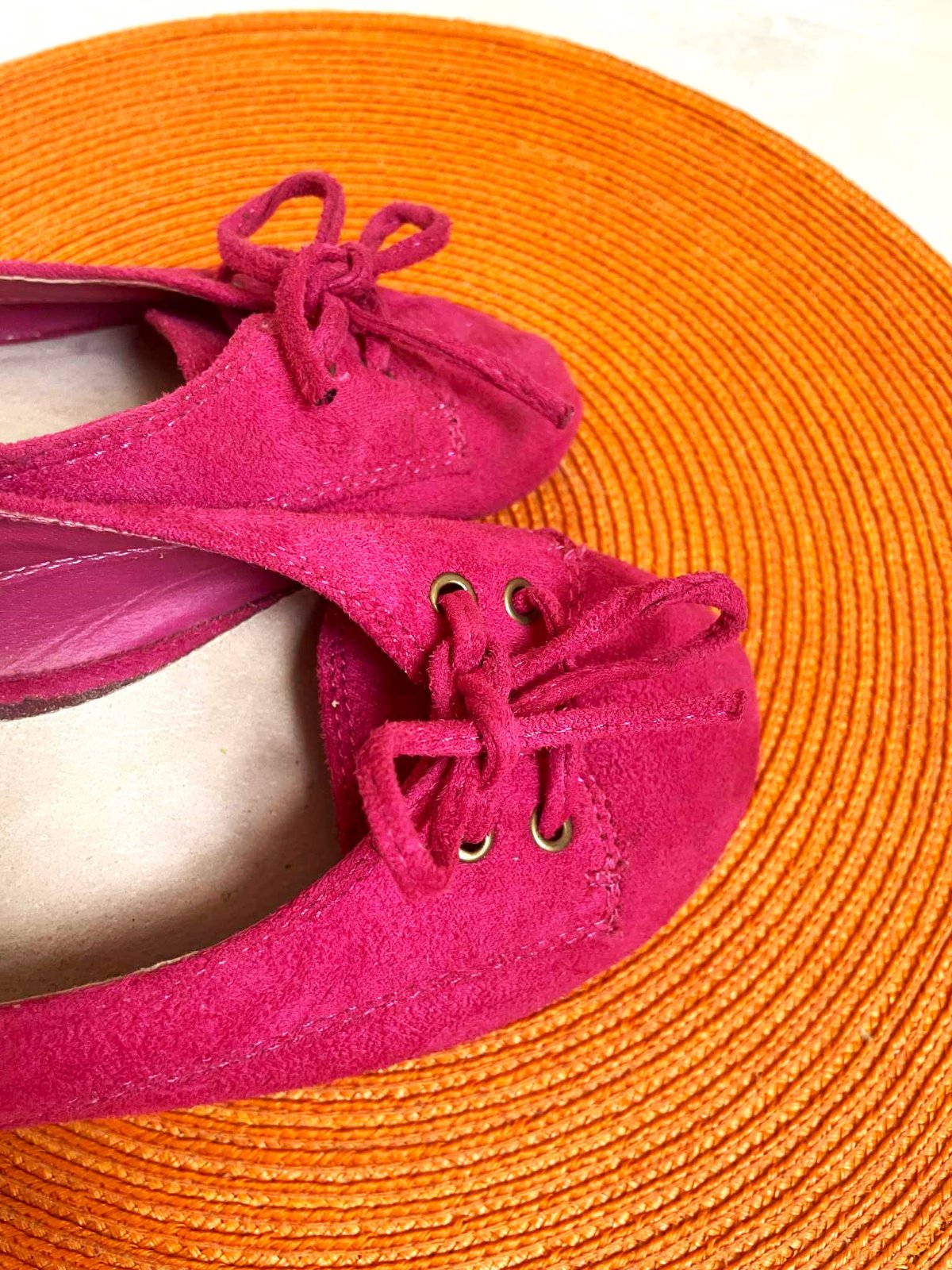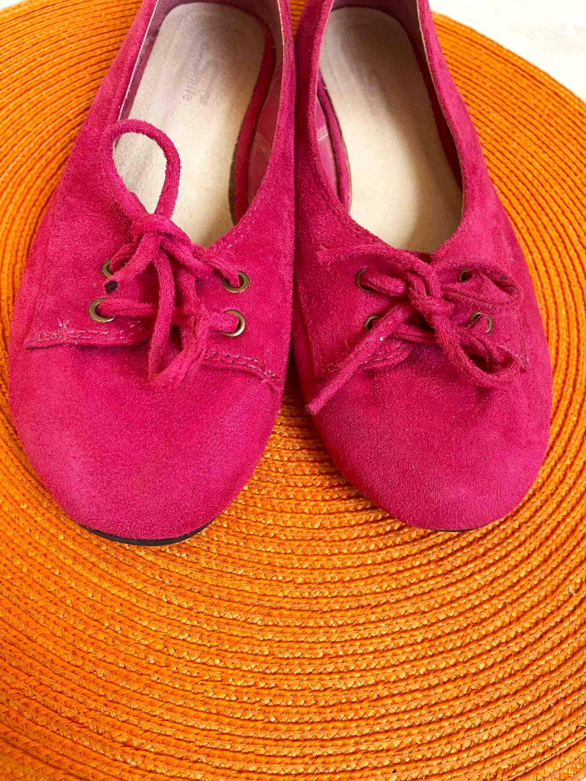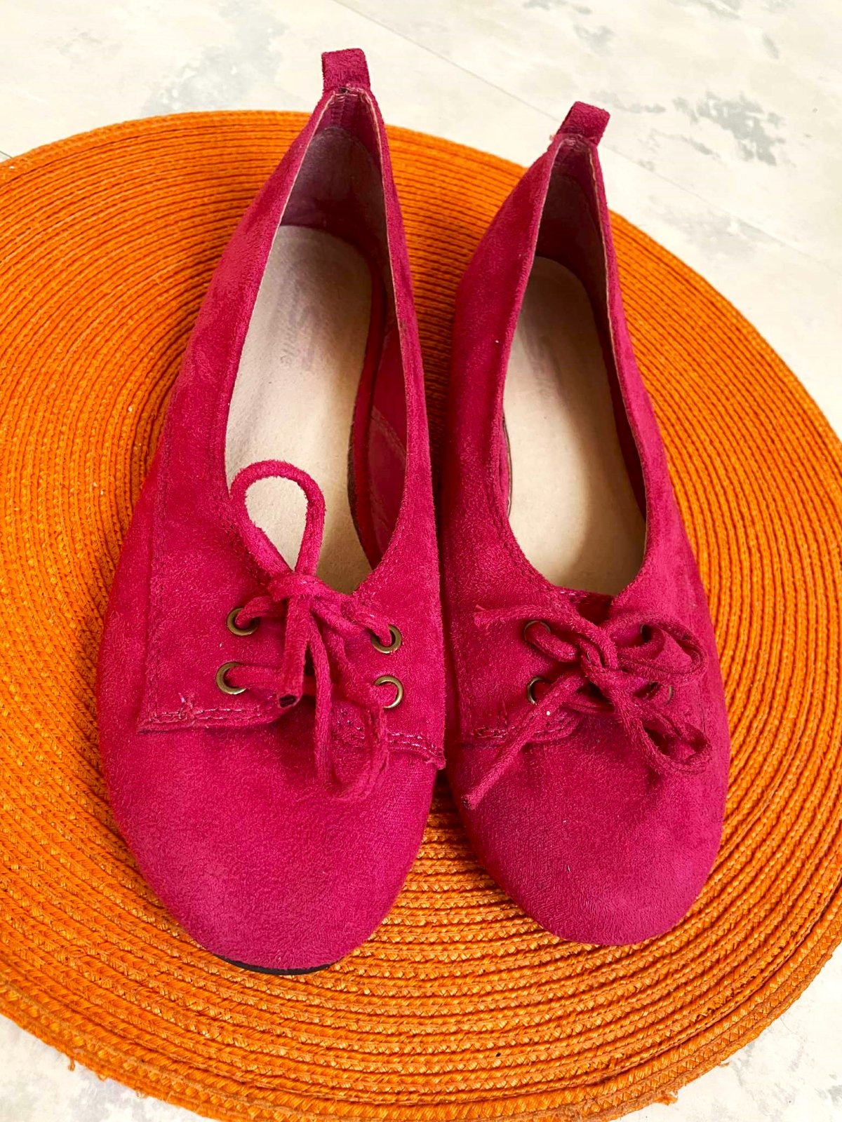 zaujímavé sýtoružové -cyklámenové balerínky,raz obuté,mäkkučké,výborne sa čistia - syntetický semiš