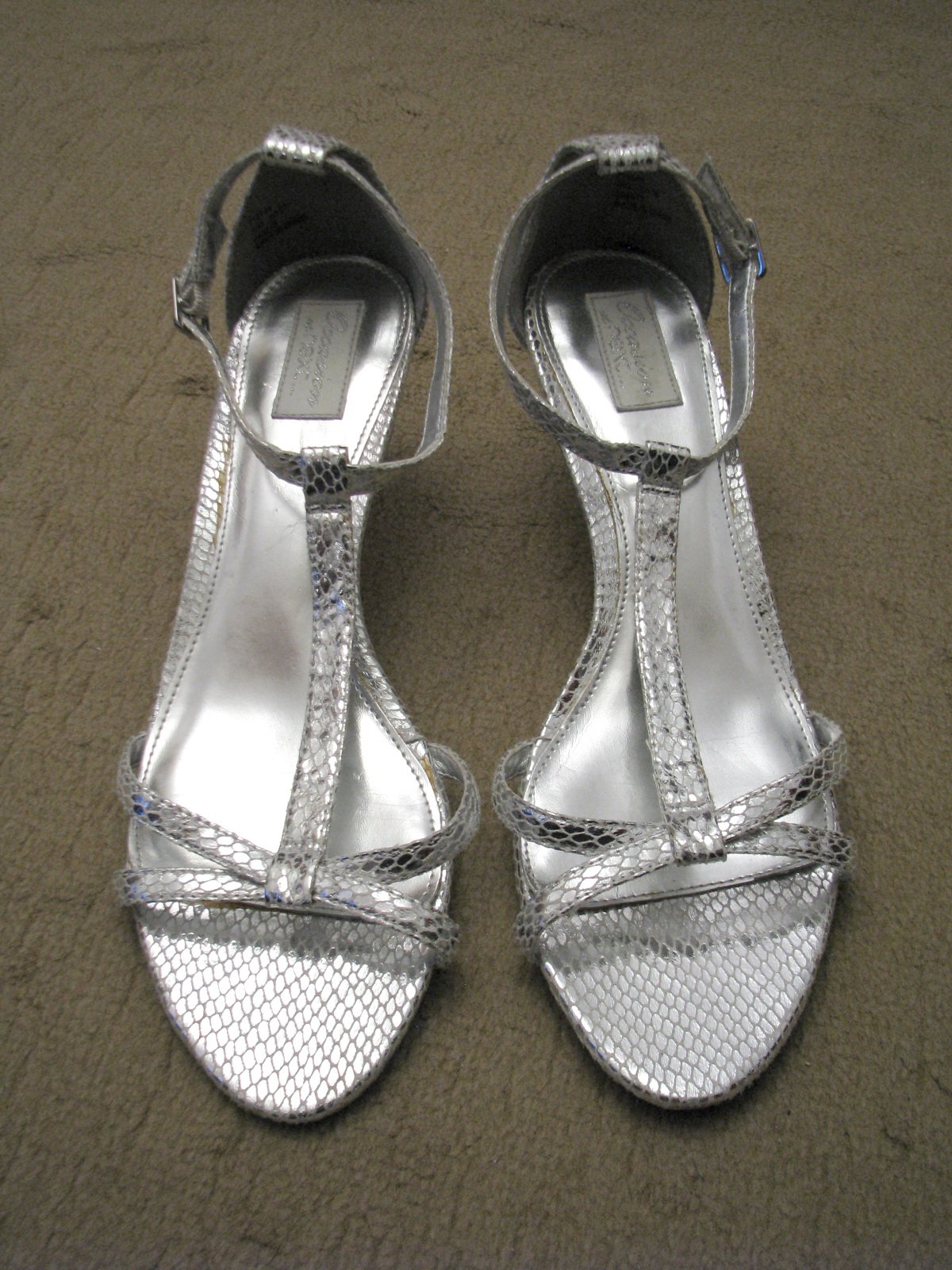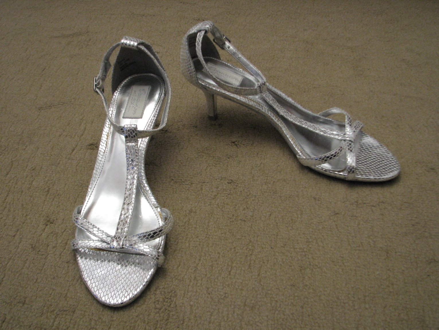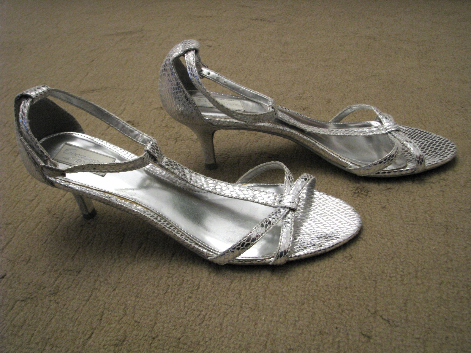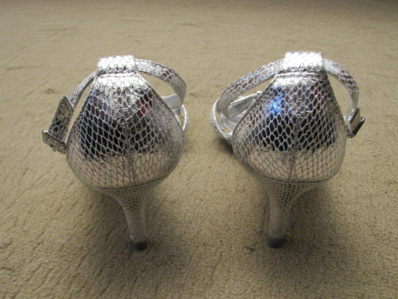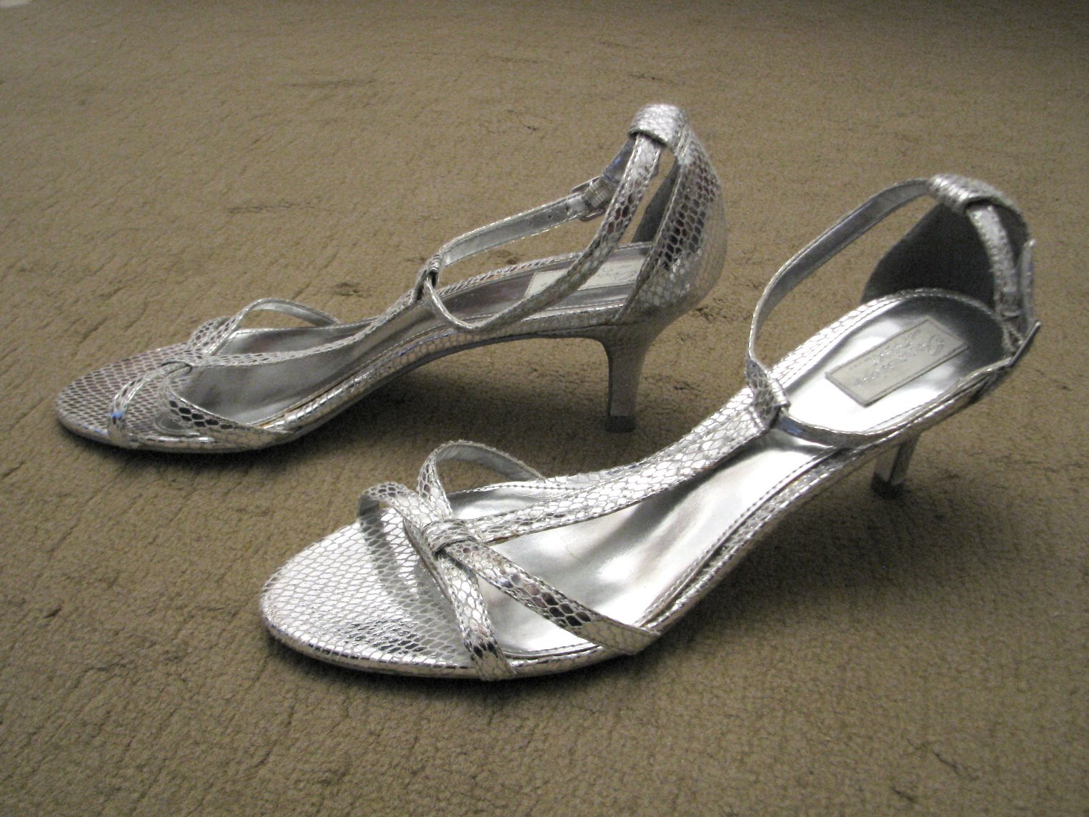 Krásne, elegantné strieborné sandále na pohodlnom nižšom podpätku, vhodné na slávnostnú príležitosť. Jemný "hadí" vzor, materiál je potlačený textil. Výborne zachovalé, bez poškodení. Veľkosť uvedená 41, sadnú aj na 42. V prípade záujmu premeriam.