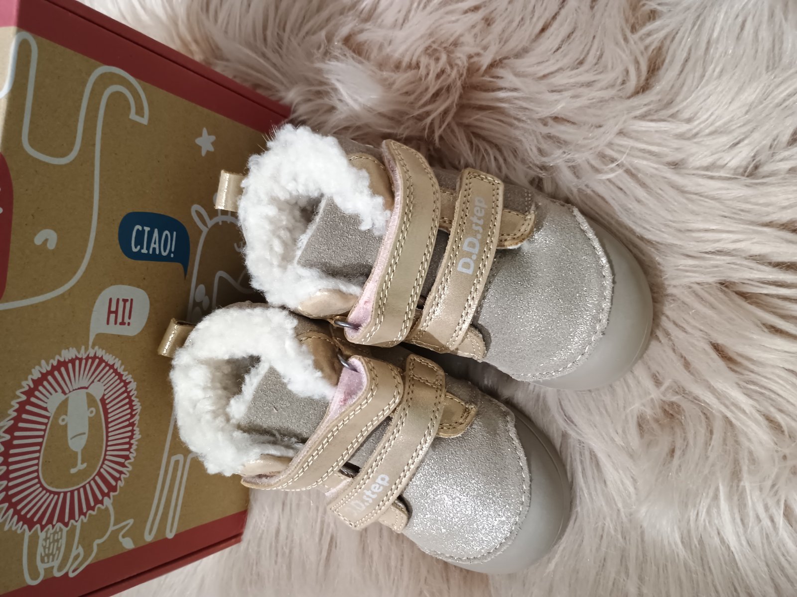 D.D.Step – zateplené kožené topánky pre malé princezné, ktoré milujú zimu, trblietky a rozprávkový štýl. Mäkké, ľahučké a ohybné, s gumovou protišmykovou podrážkou a dvojitým zapínaním na suchý zips. Sedia na normálne až širšie nôžky.