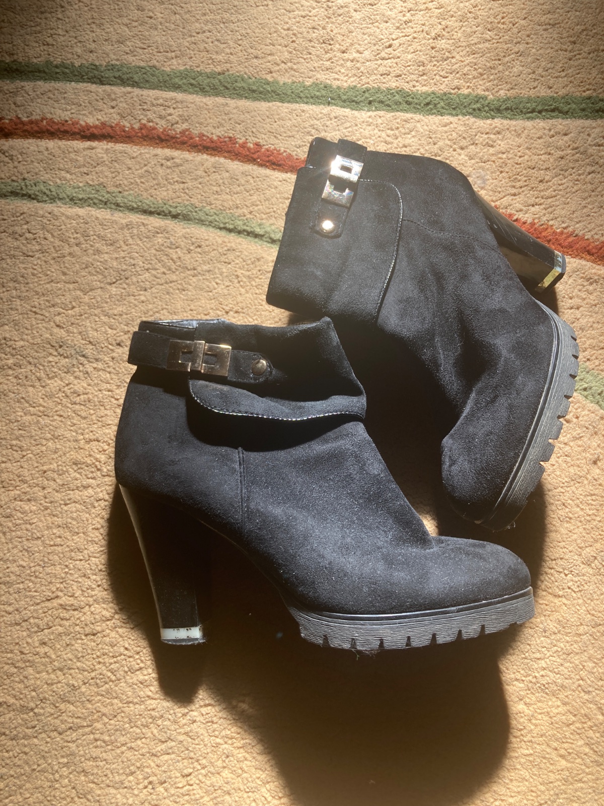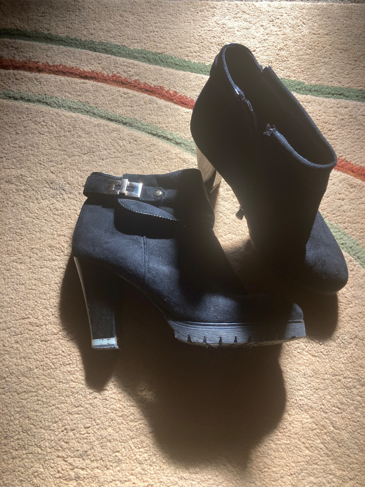 POnúkam krásne čierne čižmy na vysokom opätku. Opätok je vysoký 10 cm, farba krásna sýta čierna. Napriek vysokému opätku sú veľmi pohodlné. Sú takmer nenosené, obuté možno dvakrát do kostola.
